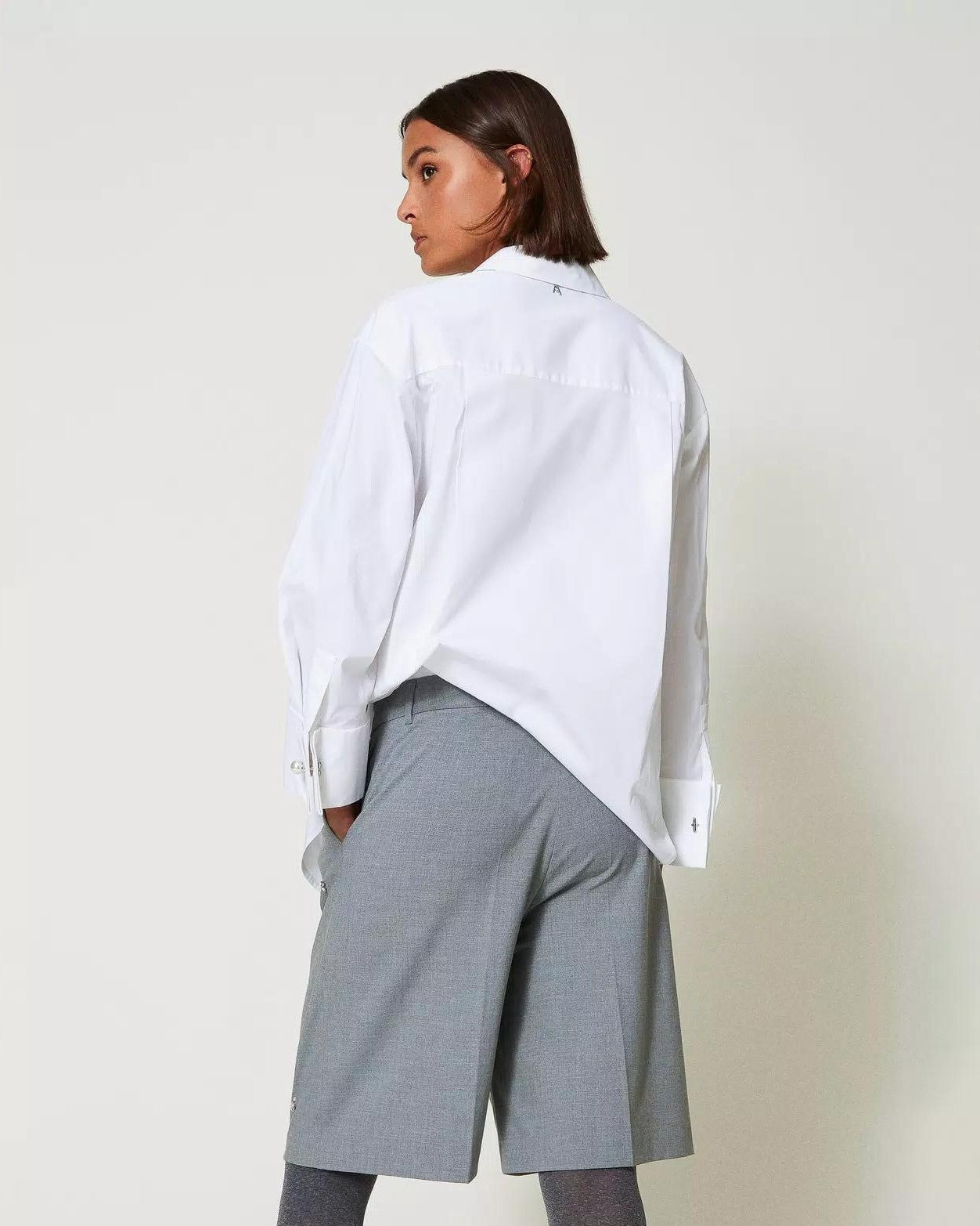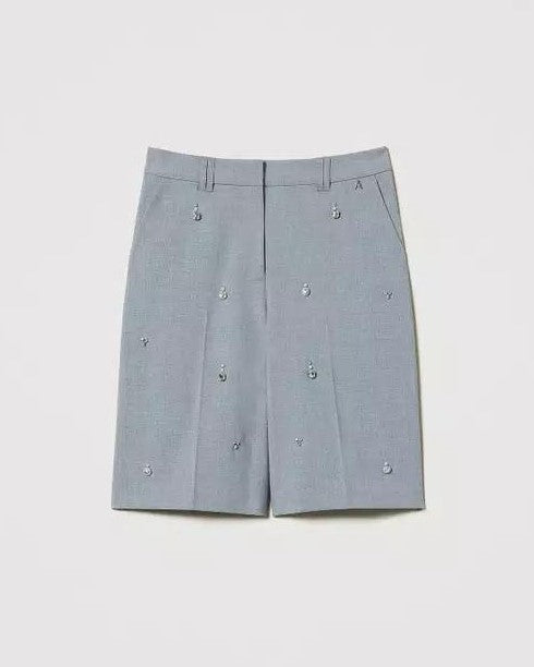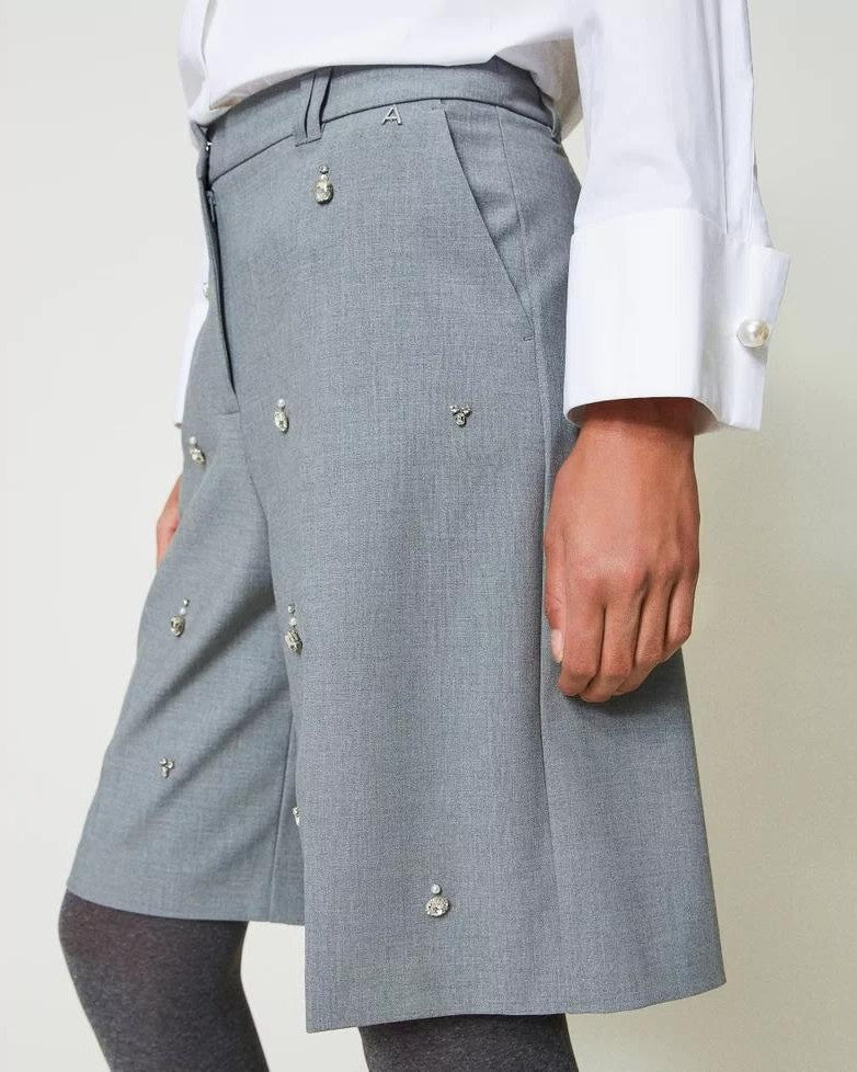 Shorts collezione Actitude in tessuto misto viscosa mano calda effetto flanella con ricami fatti a mano di castoni e perline. Hanno vita regular, chiusura con gancio e zip, tasche alla francese, piega stirata, linea dritta.