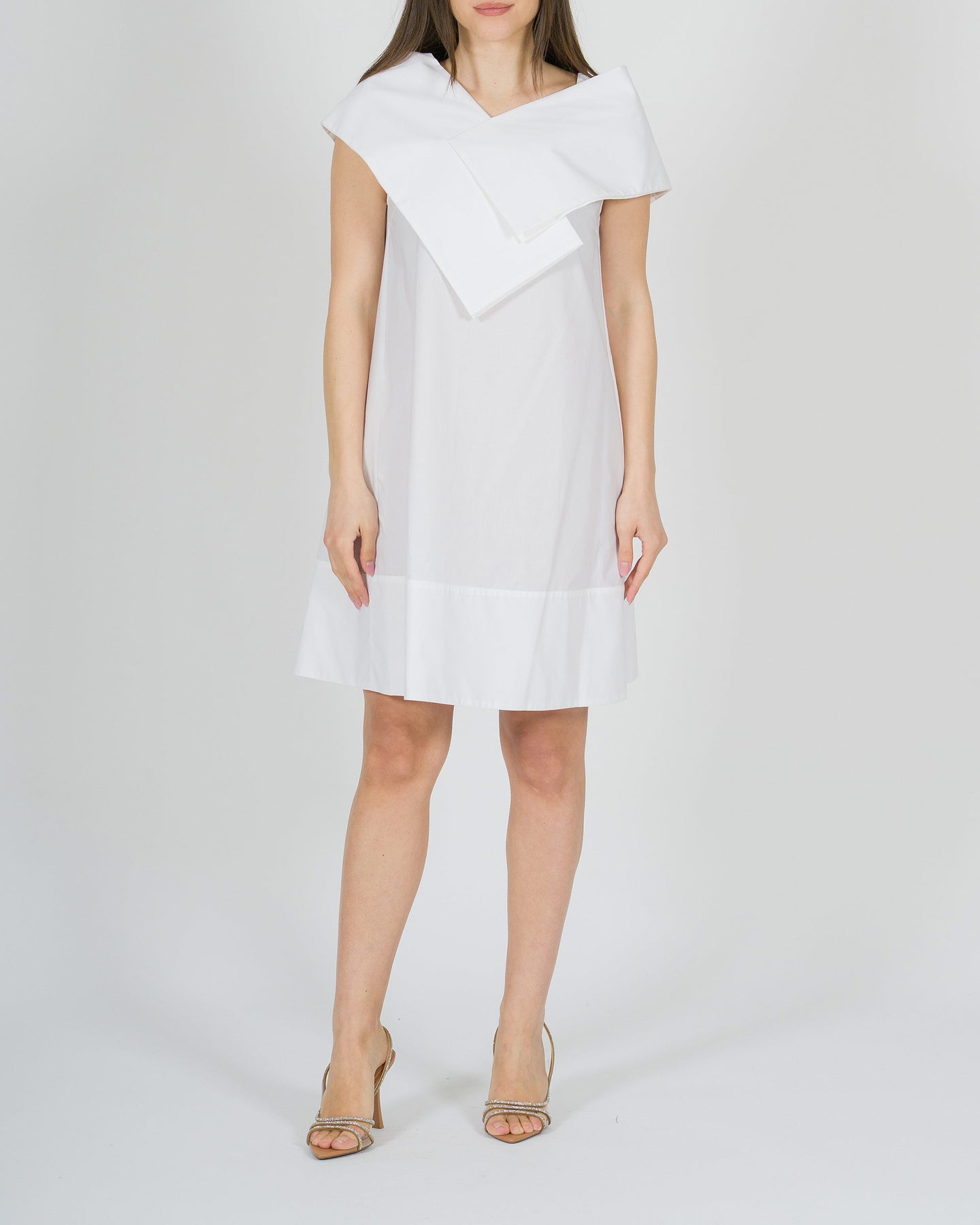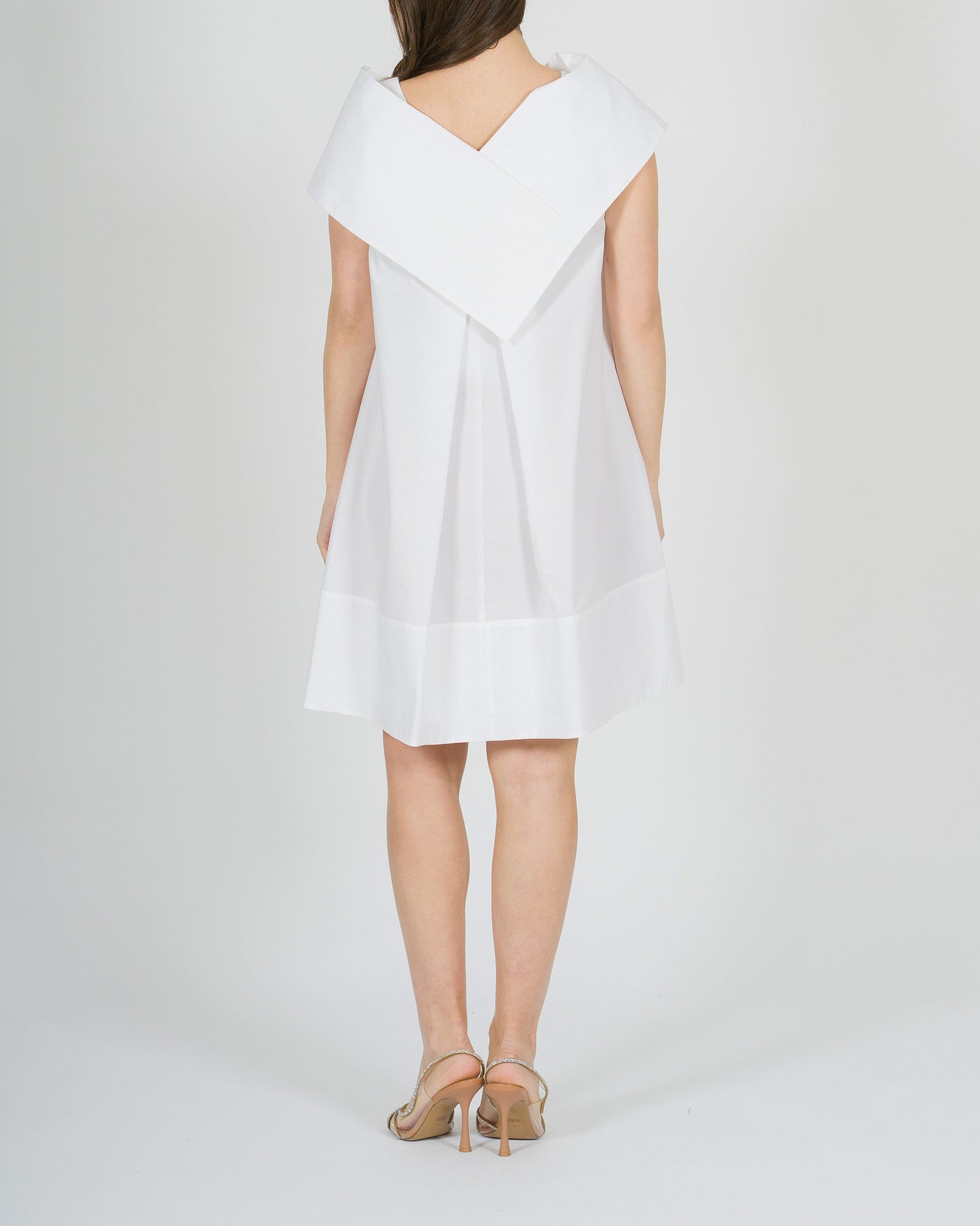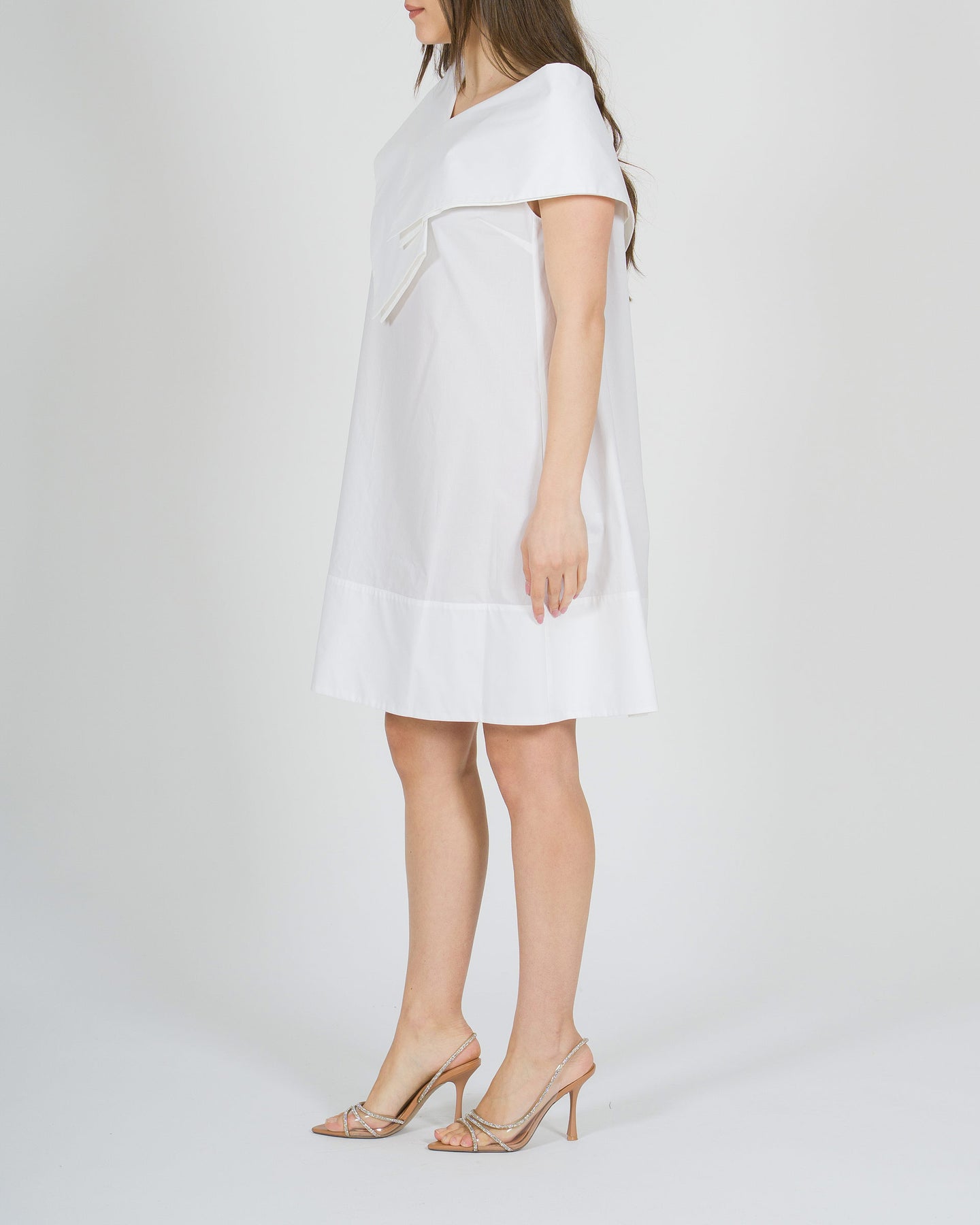 Fresco e sofisticato, l'abito Meimeij in popeline di cotone bianco si distingue per la sua linea a sacchetto, morbida e contemporanea. Lo scollo a V, presente sia sul davanti che sul retro, è valorizzato dal dettaglio del collo camicia, creando un equilibrio originale tra eleganza e modernità. Il tessuto leggero e traspirante garantisce comfort durante tutta la giornata, mentre la silhouette rilassata lo rende perfetto per look estivi raffinati e versatili. Ideale da indossare con semplicità, per uno stile pulito ma ricercato.