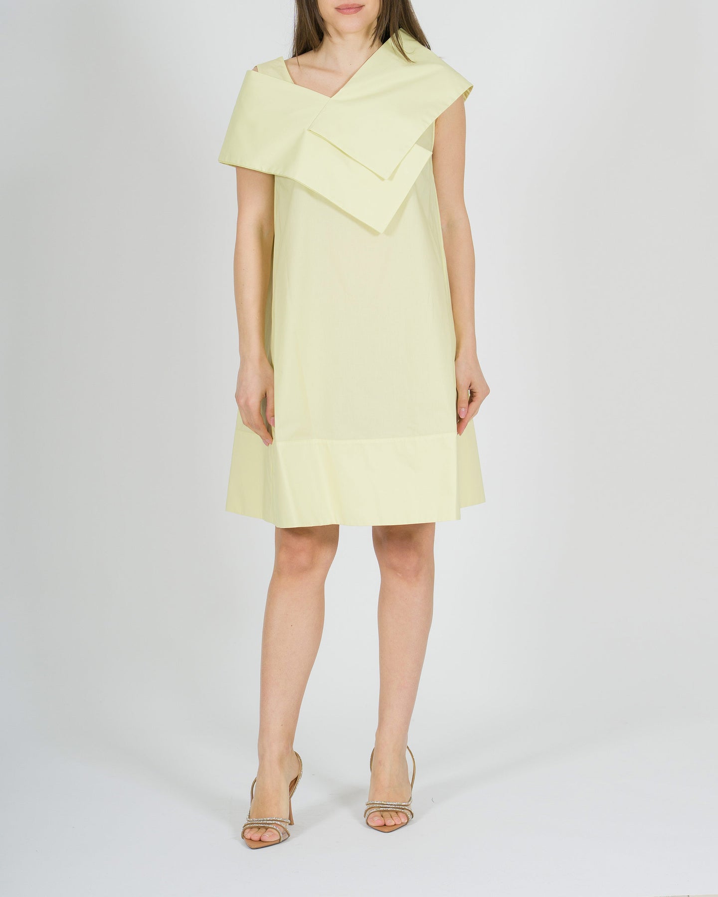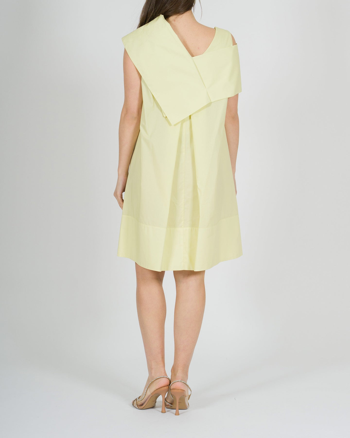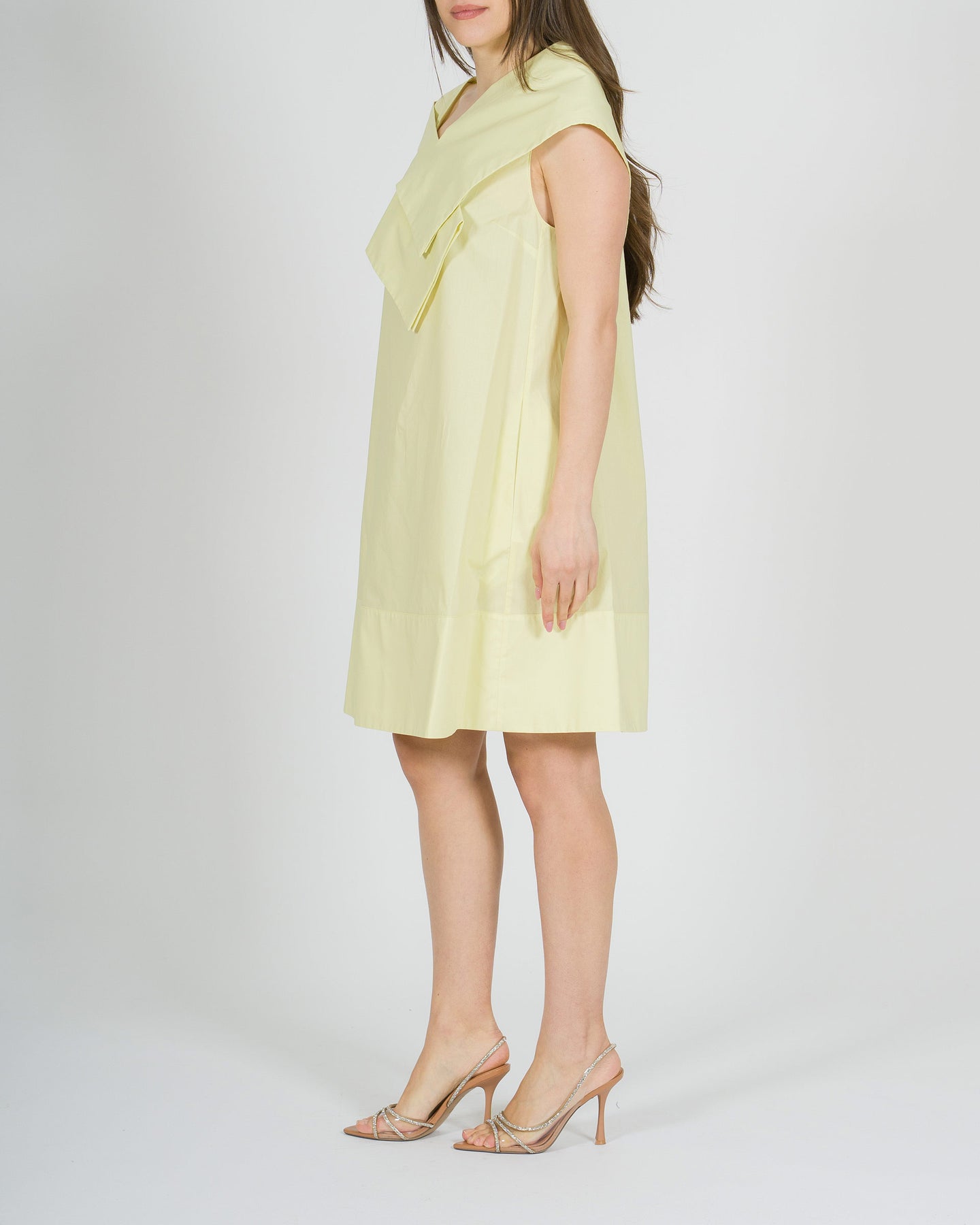 Fresco e sofisticato, l'abito Meimeij in popeline di cotone giallo paglierino si distingue per la sua linea a sacchetto, morbida e contemporanea. Lo scollo a V, presente sia sul davanti che sul retro, è valorizzato dal dettaglio del collo camicia, creando un equilibrio originale tra eleganza e modernità. Il tessuto leggero e traspirante garantisce comfort durante tutta la giornata, mentre la silhouette rilassata lo rende perfetto per look estivi raffinati e versatili. Ideale da indossare con semplicità, per uno stile pulito ma ricercato.