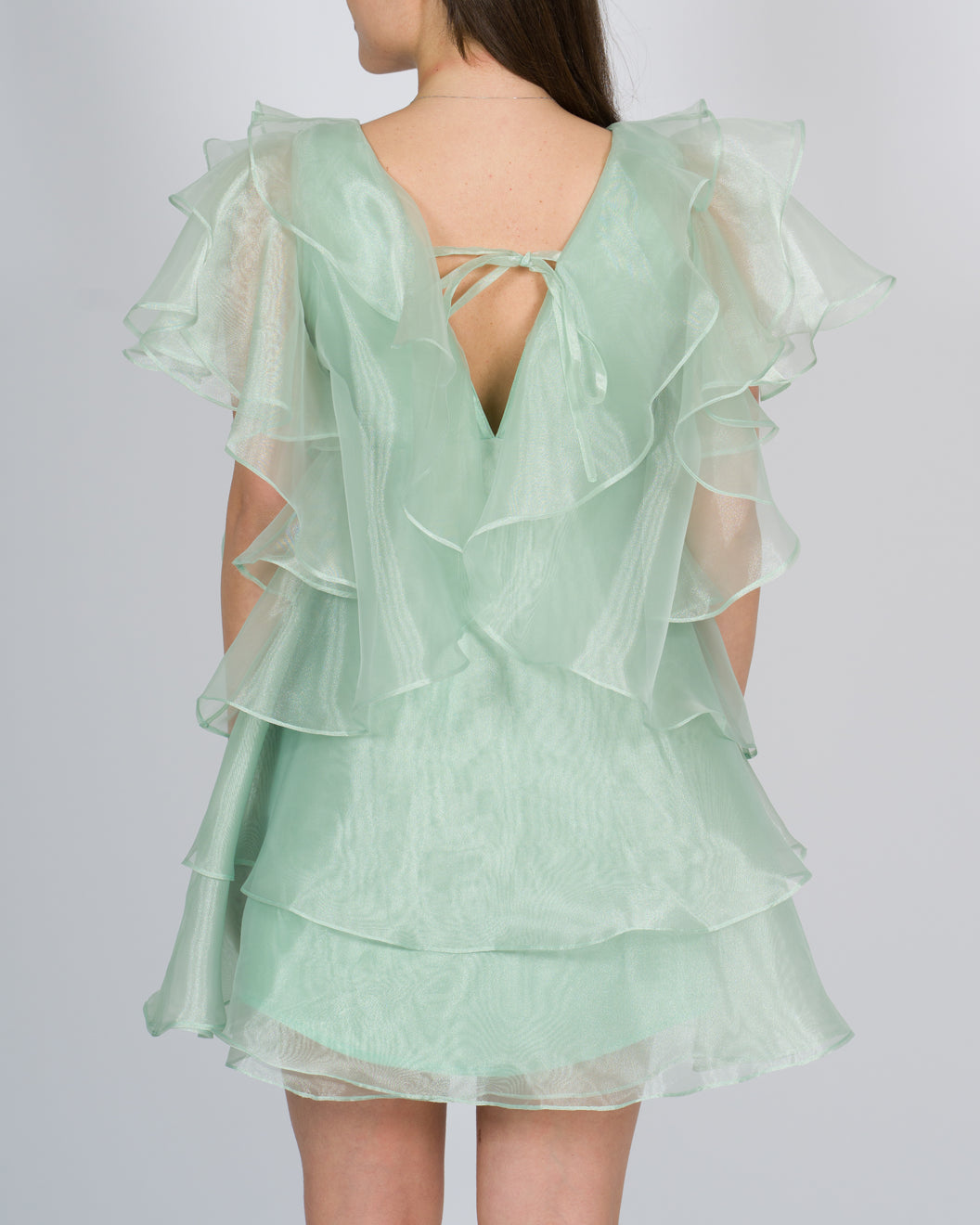-Cloud Mini Dress-Tessuto organza-Leggero effetto nuvola-Scollo a V-Chiusura con laccetto dietro-Fodera interna bianca-Prodotto Made in Italy-Composizione: 100% PES-La modella indossa la taglia S