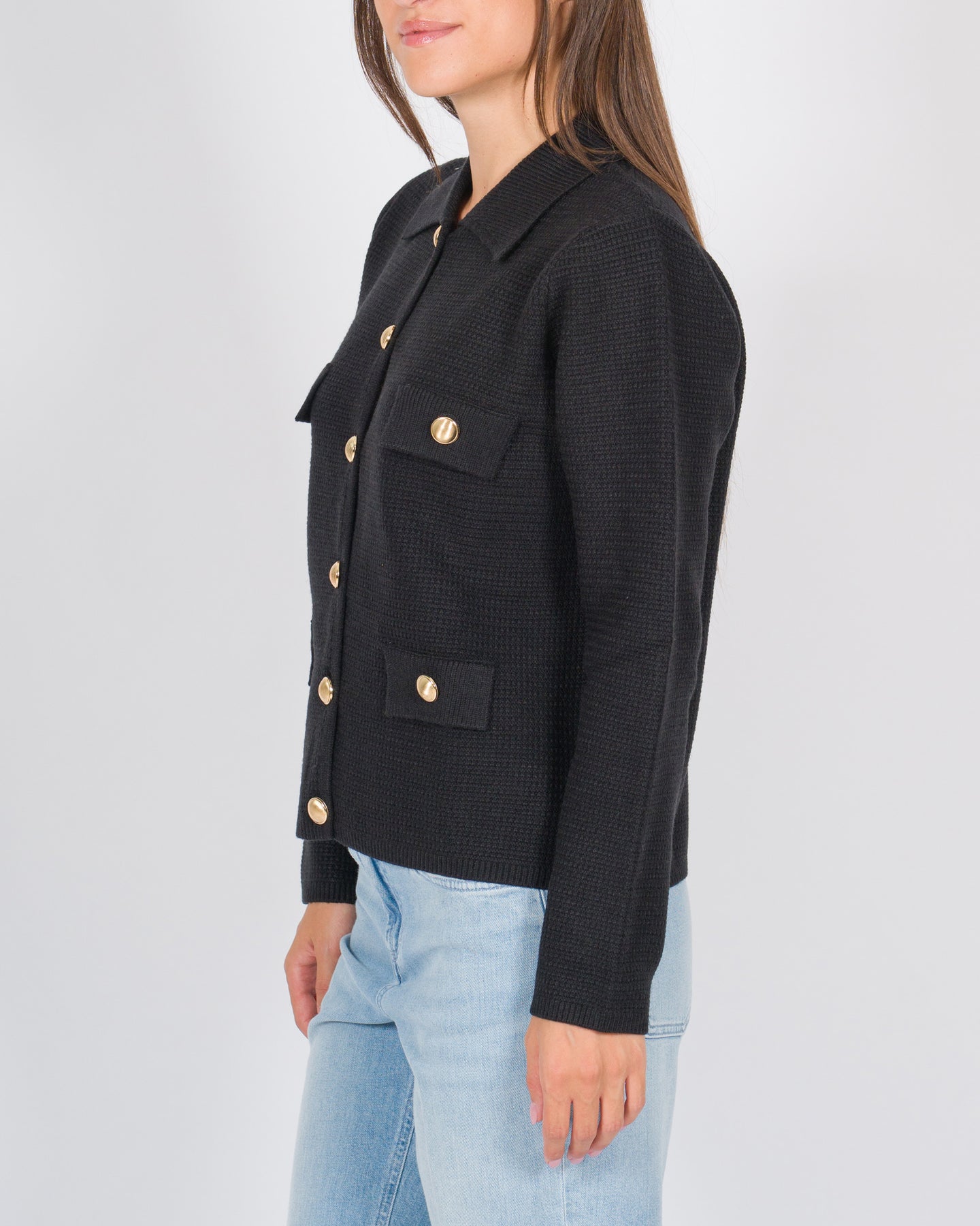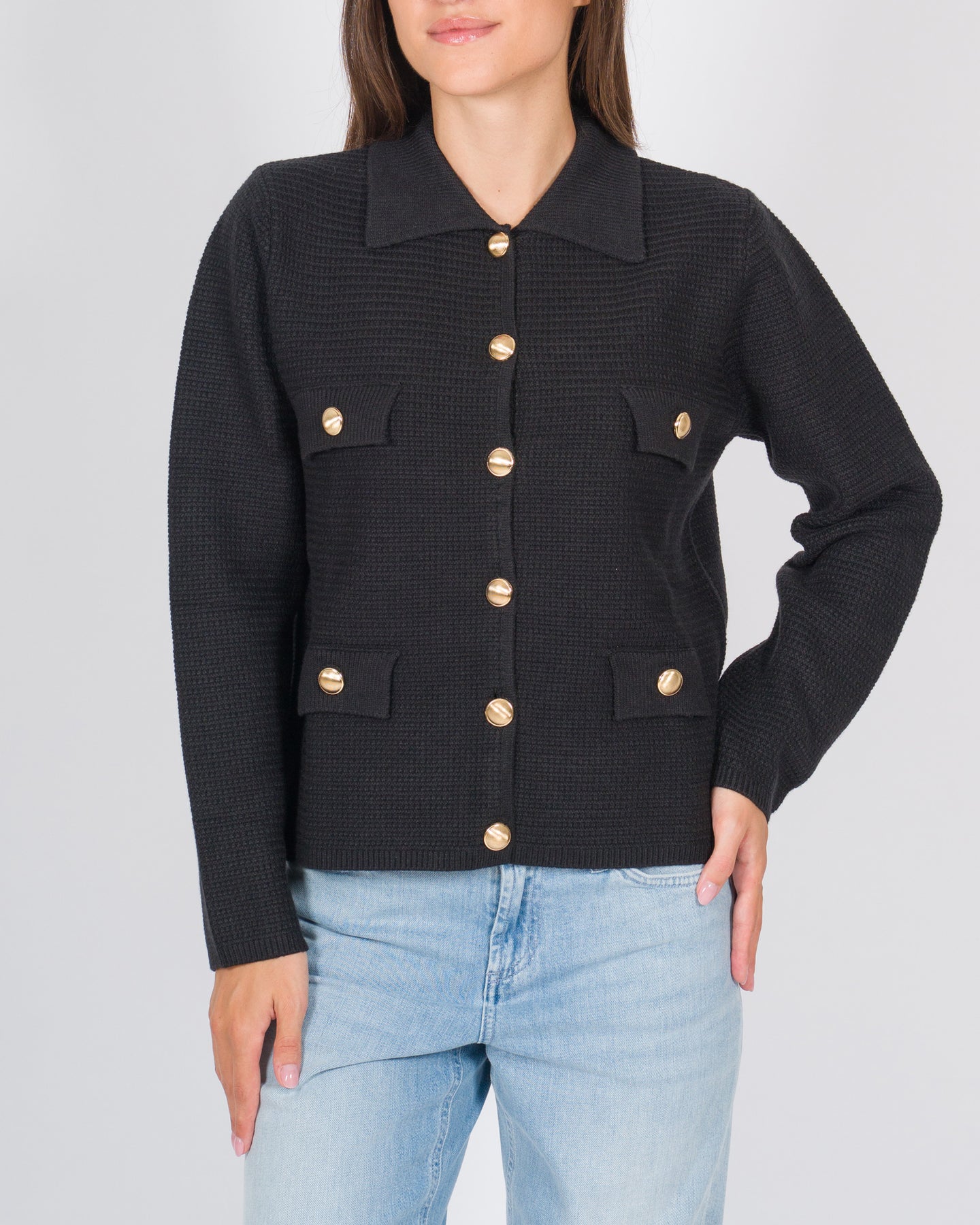 Questa giacchina in maglia di lana si distingue per la sua lavorazione a punto pannocchia, che regala tridimensionalità e raffinatezza al capo. Il design è completato da un collo a camicia e da una chiusura frontale con bottoni dorati, dettaglio che aggiunge luminosità e un tocco sofisticato. Le finte tasche applicate sottolineano la linea pulita, mentre la vestibilità aggiornata e le maniche lunghe la rendono una scelta versatile, ideale da abbinare sia a look casual chic che a completi più eleganti.