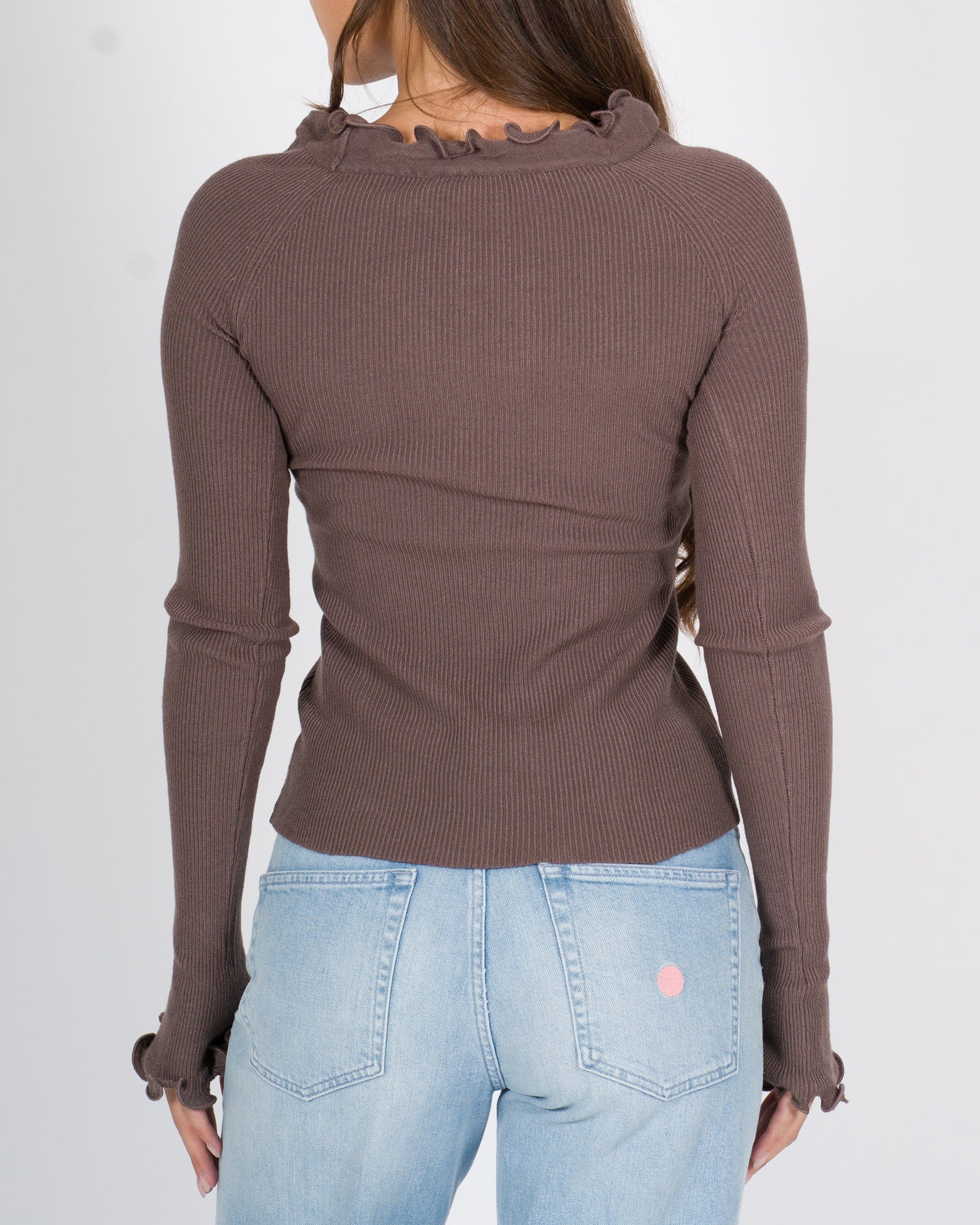 Pulito nelle linee ma ricco nei dettagli, questo pullover manica lunga in viscosa si distingue per la sua lavorazione a costine che dona struttura e dinamicità al capo.I profili del collo e dei polsini sono impreziositi da un delicato bordo smerlato, che aggiunge un tocco femminile e raffinato alla maglia, senza rinunciare alla sobrietà.Dettagli tecnici:Collo smerlatoPolsini smerlatiVestibilità: slim fitTessuto: viscosaLavorazione a costineColore: cacaoLa modella indossa la taglia S/M ed è alta 1.70.
