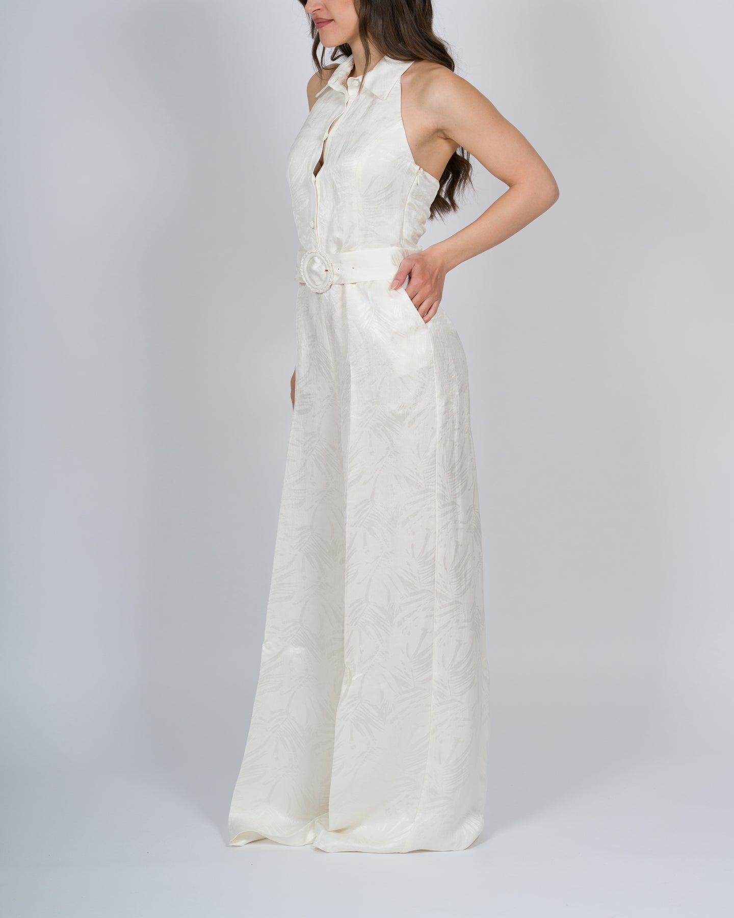 Tuta lunga in raso jacquard a disegno palme, fantasia esclusiva Twinset. Ha scollatura halter con colletto a camicia, chiusura con bottoni ricoperti e zip, tasche ai fianchi, cintura rimovibile con fibbia ricoperta in coordinato, placchetta logo Oval T sul retro, linea morbida. Perfetta per party e cerimonie.
