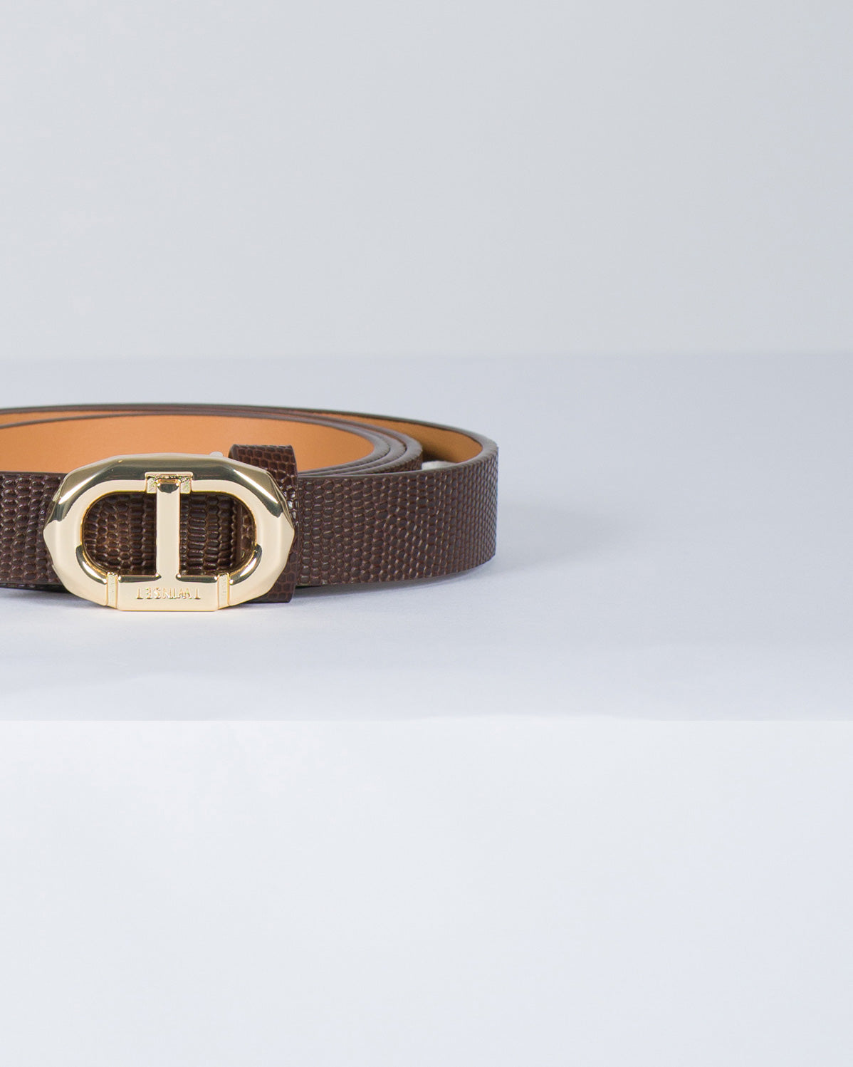Cintura sottile a vita bassa in pelle con fibbia Oval T sfaccettata in galvanica oro chiaro.-Altezza 2 cm100% pelle bovina. -Materiale 2: 100% poliuretano