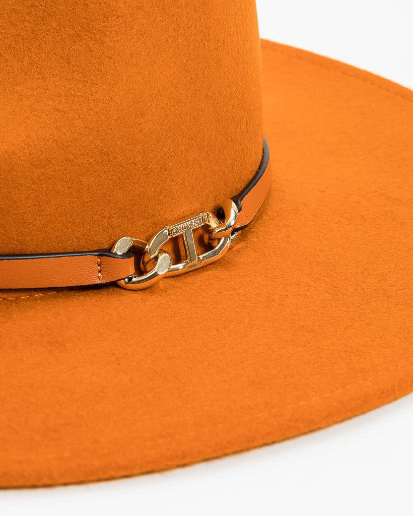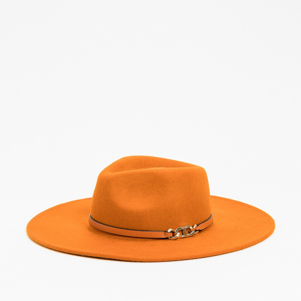 Cappello in lana color rancio bruciato, placca oro, corona a diamante e tesa piatta.