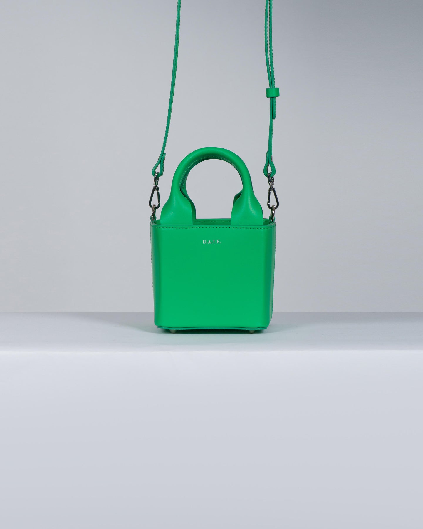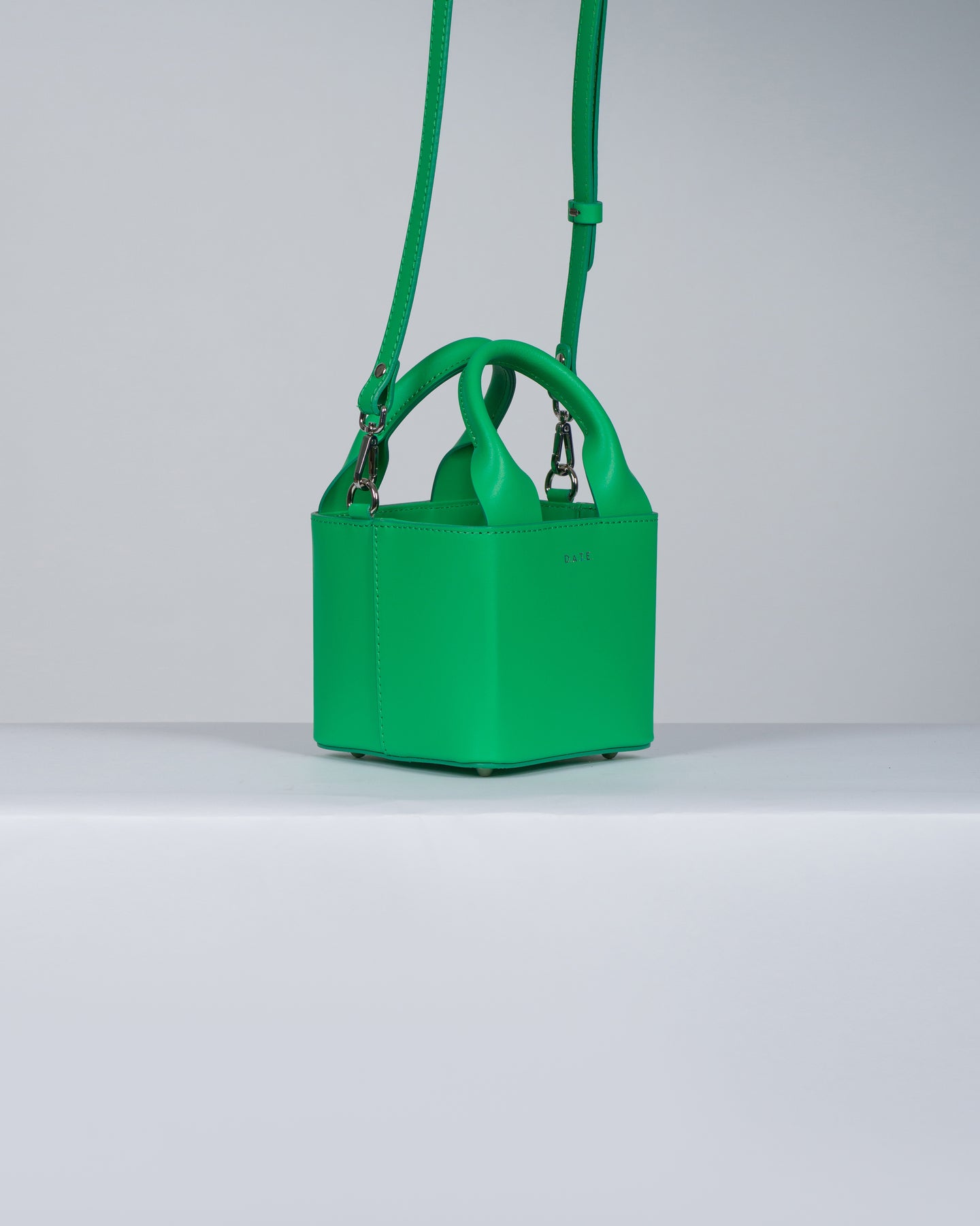 Borsa a mano di manifattura italiana realizzata in morbida pelle liscia di colore verde.-Tinta unita con impunture in tono.-Due manici superiori semirigidi.-Logo D.A.T.E. stampato in colore argento sul fronte.-Fodera interna in nylon con coulisse di chiusura.-Piedini in metallo color argento sul fondo per evitare l'usura.-Tracolla regolabile e removibile tramite moschettoni applicati di lato in metallo colore argento.-Tasca piatta all'interno.-Misure: 15x15x15 cm