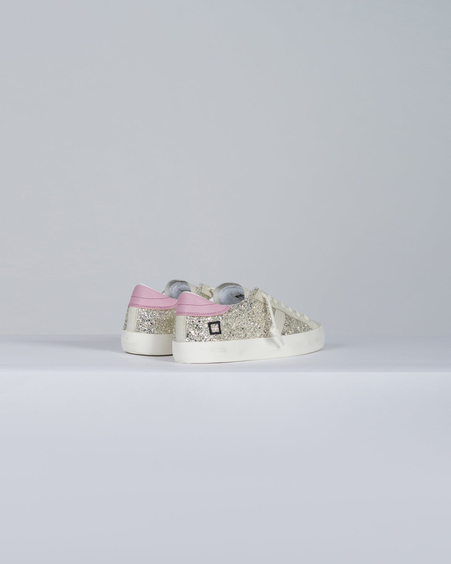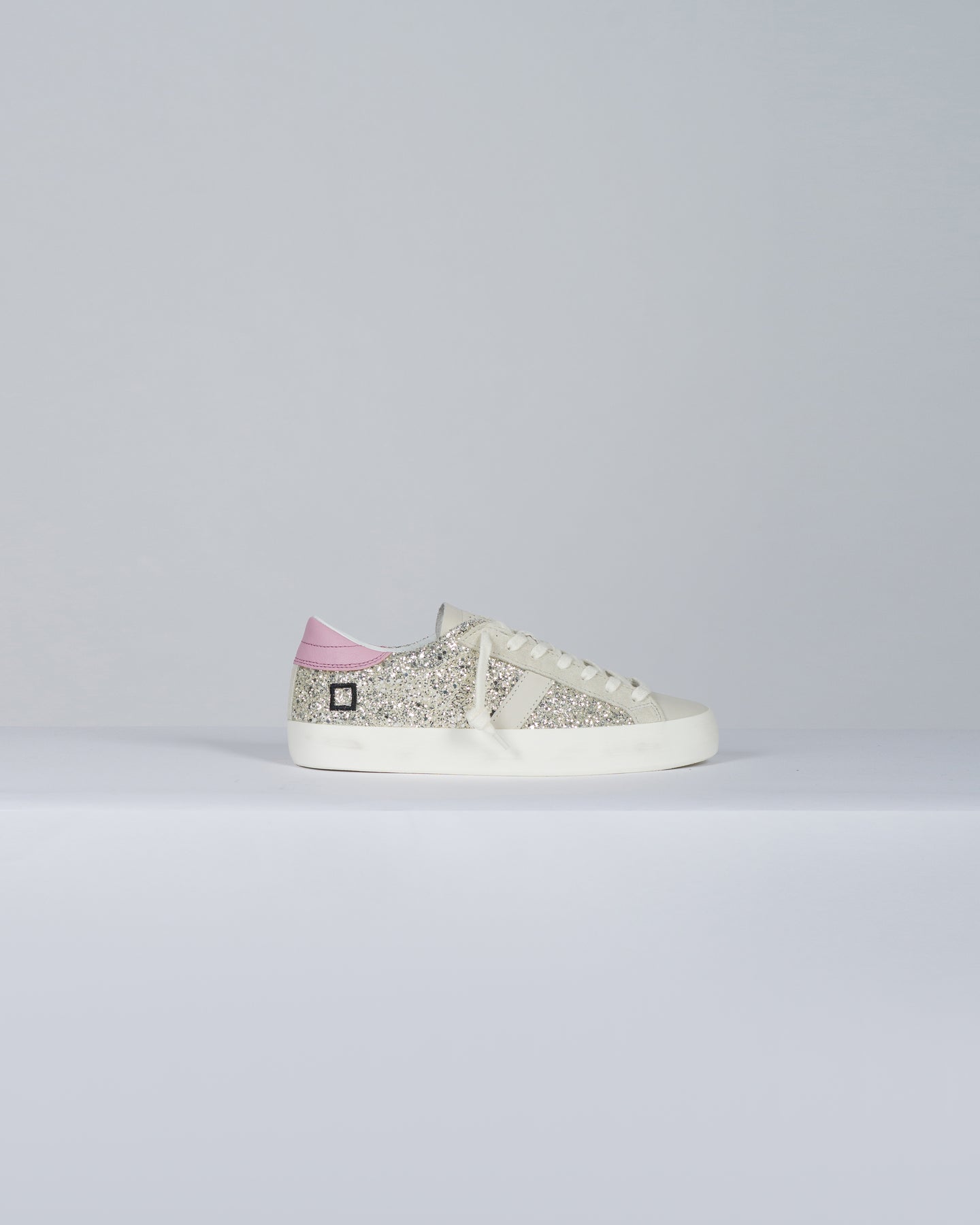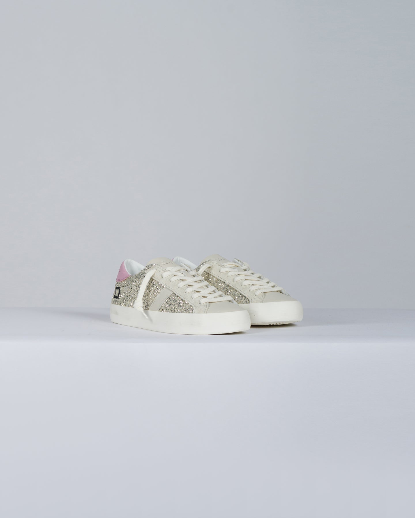 Sneakers bassa in glitter platino e pelle beige.-Linguetta in pelle con logo D.A.T.E. impresso.-Dettagli in suede colore beige.-Lacci in cotone.-Il logo quadrato D.A.T.E. è ricamato lateralmente.-Banda laterale in pelle colore beige.-Talloncino posteriore in pelle colore rosa.-Fodera in pelle e spugna di cotone.-Soletta interna rialzata di 2 cm per un miglior comfort.-La suola in gomma, con leggero effetto used, è alta 3 cm.-Tutti i materiali selezionati sono Made in Italy.-Vestibilità: REGULAR