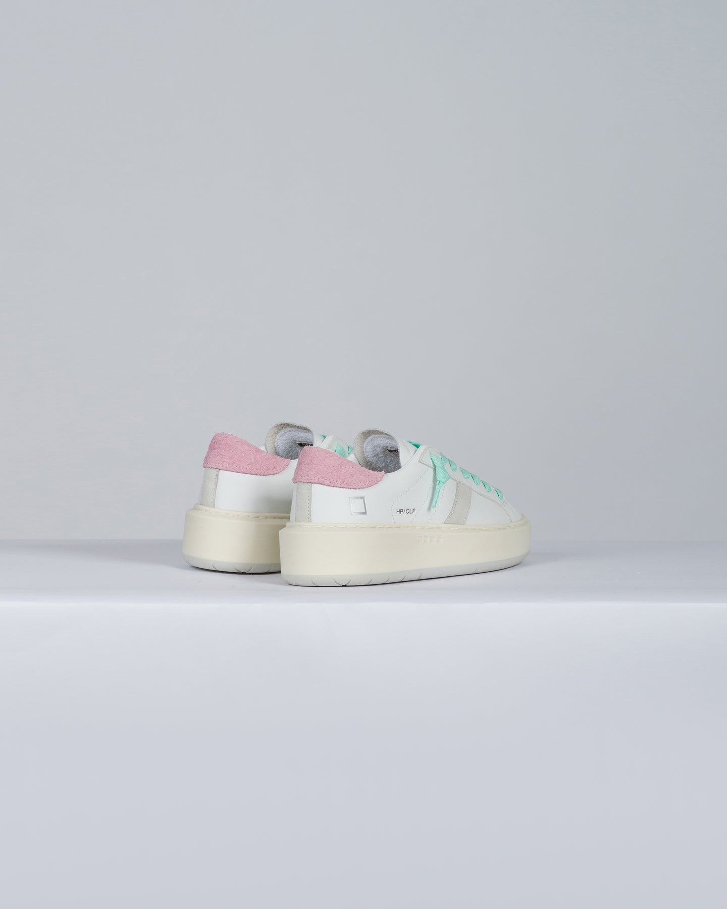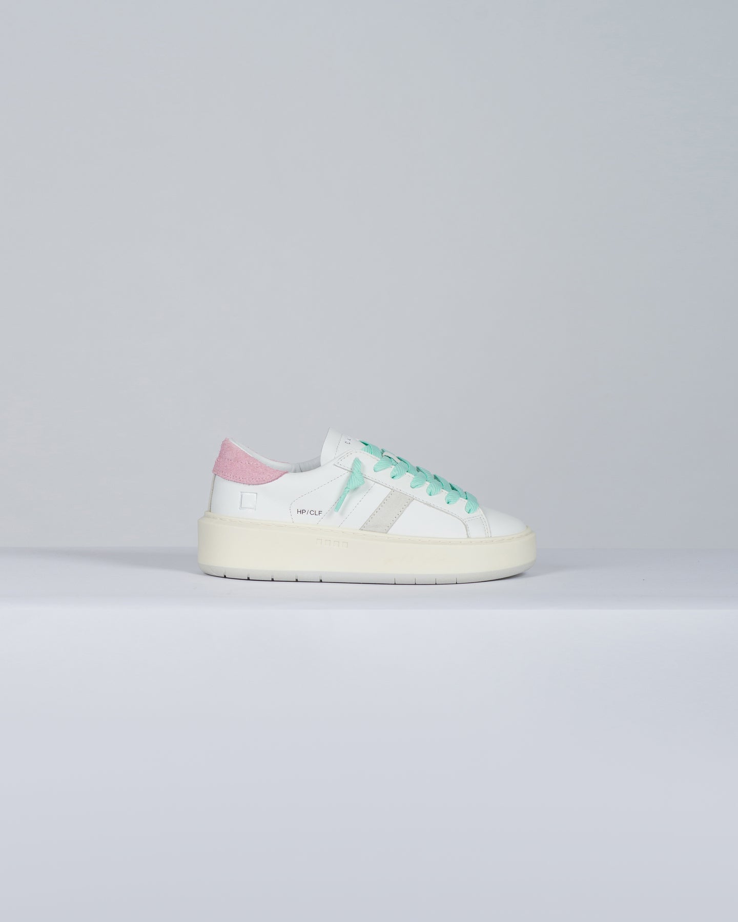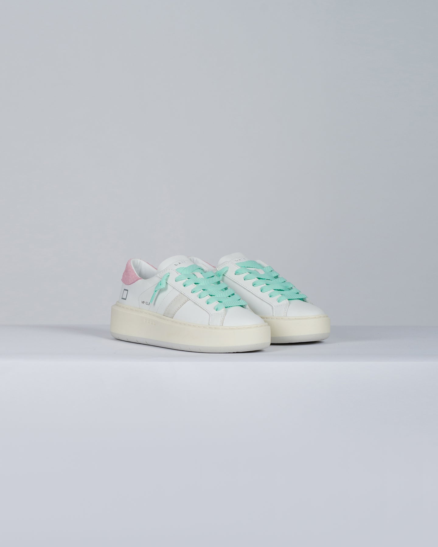 Sneakers bassa in pelle bianca con suola platform.-Linguetta in pelle con logo D.A.T.E. impresso.-Lacci colore verde acqua.-Il logo quadrato e il nome del modello sono impressi lateralmente.-Banda laterale in suede grigio chiaro.-Talloncino posteriore in suede rosa.-Fodera in pelle e spugna di cotone.-Soletta interna rialzata di 2 cm per un miglior comfort.-La suola in gomma platform è cucita e alta 4 - 5 cm.-Tutti i materiali selezionati sono Made in Italy.-Vestibilità: REGULAR