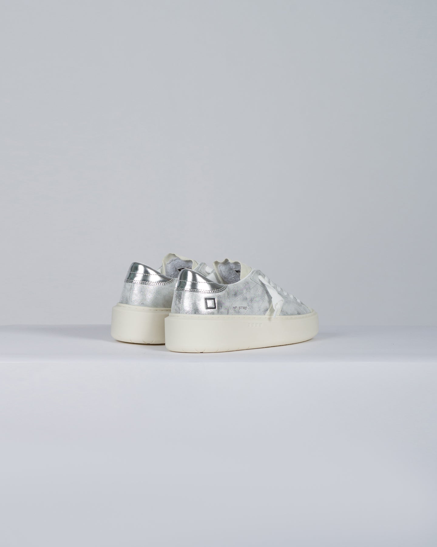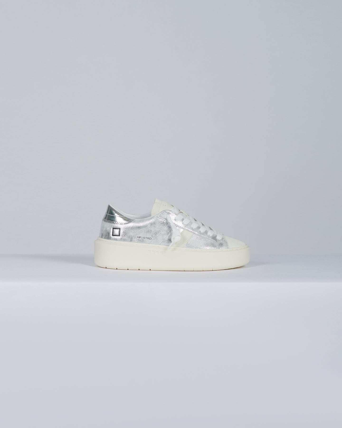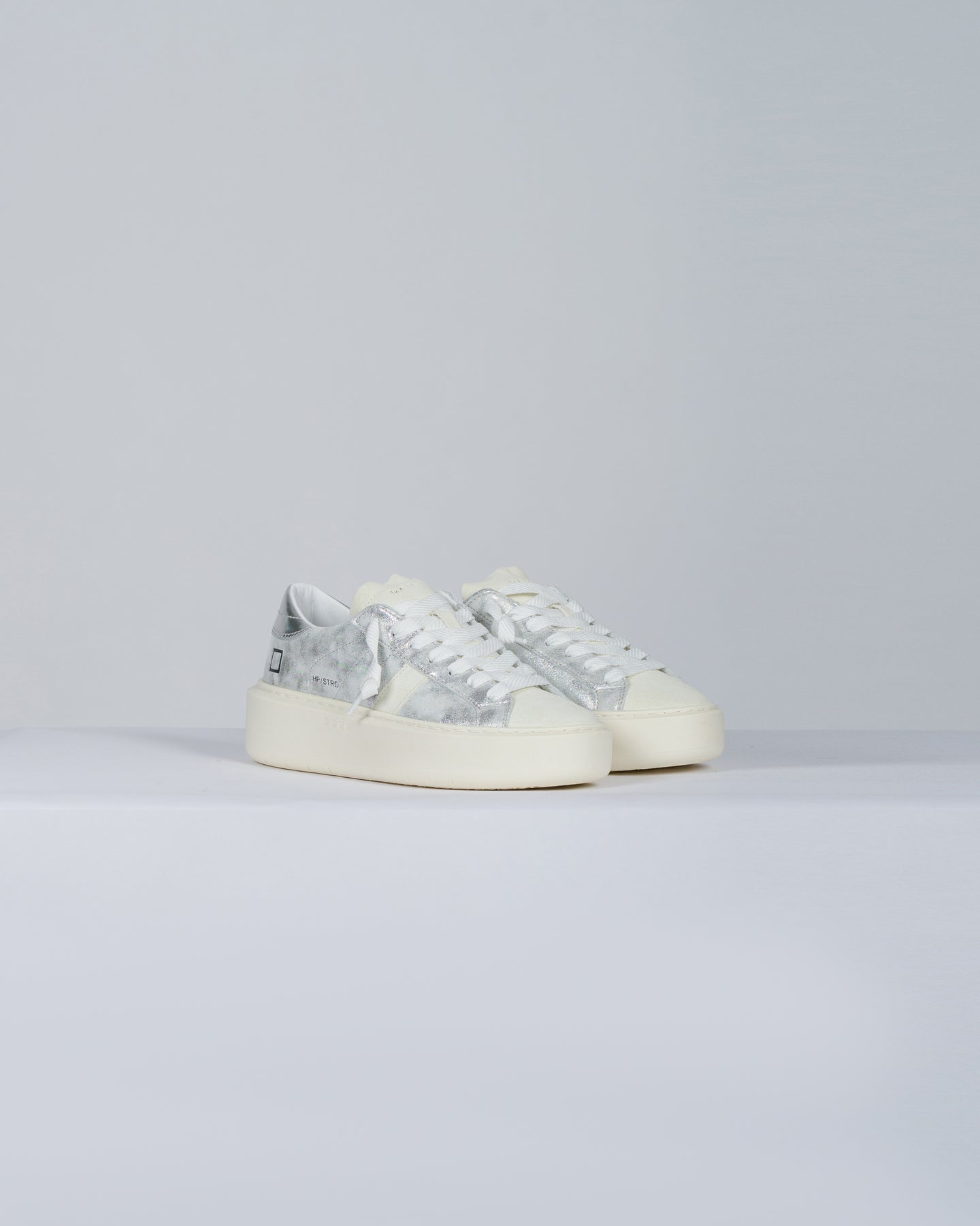 Sneakers bassa in pelle laminata argento e suede bianco con suola platform.-Linguetta in suede con logo D.A.T.E. impresso.-Lacci in cotone.-Il logo quadrato e il nome del modello sono impressi lateralmente.-Banda laterale in suede bianco.-Talloncino posteriore in pelle argento.-Fodera in pelle e spugna di cotone.-Soletta interna rialzata di 2 cm per un miglior comfort.-La suola in gomma platform è cucita e alta 4 - 5 cm.-Tutti i materiali selezionati sono Made in Italy.-Vestibilità: REGULAR
