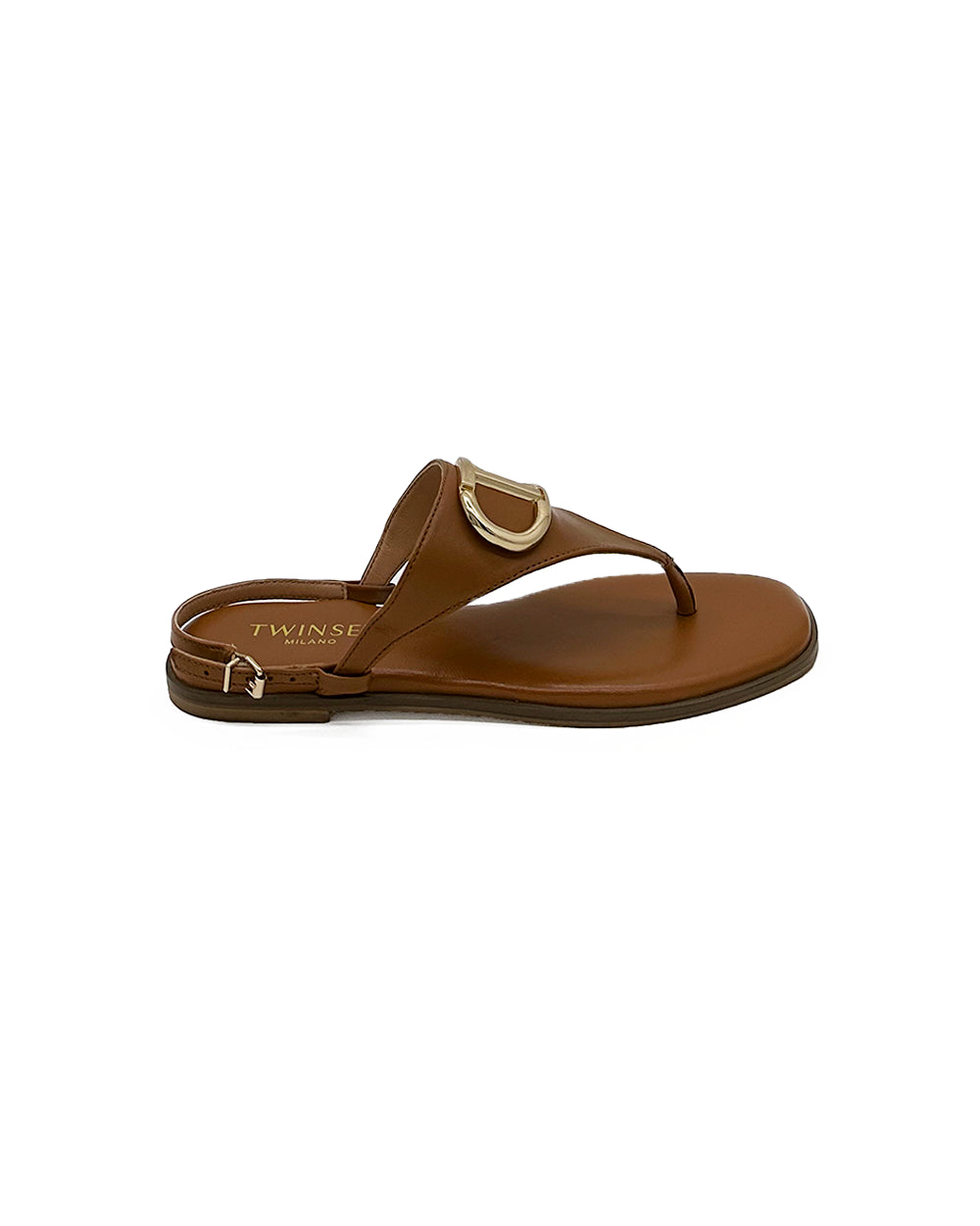 Sandalo in pelle colore cuoio, con logo oval T oro e chiusura con cinturino e fibbia.