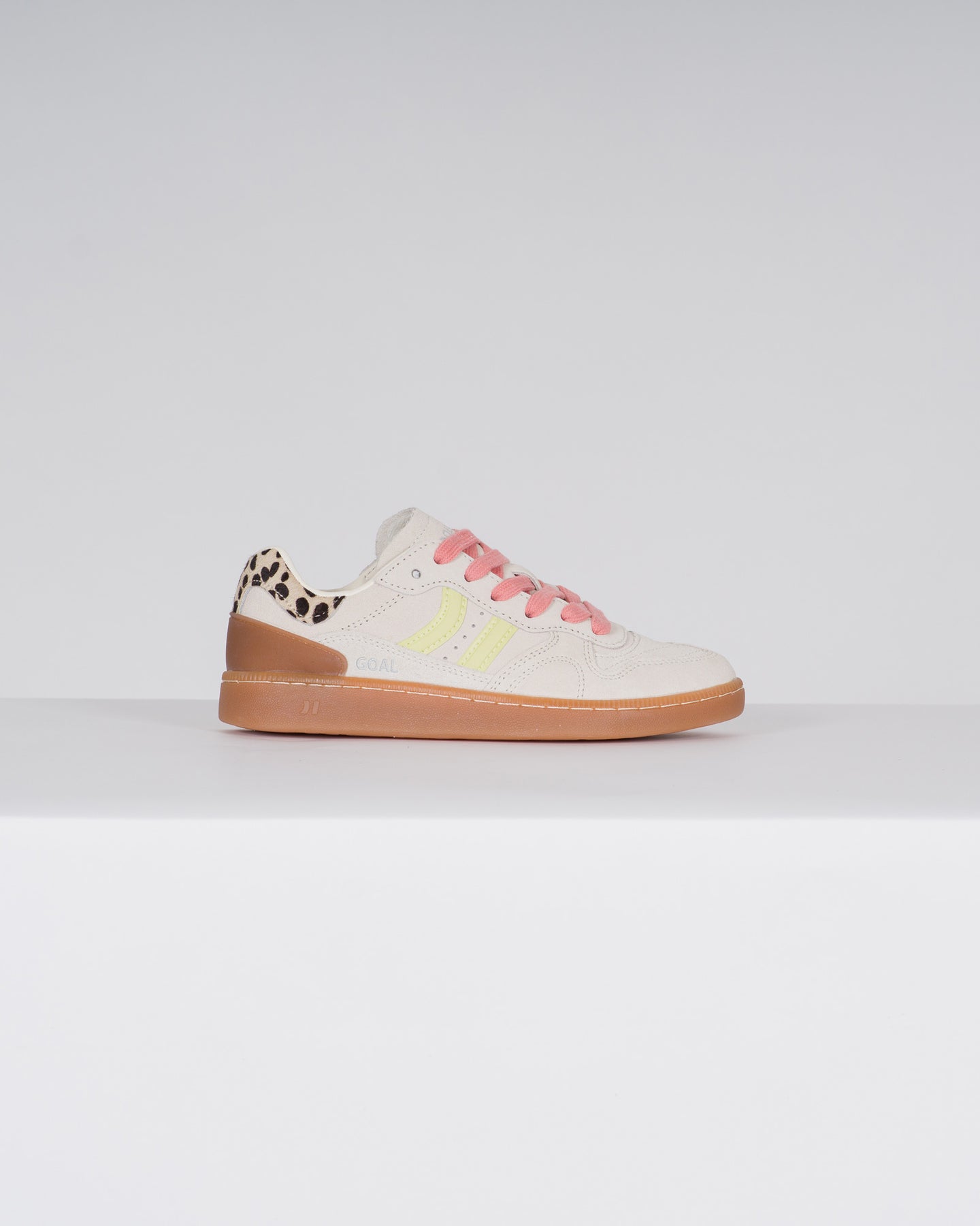 Scarpa sportiva in pelle scamosciata con dettagli a contrasto. Linguetta in pelle preformata con imbottitura sagomata. Vista della fodera in pelle. Lacci piatti intercambiabili in cotone bicolore. Colletto leggermente imbottito. La parte anteriore presenta un rinforzo con cuciture. Suola flessibile in gomma/gomma che garantisce resistenza e aderenza. Presenta il nome del modello "GOAL" sul lato in oro antico.