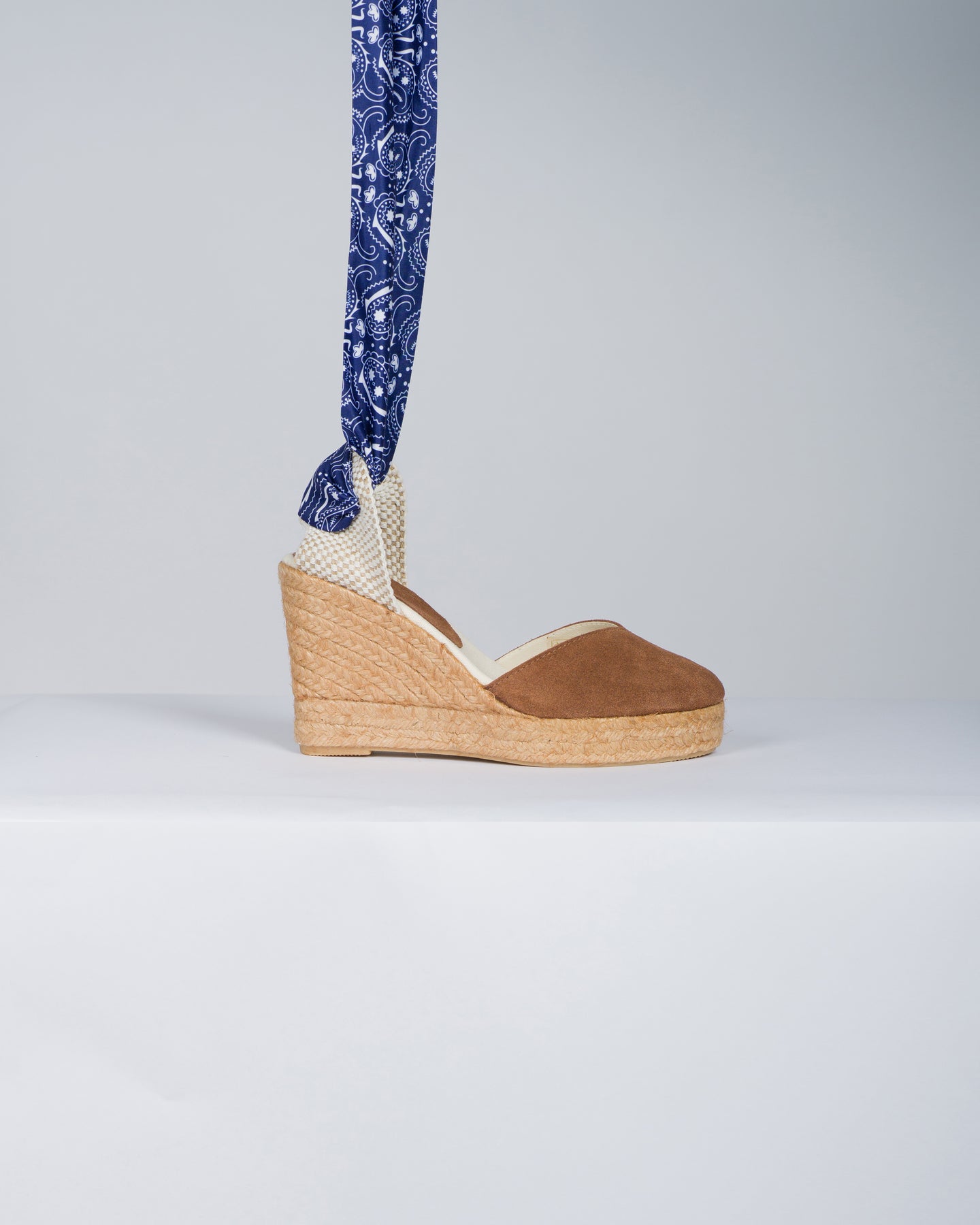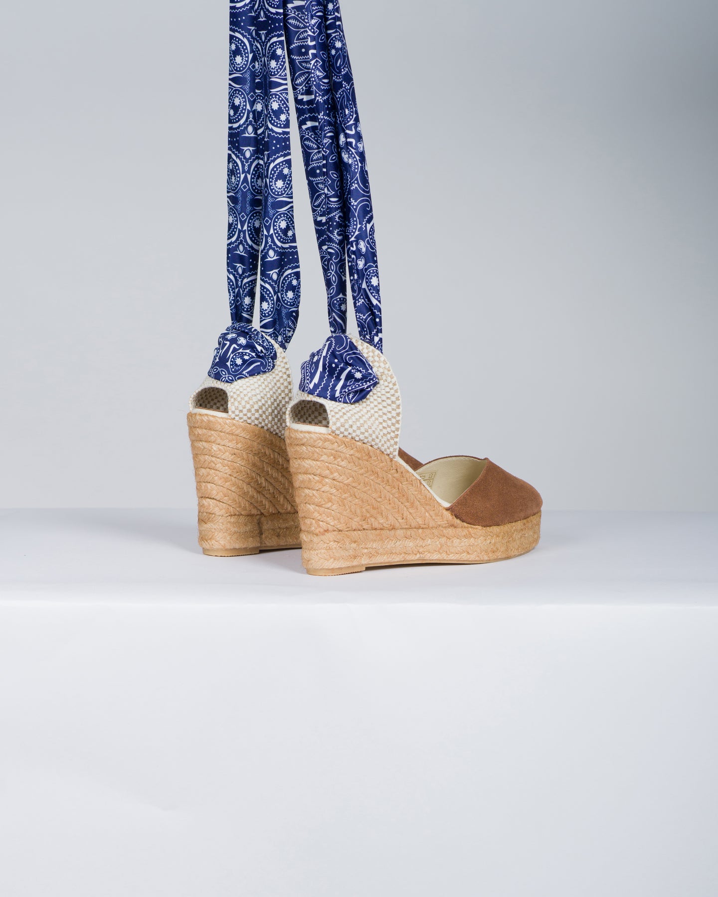 Decolletè in camoscio color arena con puntale lavorato all'uncinetto, allacciatura foulard azzurro, suola in corda con plateau h 8cm.