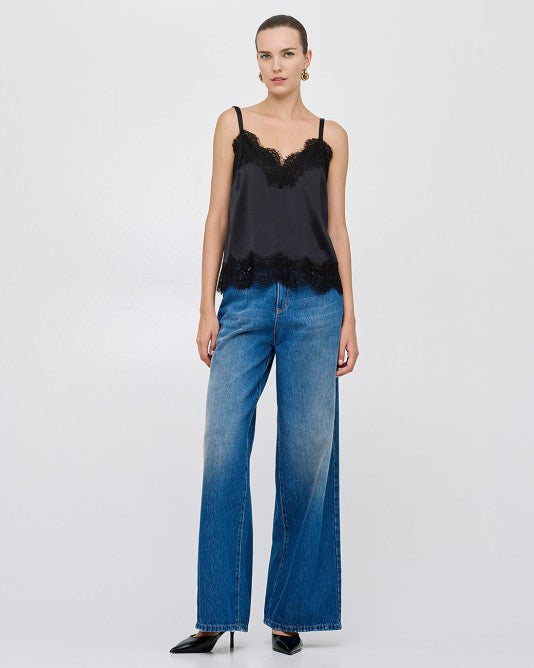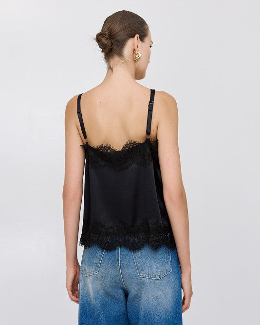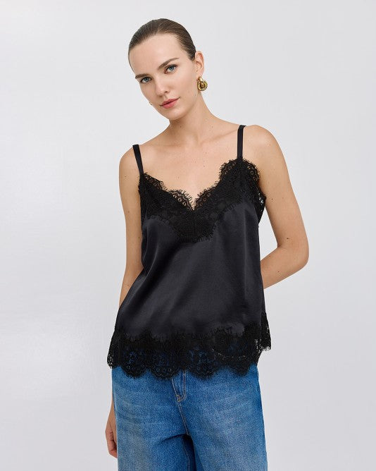 Top in raso con dettagli in pizzo. Presenta uno scollo a V e spalline regolabili.