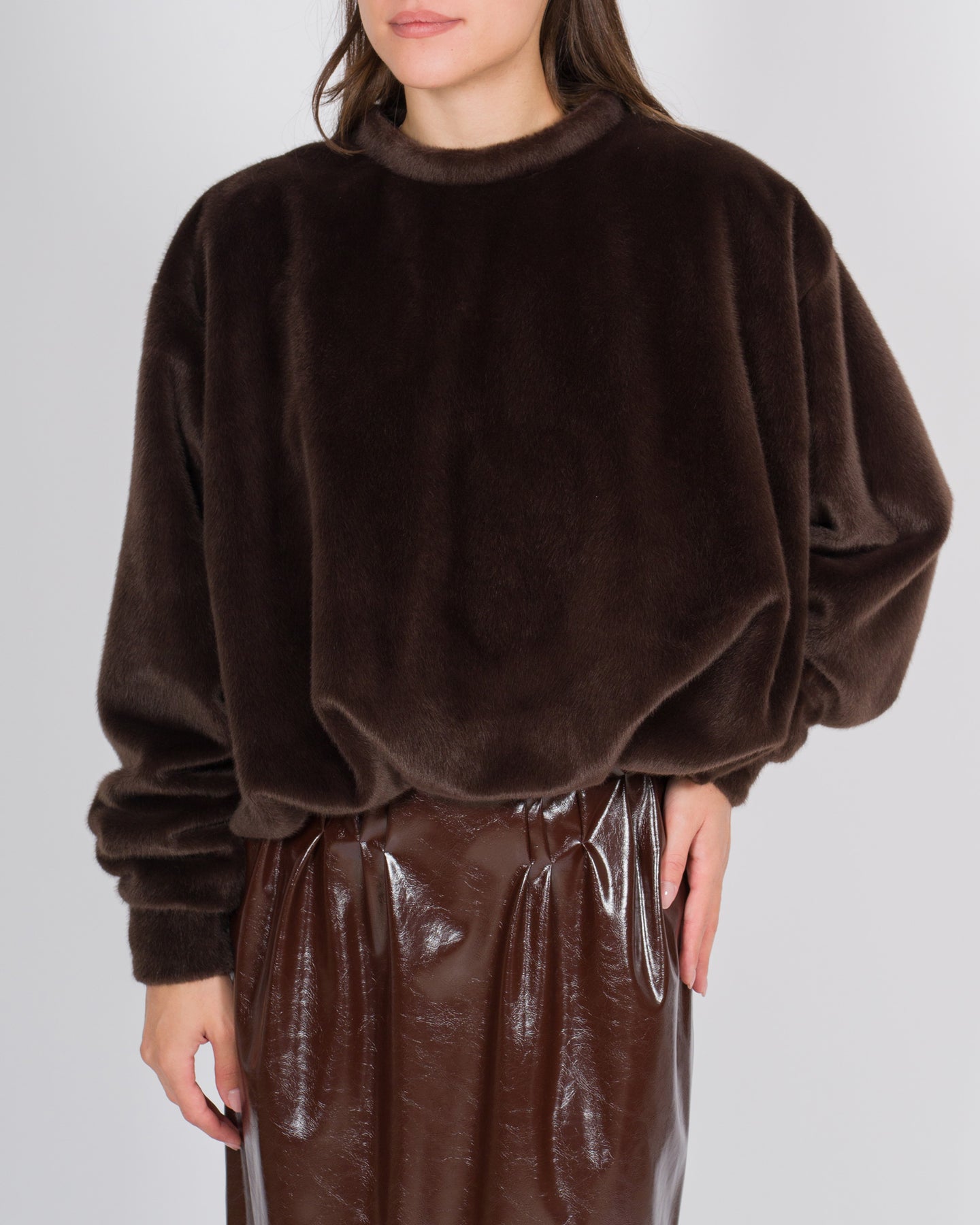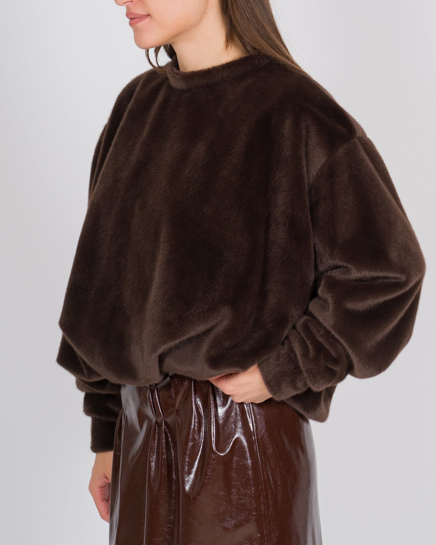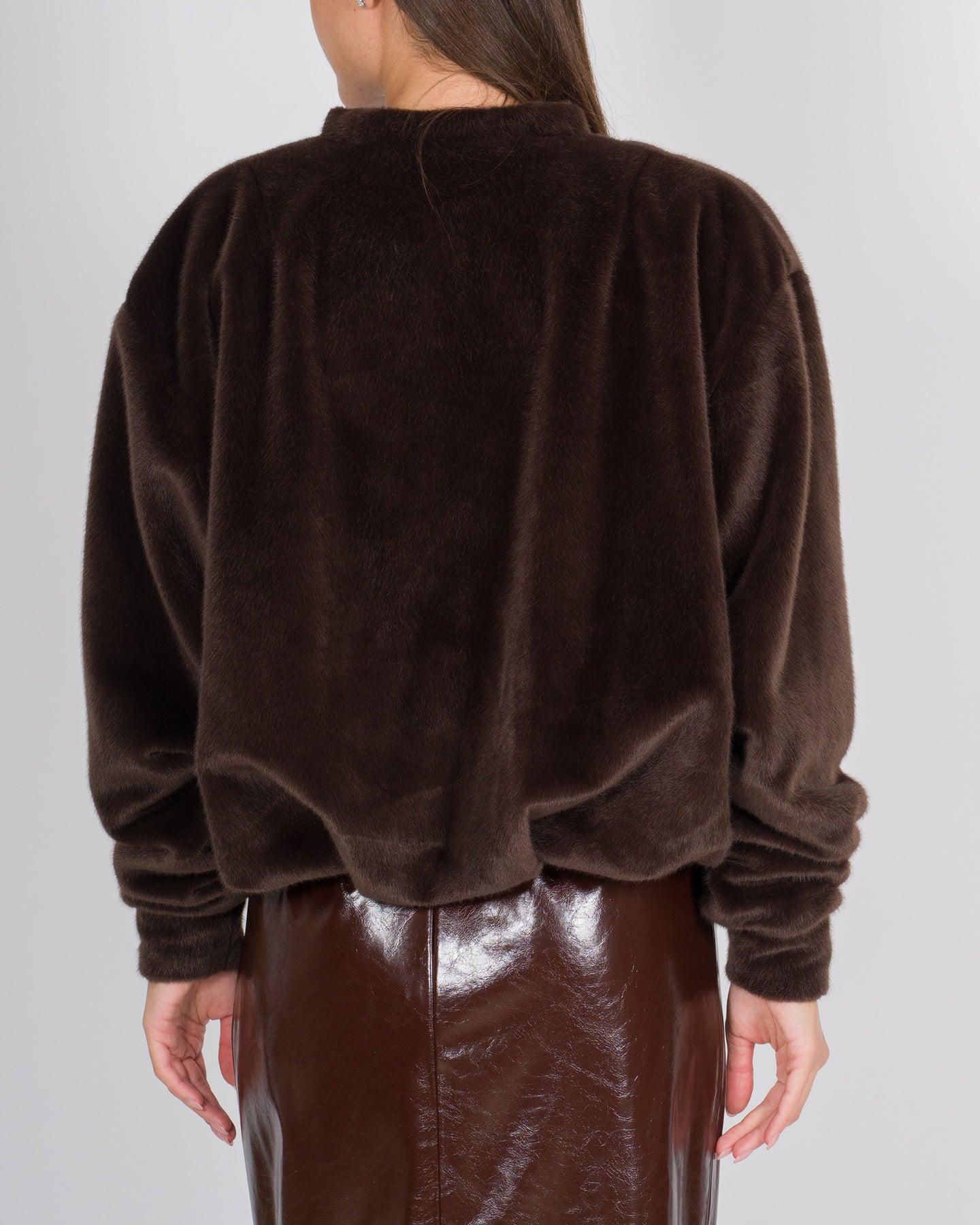 Elegante e contemporanea, questa blusa in tessuto effetto cavallino colore marrone firmata Meimej unisce morbidezza e carattere. I volumi delicati e le maniche lunghe creano una silhouette fluida e avvolgente, mentre la texture effetto cavallino aggiunge un dettaglio materico distintivo, dal fascino naturale e sofisticato.Perfetta da abbinare a pantaloni strutturati o gonne fluide, questa blusa trasforma i look quotidiani in ensemble ricercati, combinando comfort e stile con un'eleganza discreta e contemporanea.