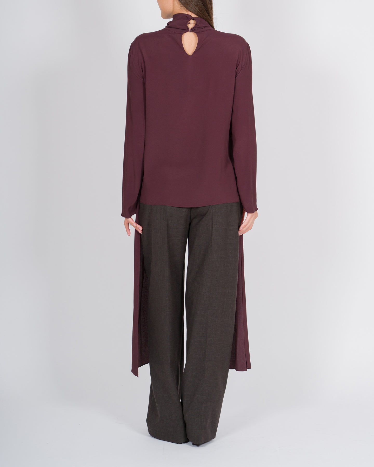 Un capo dall'eleganza fluida e sofisticata, questa blusa manica lunga firmata Meimej reinterpreta il classico design con dettagli contemporanei. Il collo alto arricciato e l'effetto drappeggio sul davanti creano un movimento morbido e naturale, donando profondità e dinamismo alla silhouette.Il taglio allungato ricorda la linea di un cardigan leggero, conferendo al capo una versatilità unica: può essere indossato da solo come top raffinato o stratificato per un layering elegante. Il tessuto morbido valorizza il corpo senza costrizione, garantendo comfort e stile in ogni occasione.