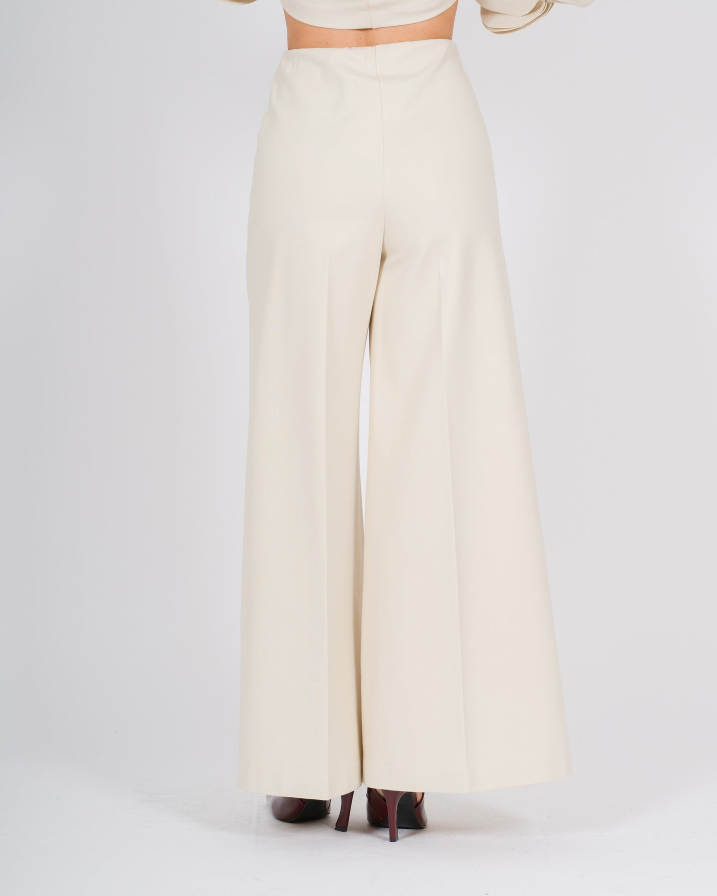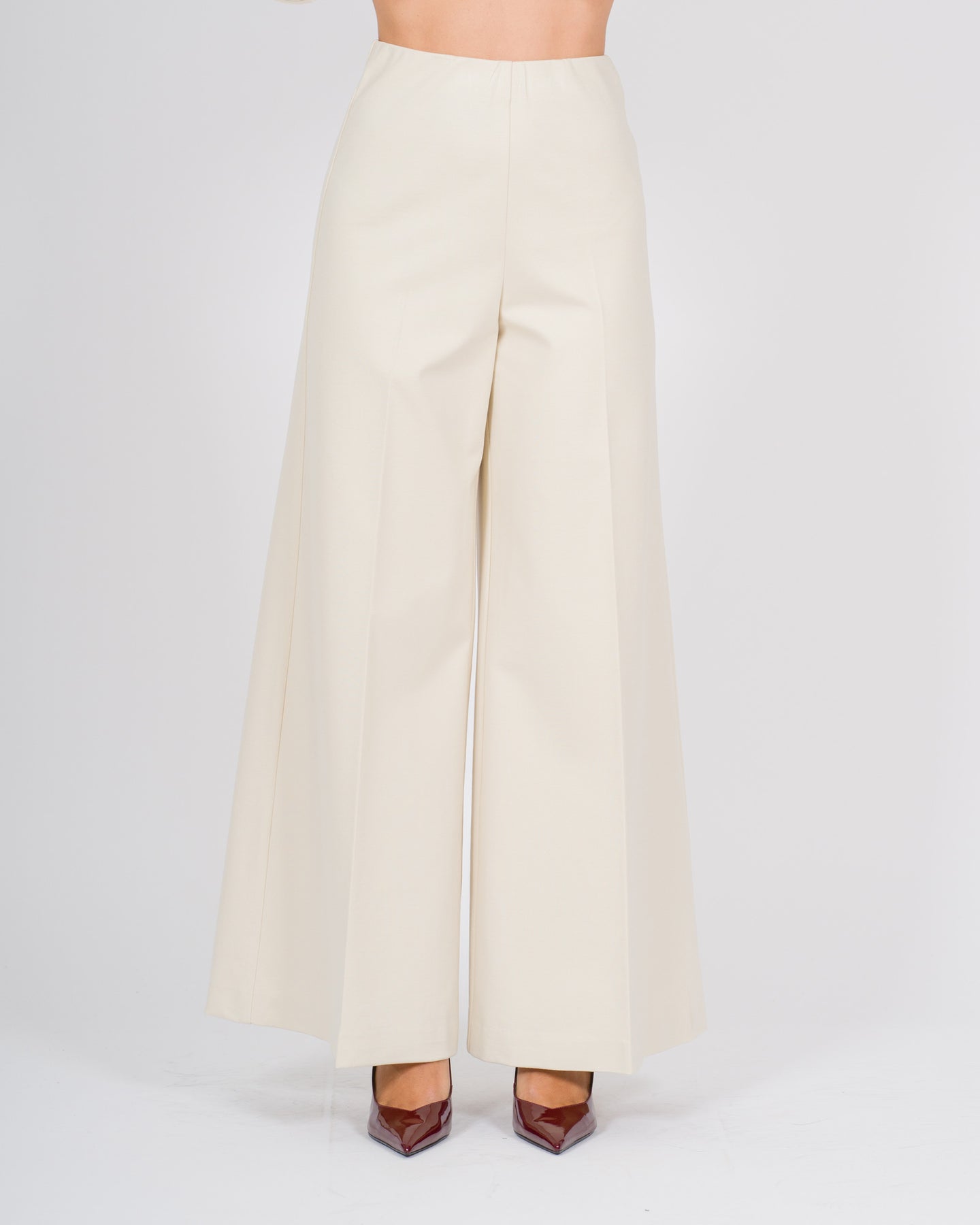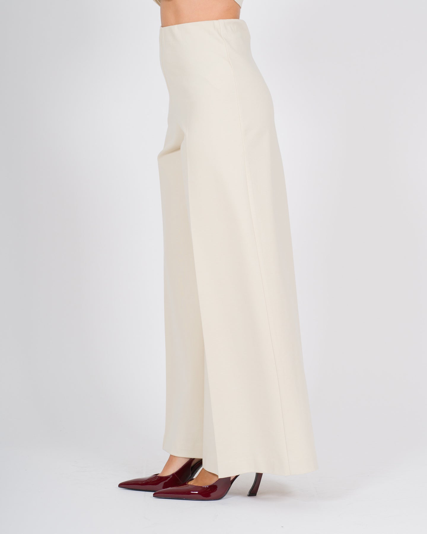 Un equilibrio perfetto tra comfort e stile caratterizza questo pantalone Meimej in jersey colore panna. La gamba larga e morbida al fondo crea una silhouette fluida e rilassata, mentre il bustino elastico in vita assicura una calzata confortevole e adattabile.Il design minimal e contemporaneo rende il capo versatile, ideale per look sofisticati ma rilassati, dove la leggerezza del tessuto e la precisione sartoriale incontrano un'estetica moderna e armoniosa.