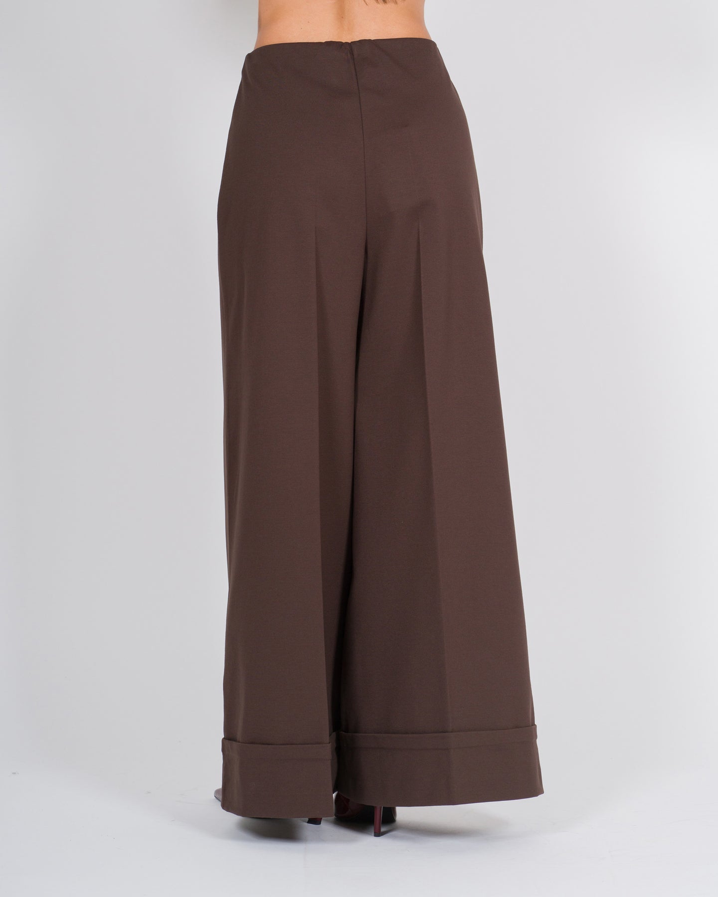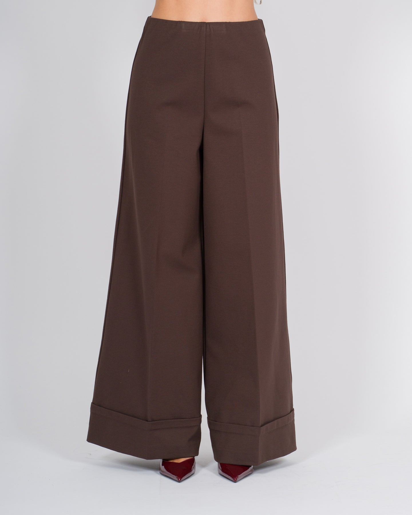 Questi pantaloni incarnano l'eleganza contemporanea di Meimej, unendo comfort e design sofisticato in un capo dal carattere deciso. Realizzati in tessuto jersey morbido colore cioccolato, presentano un bustino elastico in vita che valorizza la silhouette senza costringerla e garantisce una vestibilità confortevole.Il fondo largo con risvolto alto crea volumi fluidi e armoniosi, conferendo al capo movimento e leggerezza, perfetto per look minimal ma ricercati. Ideali da abbinare a top aderenti o blazer strutturati, questi pantaloni esaltano l'eleganza rilassata e il gusto sartoriale tipico della linea Meimej.