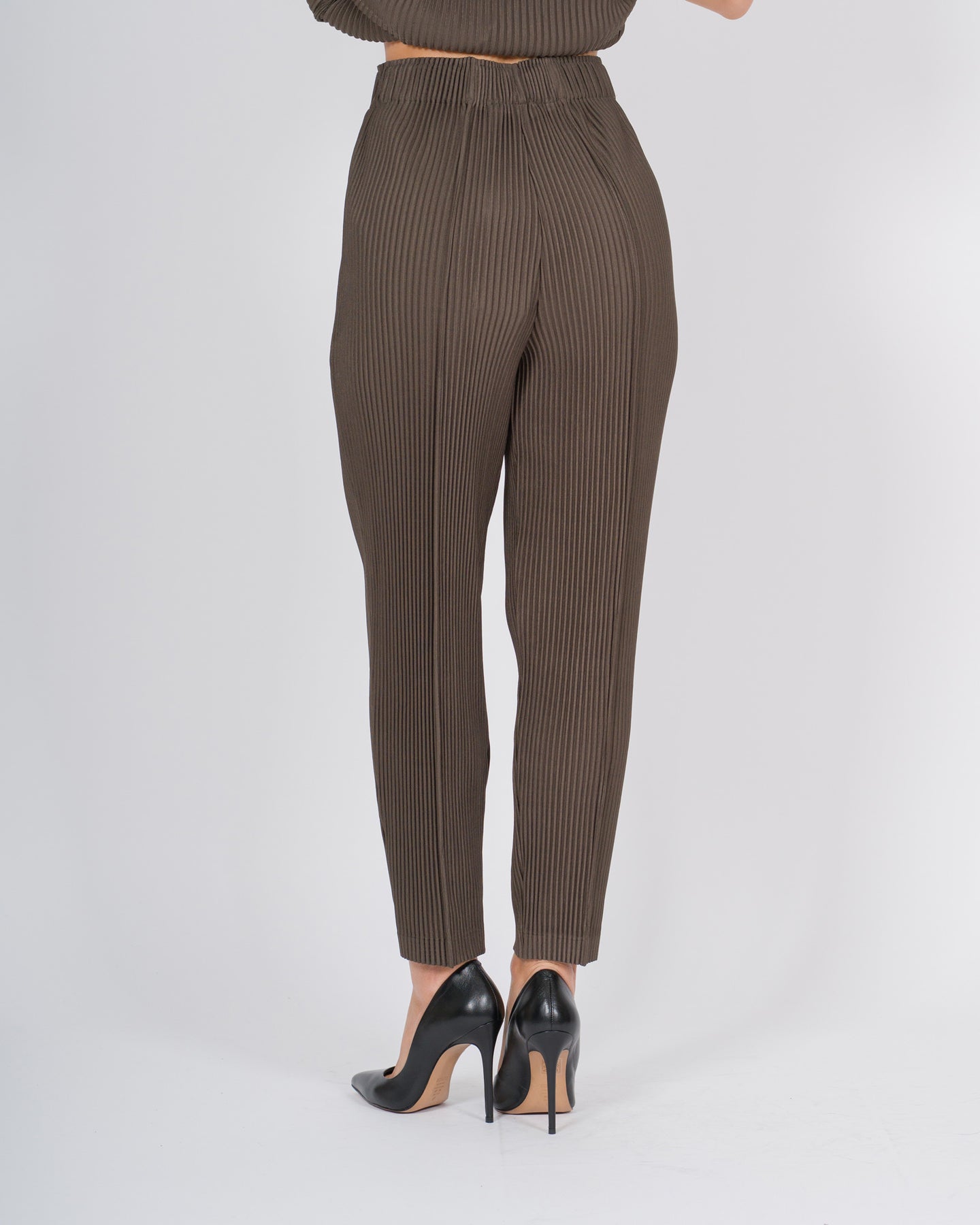 Pantaloni Meimej in tessuto effetto rocciatore a costeUn'eleganza dallo spirito moderno firmata Meimej, questi pantaloni incarnano la filosofia del brand: volumi scolpiti, dettagli sartoriali e un'estetica contemporanea. Realizzati nello stesso tessuto a coste effetto rocciatore del gilet coordinato, conferiscono continuità materica e cromatica al total look. La tonalità marrone caldo si fonde armoniosamente con la trama verticale, donando profondità visiva e un'allure materica.Il bustino elastico in vita valorizza la silhouette con discrezione e comfort, fondendo estetica e funzionalità. La riga centrale pressata apporta rigore e verticalità, slanciando la figura con grazia. La lunghezza alla caviglia conferisce un tocco sofisticato ma contemporaneo, perfetto per essere abbinato a décolleté, mocassini o stivaletti di classe.