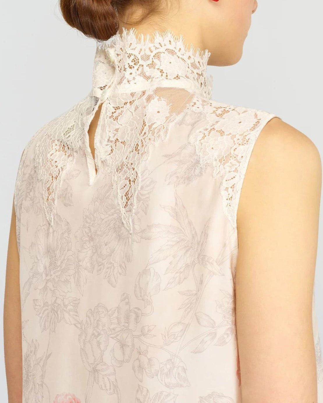 Top in habotai stampato. Colletto in pizzo con smerlo. Volume regular, lunghezza bacino.