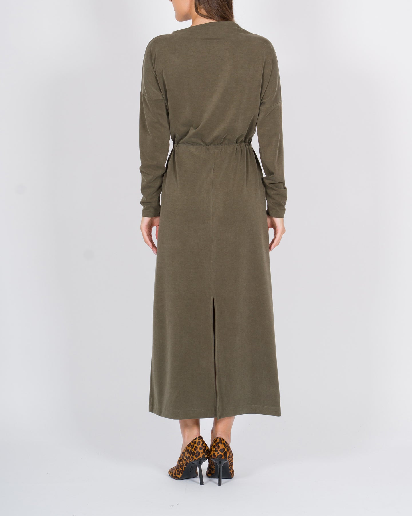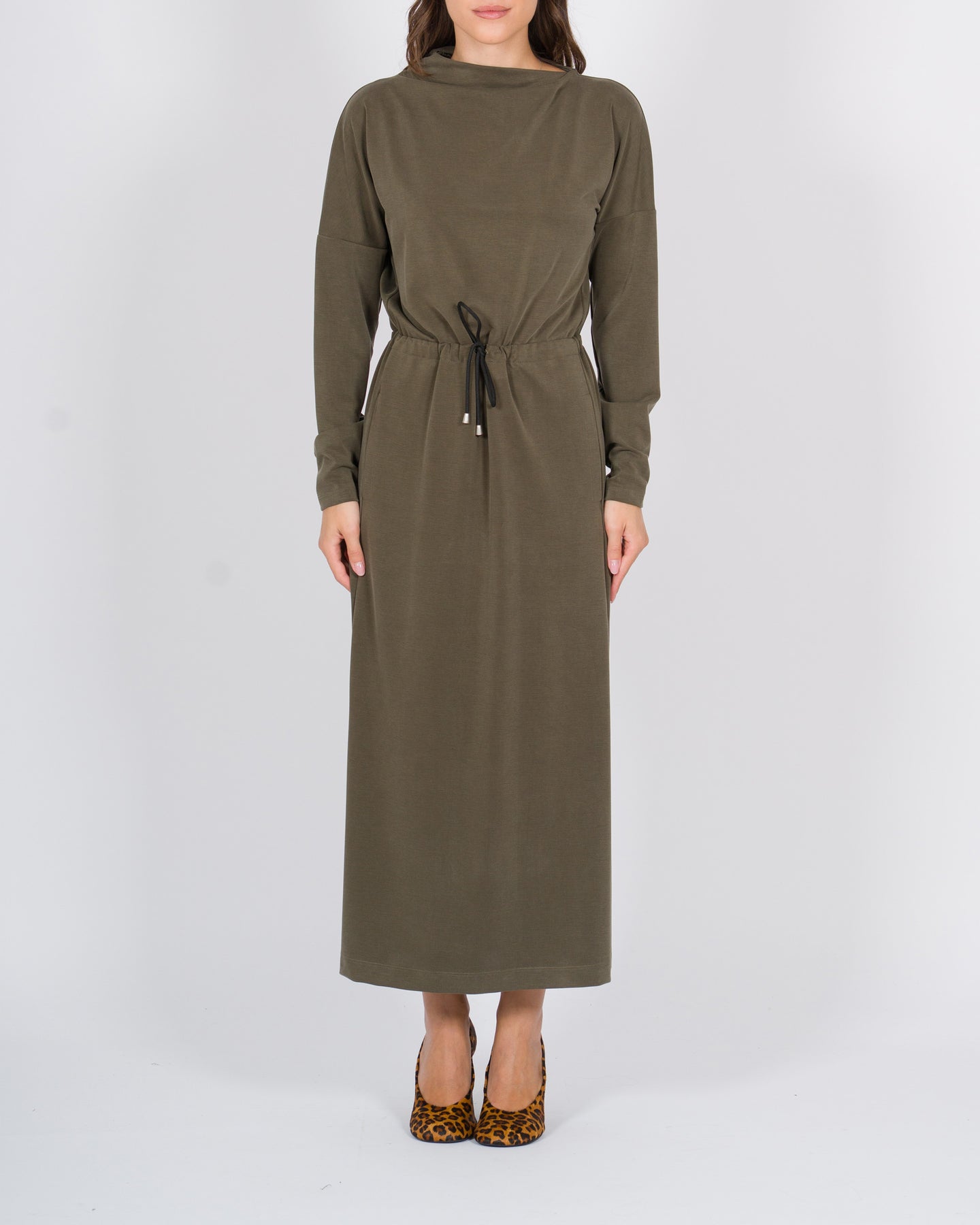 Abito lungo con collo asimmetrico e coulisse in vita oliva