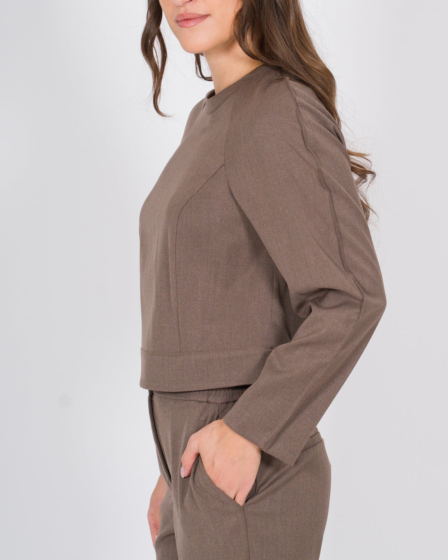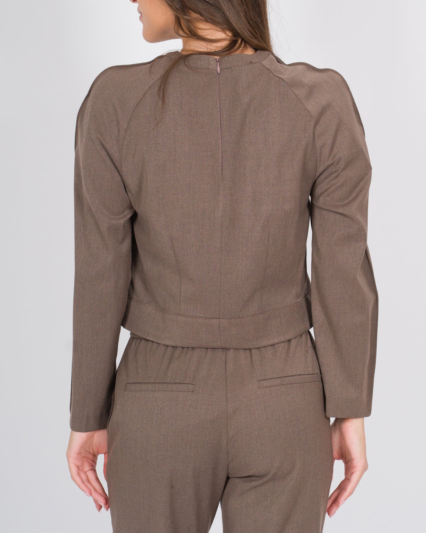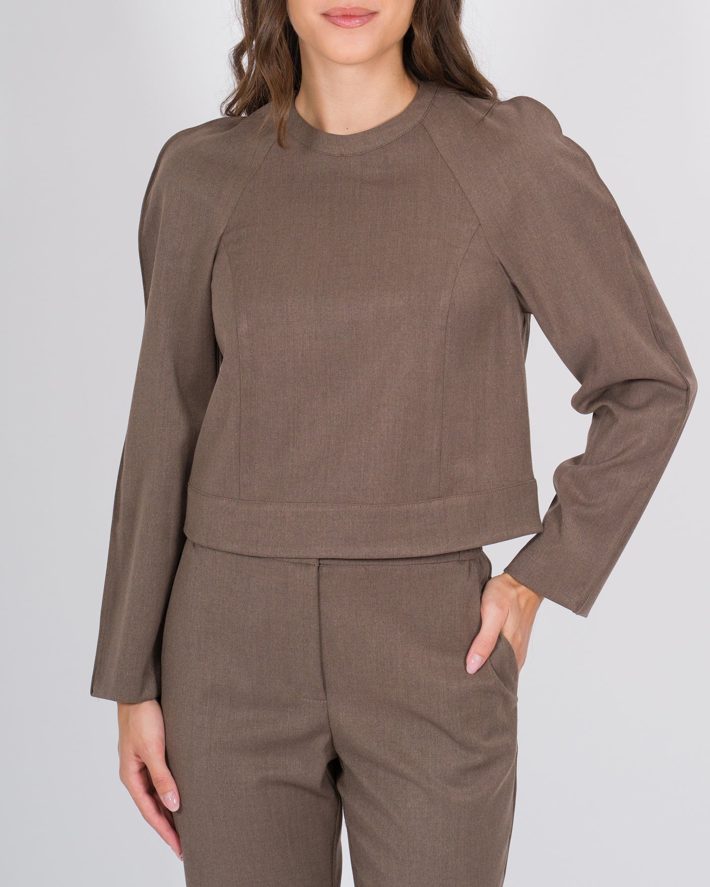 Femminile e sofisticata, questa blusa corta si distingue per le maniche lunghe a sbuffo e le cuciture decorative che valorizzano la silhouette con dettagli sartoriali. Lo scollo rotondo incornicia delicatamente il décolleté, mentre la chiusura con zip sul retro assicura una vestibilità precisa e confortevole.Un capo elegante e versatile, perfetto per creare look curati e raffinati. Abbinala ai pantaloni coordinati della collezione per un completo armonioso e di classe, ideale per occasioni formali o eventi speciali.