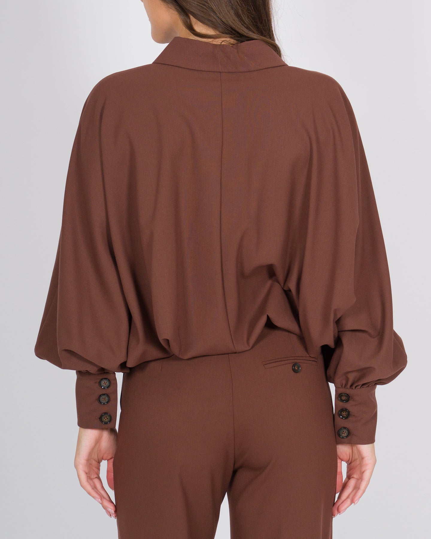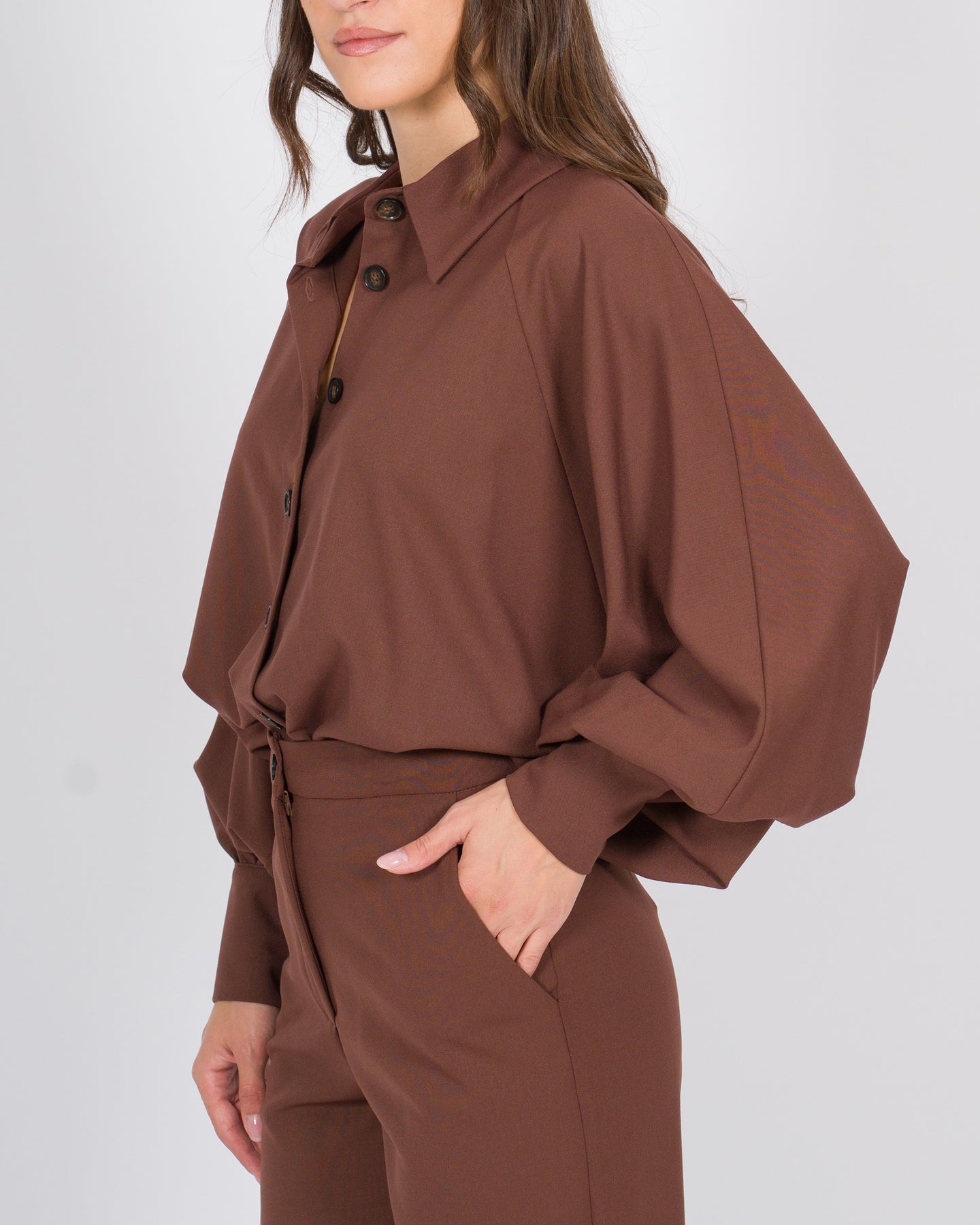 Questo body a camicia combina eleganza e femminilità con le maniche lunghe a sbuffo e il colletto classico, dettagli che richiamano lo stile sartoriale tradizionale. L'elastico in vita assicura una vestibilità aderente e confortevole, mentre la chiusura con bottoni sul davanti e sul fondo garantisce praticità e cura dei dettagli.Perfetto per look eleganti, si abbina facilmente a pantaloni sartoriali, gonne midi o blazer per outfit raffinati e contemporanei.