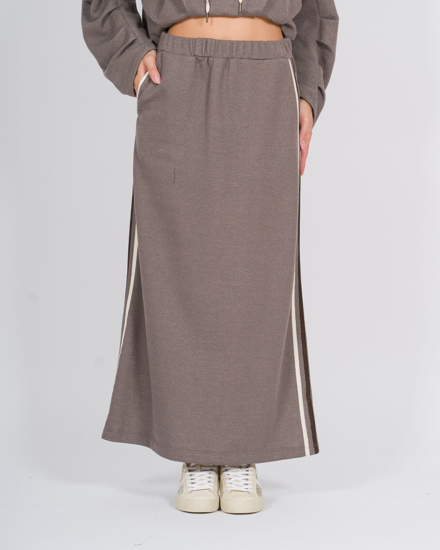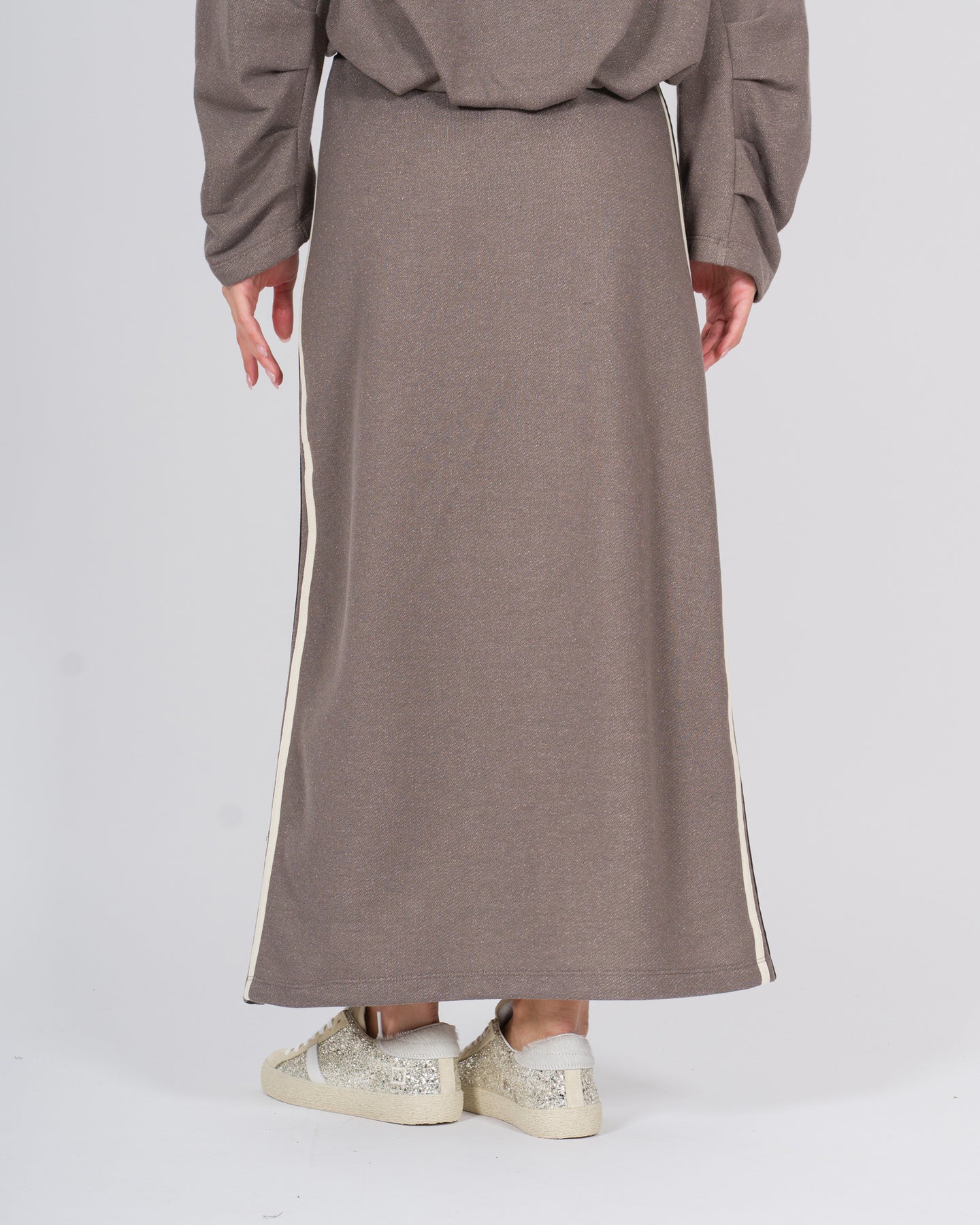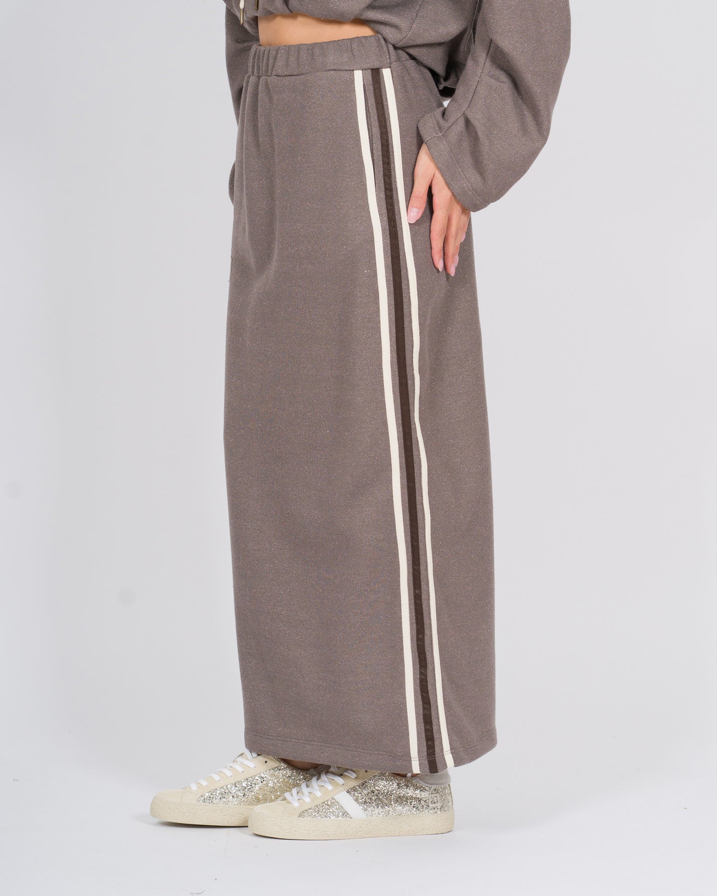 Questa gonna midi unisce comfort ed eleganza grazie all'elastico in vita, che assicura una vestibilità adattabile, e ai dettagli laterali a righe, che aggiungono dinamismo al capo. Le tasche laterali e i delicati dettagli in filo effetto metallizzato completano il design con un tocco luminoso e sofisticato.Abbinala alla blusa coordinata della collezione per un look elegante e comodo, perfetto per occasioni quotidiane o outfit da ufficio raffinati.