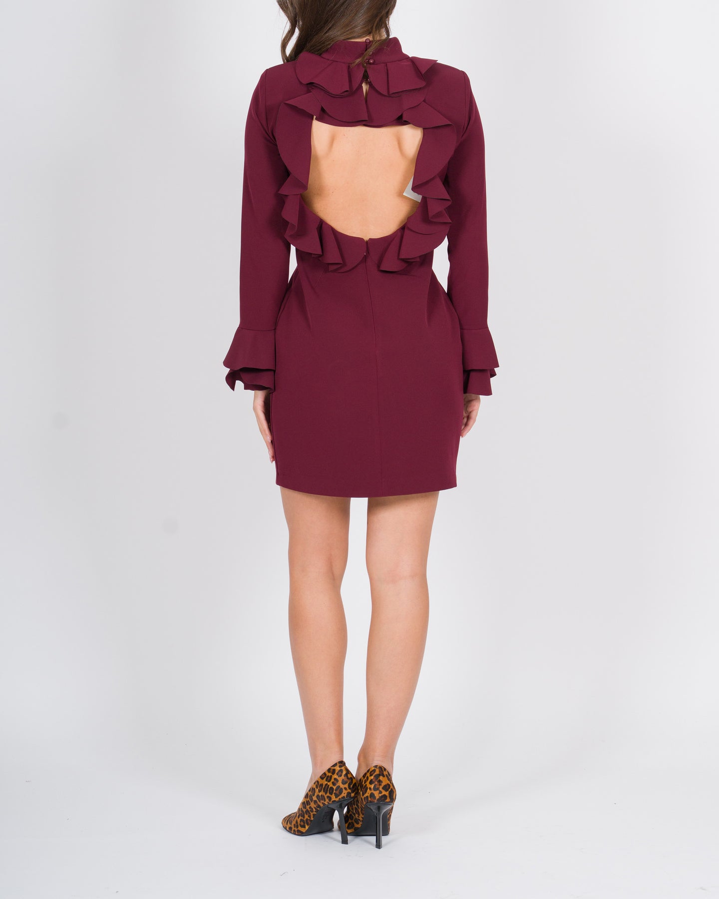 Femminile e sofisticato, questo mini abito si distingue per i volant sulle maniche e sul retro, che aggiungono movimento e leggerezza al capo. Presenta un'apertura posteriore per una vestibilità comoda e uno scollatura impreziosita da un fiore decorativo, che dona un tocco romantico e distintivo. Le spalline imbottite completano il design, valorizzando la silhouette con eleganza.Perfetto per look formali eleganti, è ideale per occasioni speciali in cui desideri un outfit di grande impatto e raffinatezza.