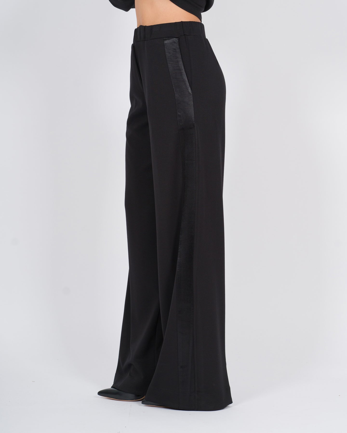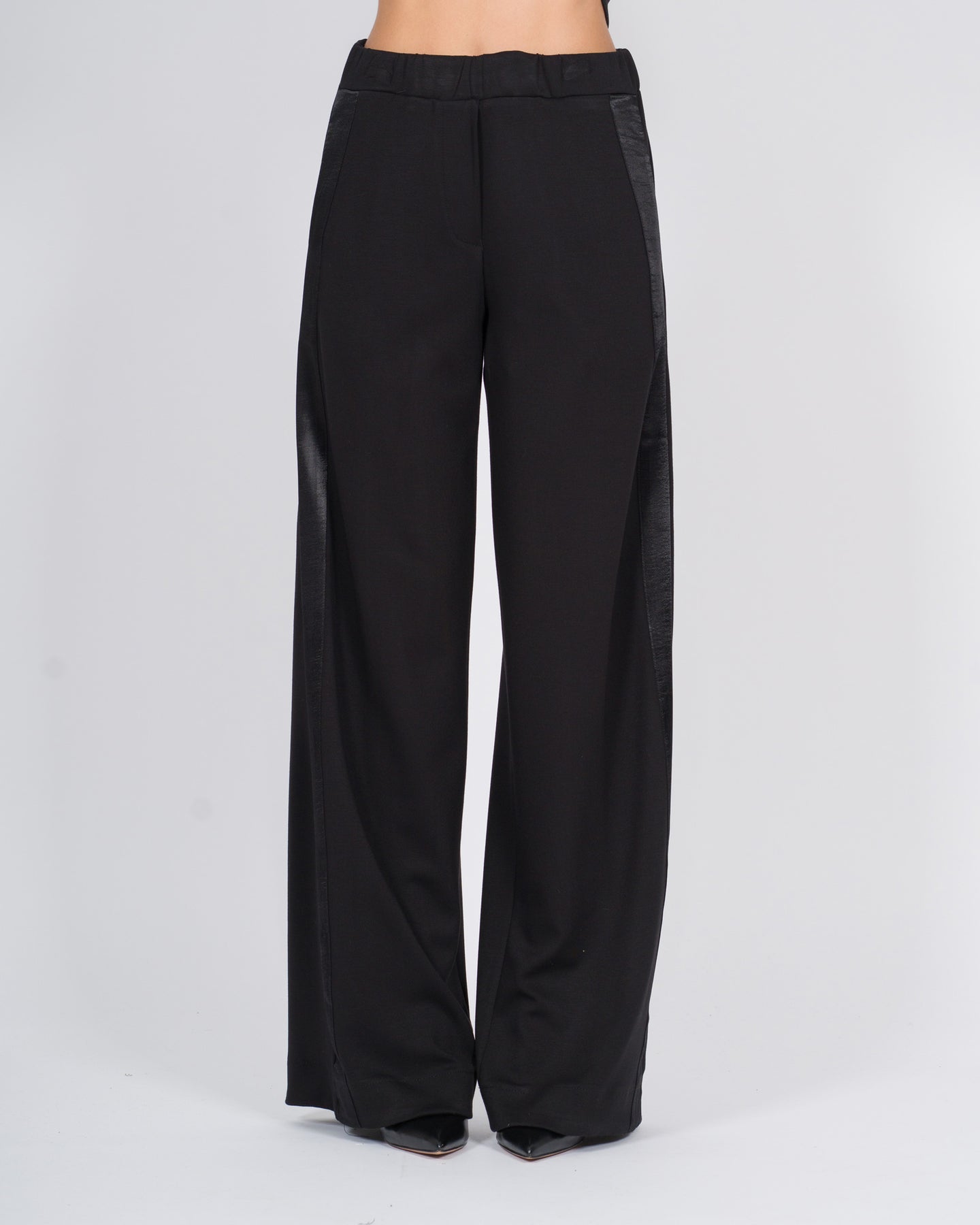 Questi pantaloni a vita alta uniscono eleganza e comfort grazie ai dettagli laterali in raso e all'elastico in vita con coulisse interna, che garantisce una vestibilità regolabile e raffinata. Le tasche laterali funzionali completano il design, aggiungendo praticità senza compromettere lo stile.Abbinali alla blusa coordinata della collezione per un look elegante e disinvolto, perfetto per occasioni quotidiane o outfit da ufficio contemporanei.