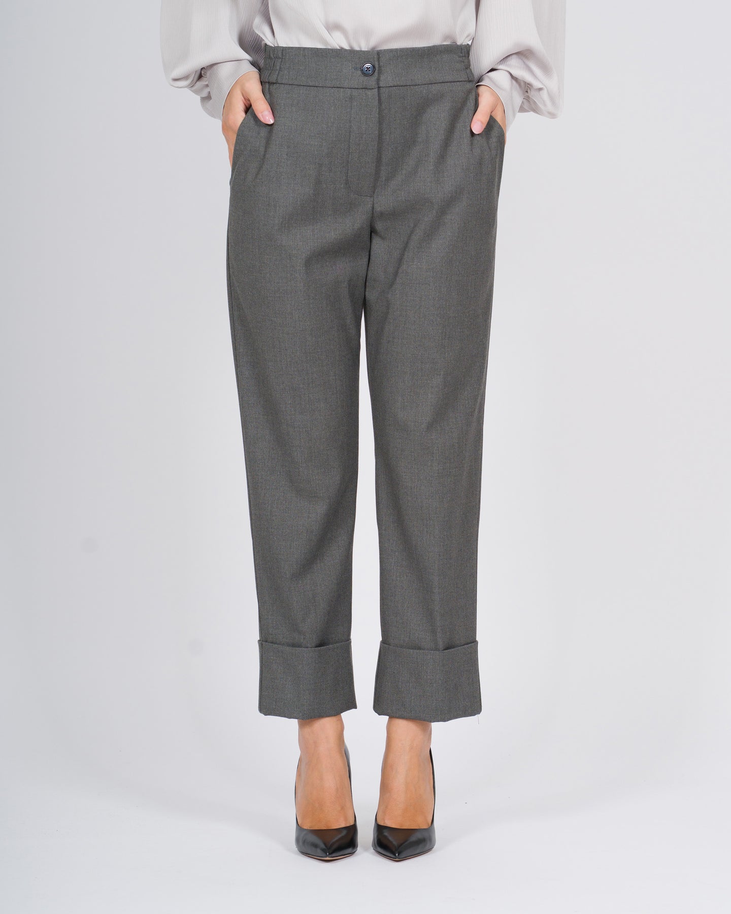 Questi pantaloni a vita alta uniscono comfort ed eleganza grazie alla vita elasticizzata e al risvolto sul fondo, che donano un effetto moderno e fluido alla silhouette. Sono dotati di tasche laterali funzionali e chiusura frontale con zip e bottone per una vestibilità precisa e confortevole.Perfetti per look comodi ed eleganti, si abbinano facilmente a top sartoriali, bluse o blazer per outfit da giorno raffinati e contemporanei.