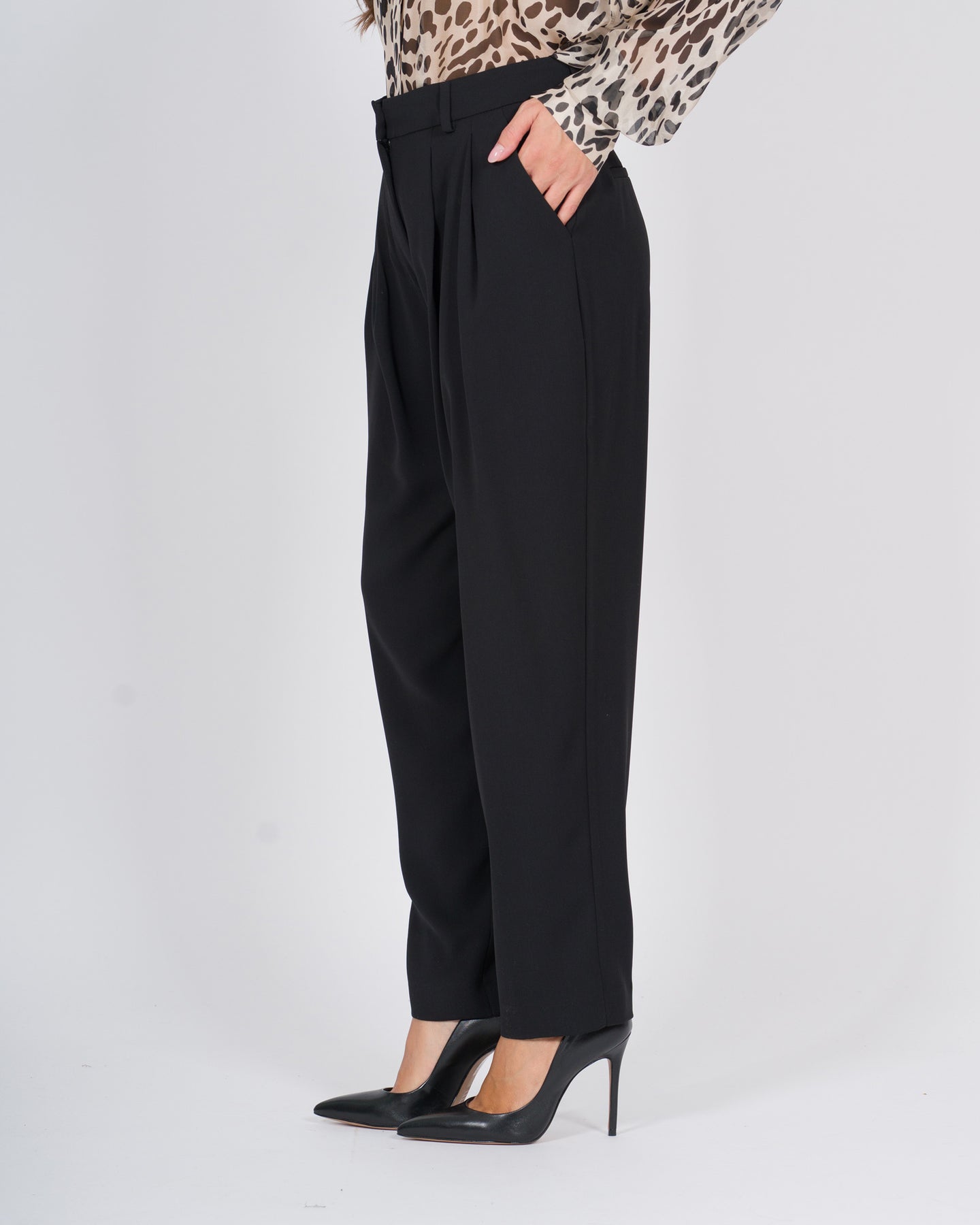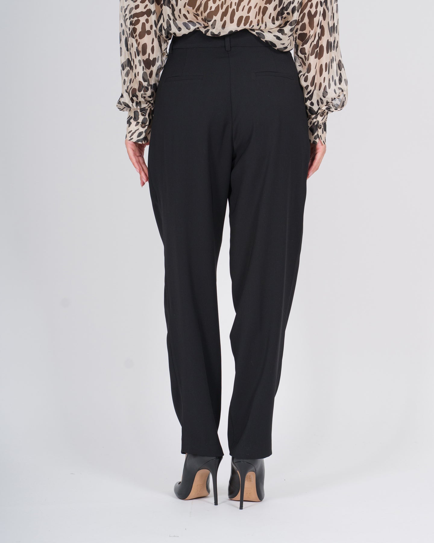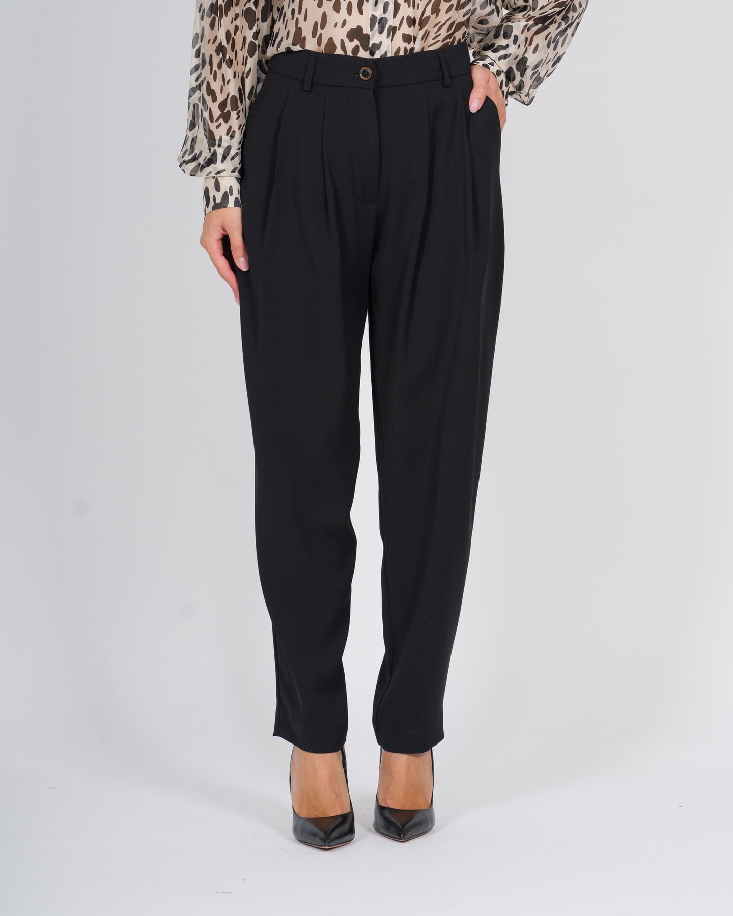 Questi pantaloni carrot fit a vita alta uniscono eleganza e modernità grazie alle pinces anteriori, che valorizzano la silhouette con un taglio sartoriale e contemporaneo. Sono dotati di tasche laterali funzionali e passanti per cintura, che aggiungono praticità e versatilità al capo.Perfetti per look eleganti e alla moda, si abbinano facilmente a camicie, blazer o top sofisticati per outfit da giorno o da ufficio di grande stile.