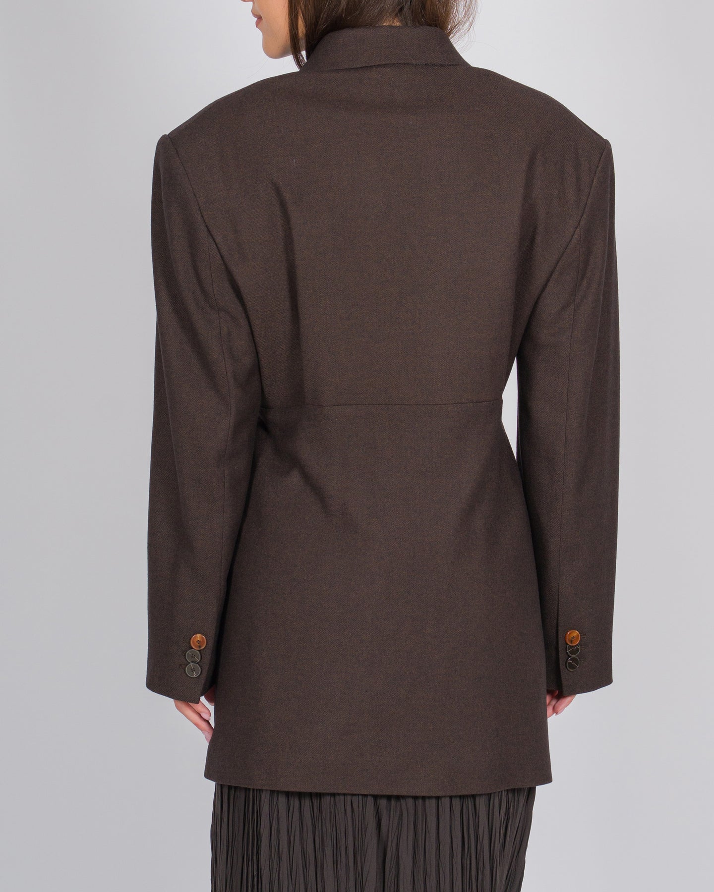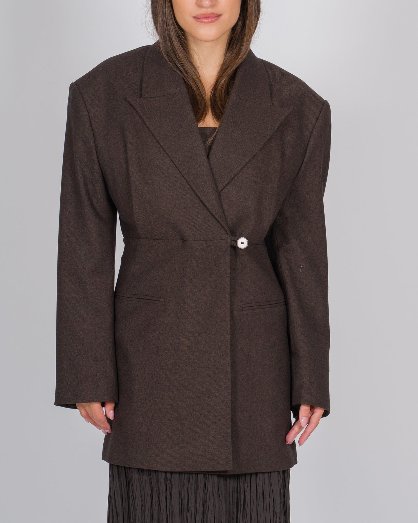Questo blazer over firmato Alysi unisce eleganza sartoriale e linee contemporanee. Realizzato in lana marrone di qualità, presenta una chiusura a pacchetto e un revers a lancia, aggiungendo un dettaglio distintivo al design. La lunghezza è leggermente più lunga rispetto a una giacca tradizionale, creando una silhouette moderna e slanciata. Un capo versatile, perfetto per look formali o outfit casual stratificati.Dettagli prodotto:Colore: marroneMateriale: lanaVestibilità overChiusura a pacchettoRevers a lanciaLunghezza più lunga rispetto alla giacca classicaLinea moderna e contemporanea