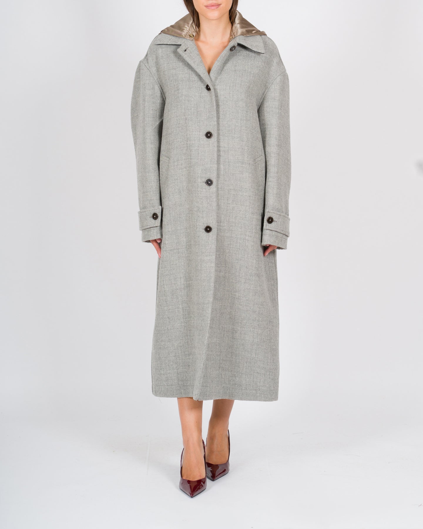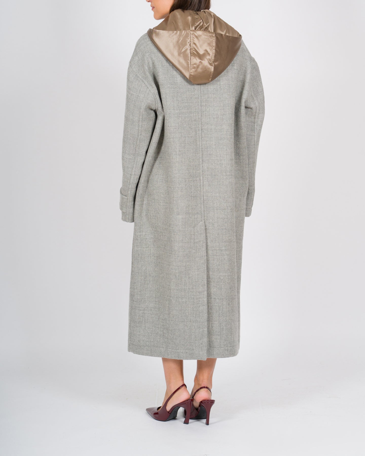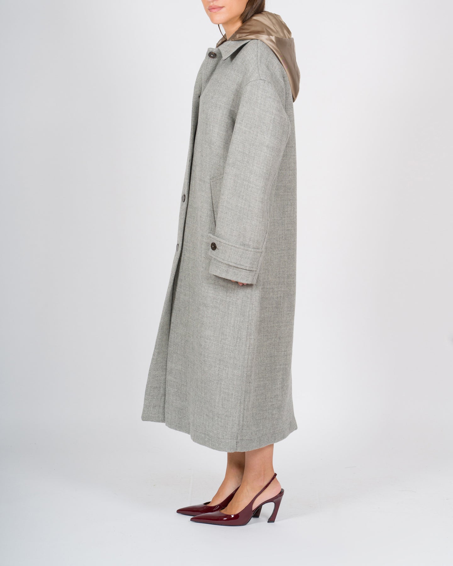 Cappotto lungo Alysì in lana grigia, con maniche raglan per una linea morbida e moderna. Il collo camicia e la chiusura frontale con bottoni donano eleganza discreta, mentre le tasche laterali e il cappuccio in contrasto staccabile aumentano praticità e versatilità. Un capo perfetto per completare look raffinati o casual, con uno stile contemporaneo e funzionale.Brand: AlysìModello: Cappotto lungoColore: GrigioTessuto: LanaChiusura: frontale con bottoniCollo: camiciaManiche: raglanTasche: laterali inseriteCappuccio: in contrasto staccabileVestibilità: regolare/over leggera