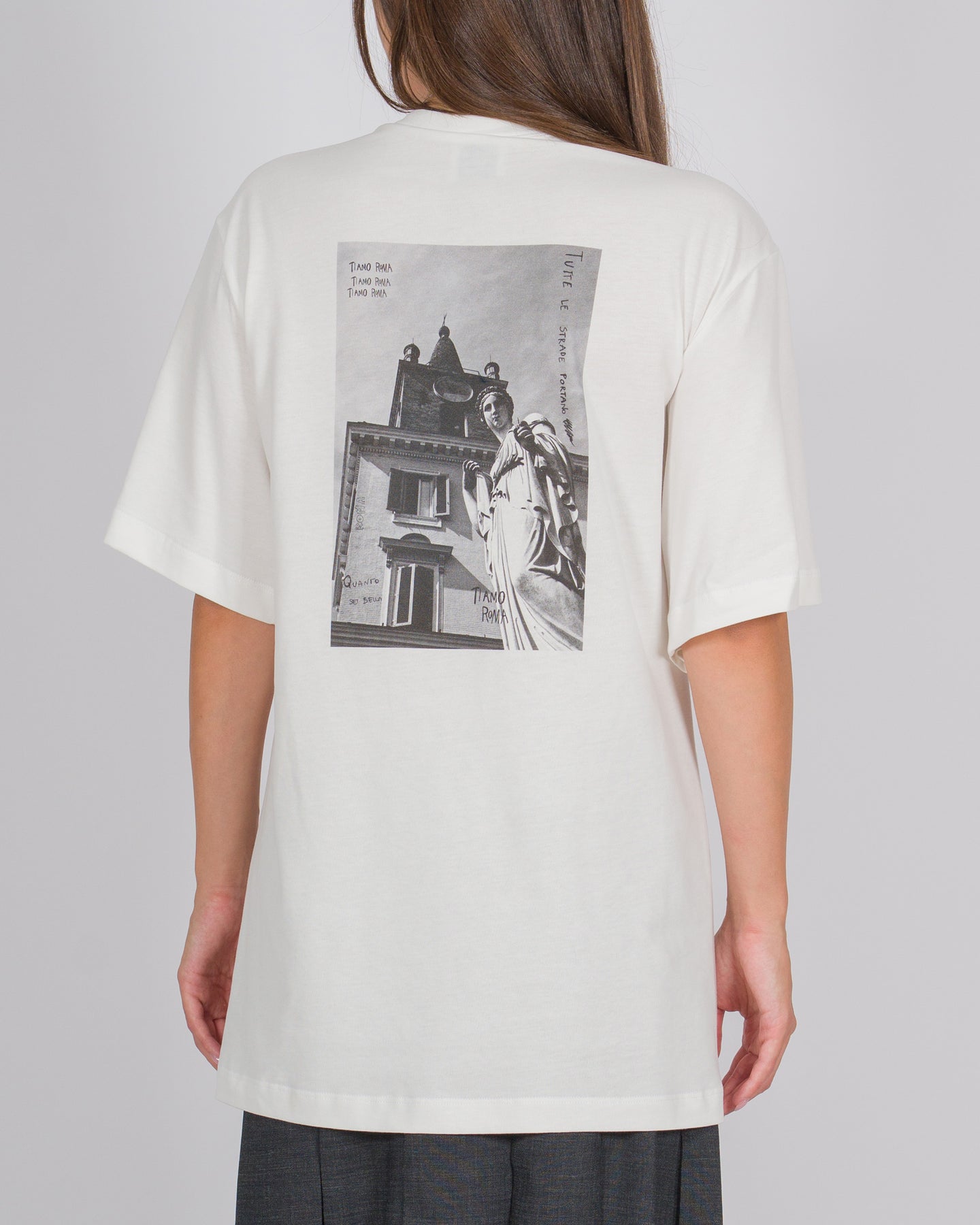 Un capo dal carattere casual e contemporaneo, questa T-shirt over di Alysi è realizzata in morbido cotone vino. Il design essenziale a girocollo è arricchito da una scritta frontale "Ti Amo Roma", dichiarazione d'amore alla città eterna, mentre sul retro si distingue per una stampa grafica che aggiunge un tocco urbano e distintivo. La vestibilità over la rende versatile e facile da abbinare, perfetta per look quotidiani con un twist moderno.Dettagli prodotto:Colore: vinoCotoneVestibilità overStampa frontale con scritta Ti Amo RomaStampa grafica posterioreGirocollo, maniche corte