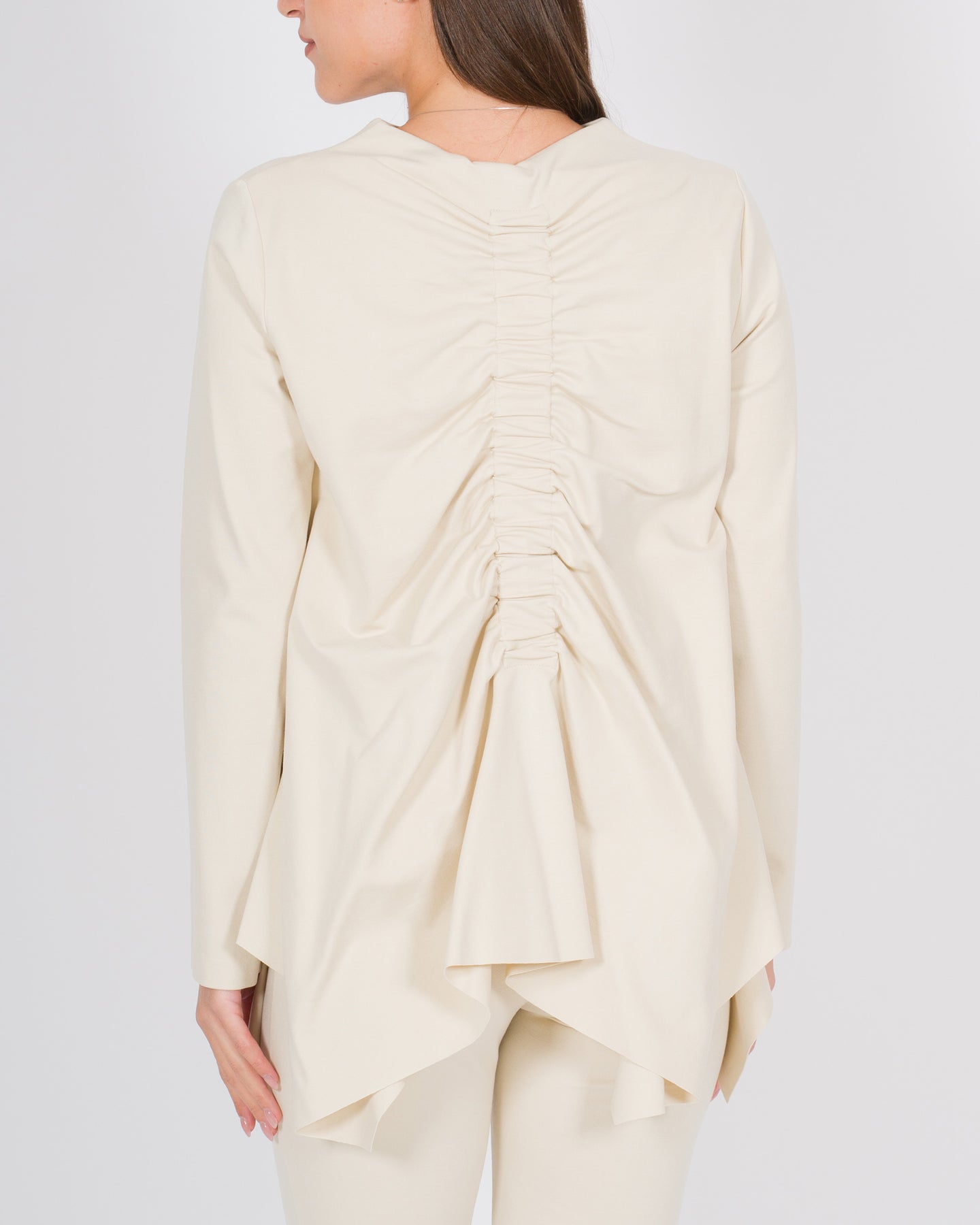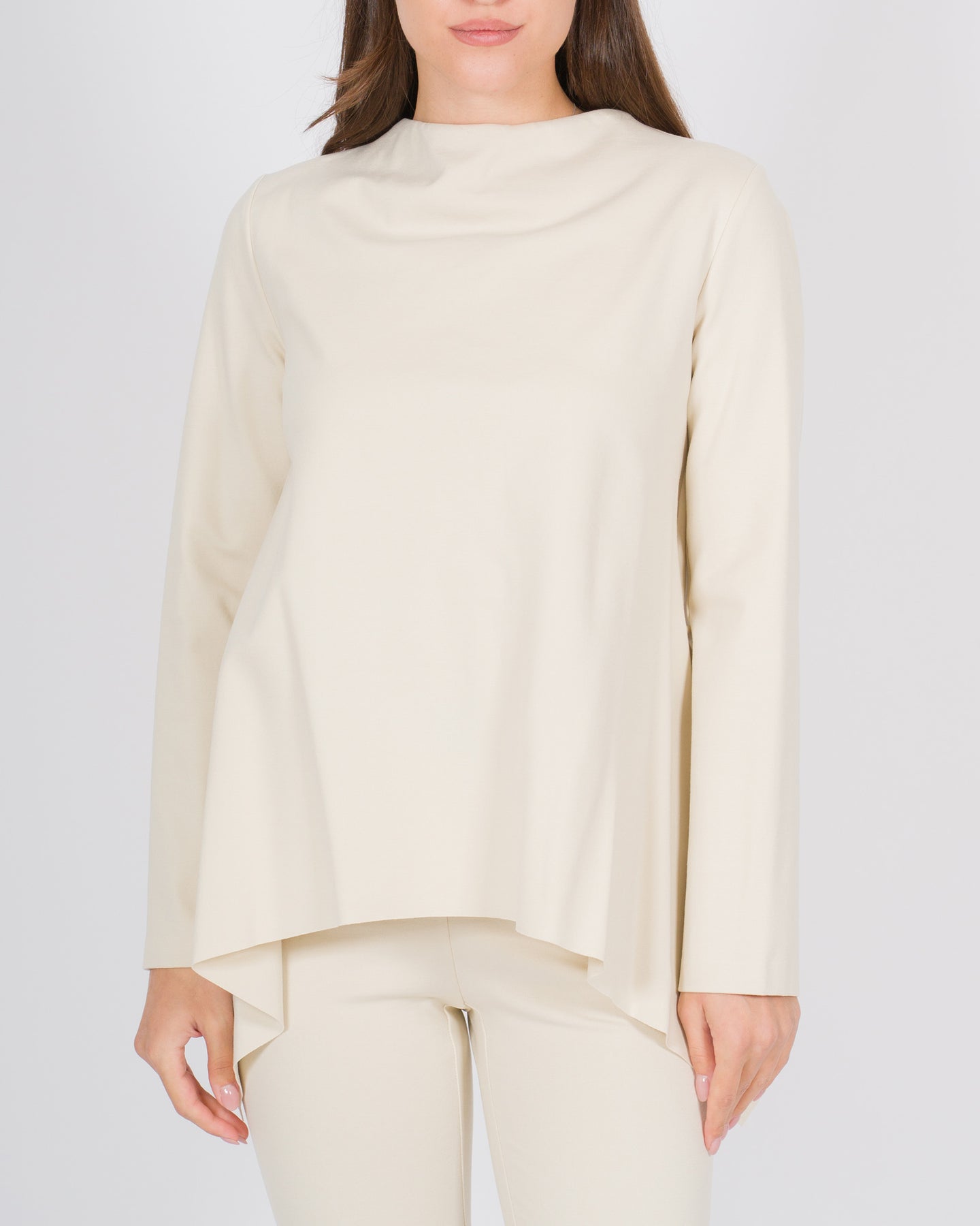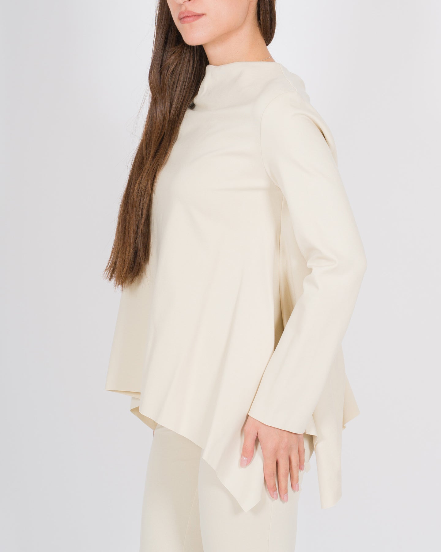 Soffice e contemporanea, questa maglia Meimej in jersey colore panna unisce comfort e design raffinato. Il collo a cratere dona un dettaglio strutturale moderno, mentre l'arriccio sulla schiena e i volumi morbidi creano una silhouette fluida e avvolgente, elegante e dinamica.Pensata per chi ama capi minimal ma distintivi, versatile da abbinare a pantaloni o gonne sartoriali, per un look sofisticato, fluido e dal carattere moderno.