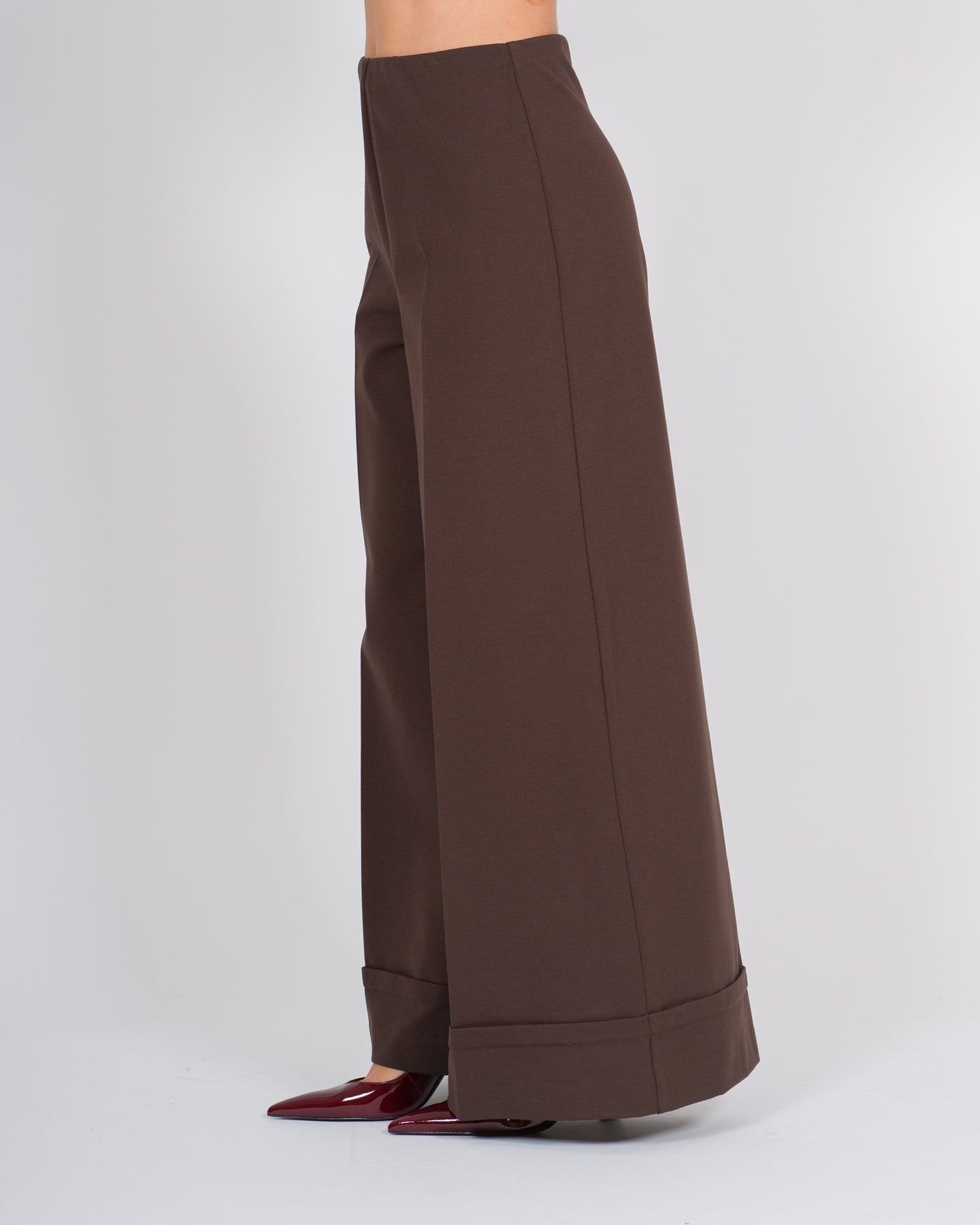 Questi pantaloni incarnano l'eleganza contemporanea di Meimej, unendo comfort e design sofisticato in un capo dal carattere deciso. Realizzati in tessuto jersey morbido colore cioccolato, presentano un bustino elastico in vita che valorizza la silhouette senza costringerla e garantisce una vestibilità confortevole.Il fondo largo con risvolto alto crea volumi fluidi e armoniosi, conferendo al capo movimento e leggerezza, perfetto per look minimal ma ricercati. Ideali da abbinare a top aderenti o blazer strutturati, questi pantaloni esaltano l'eleganza rilassata e il gusto sartoriale tipico della linea Meimej.