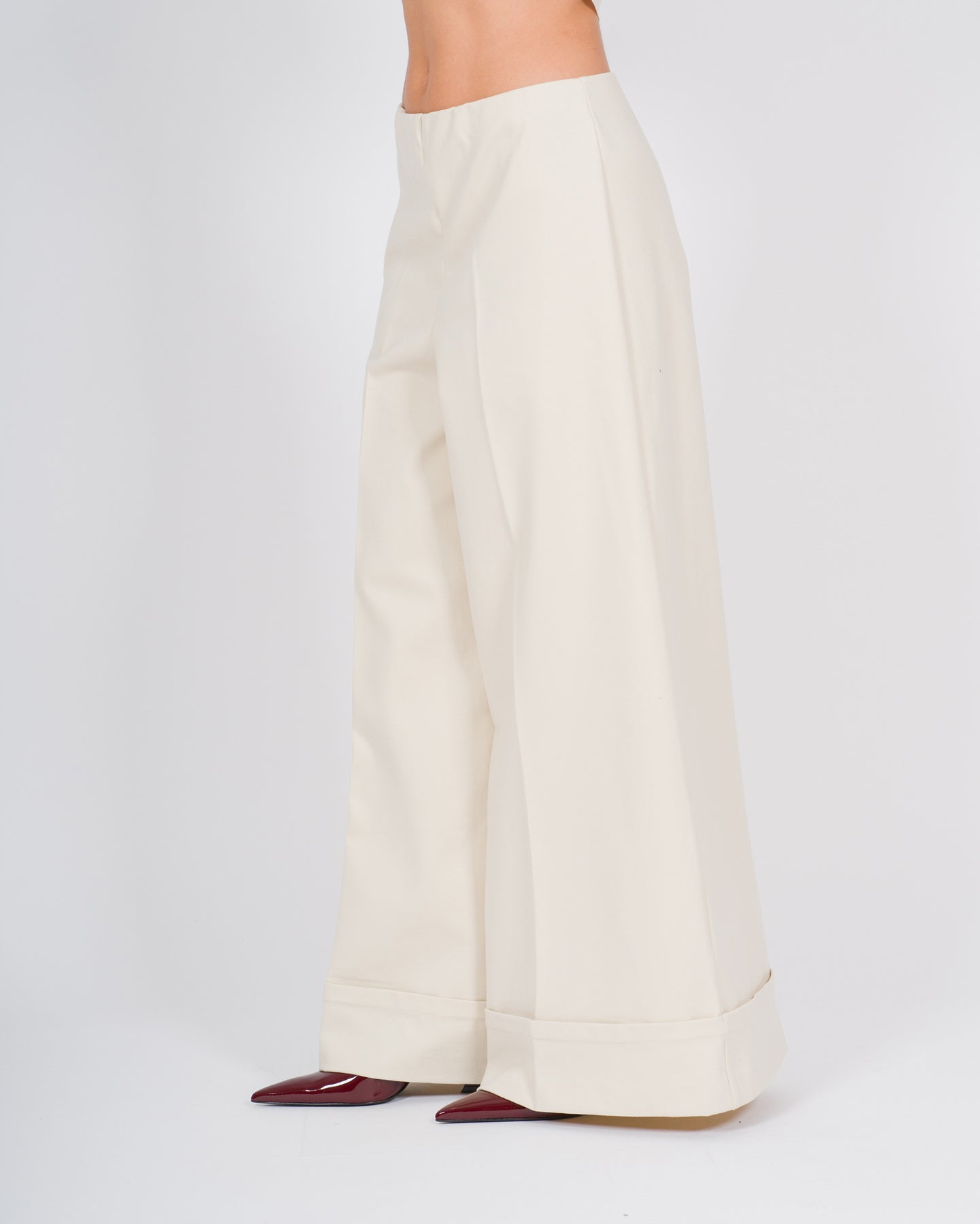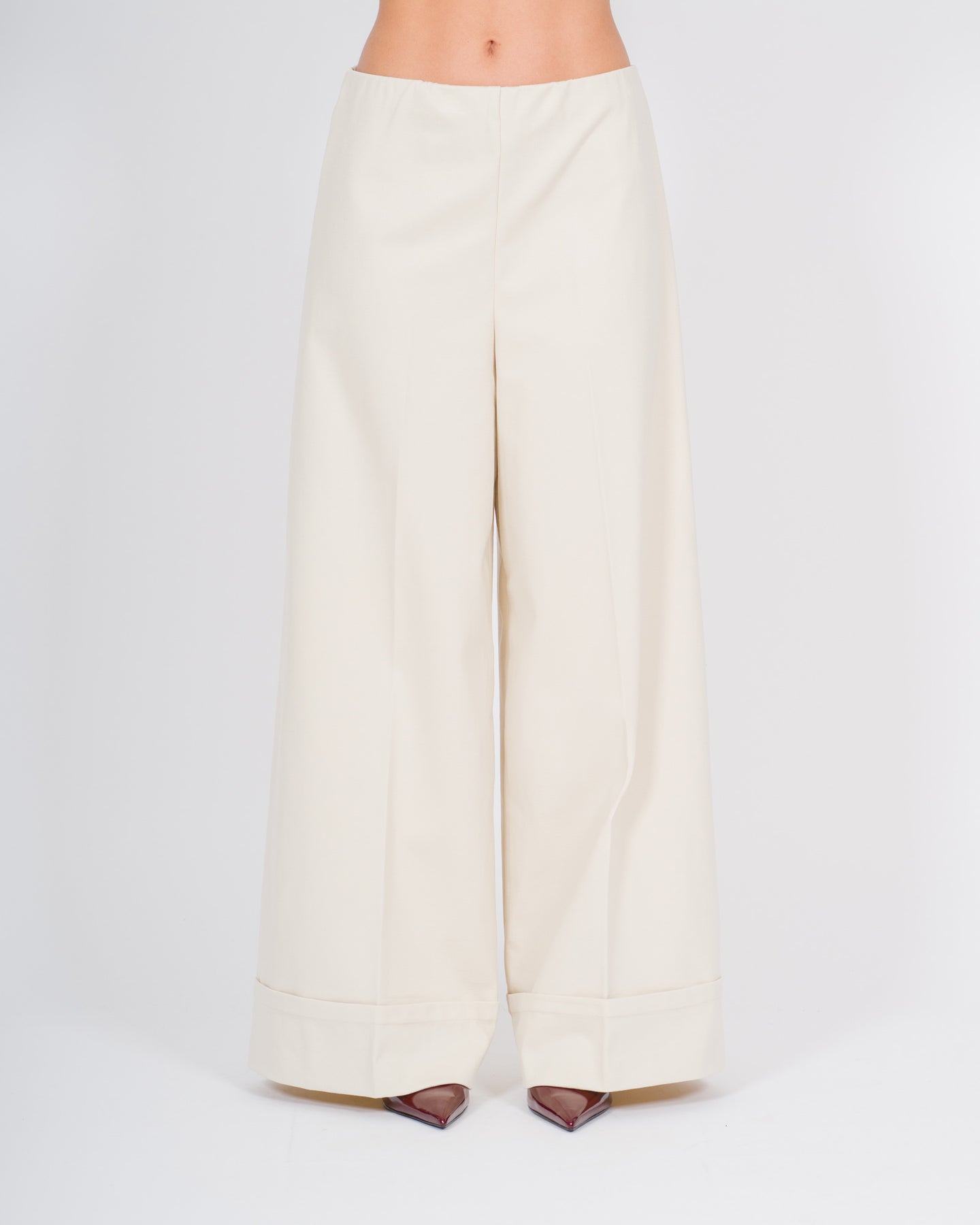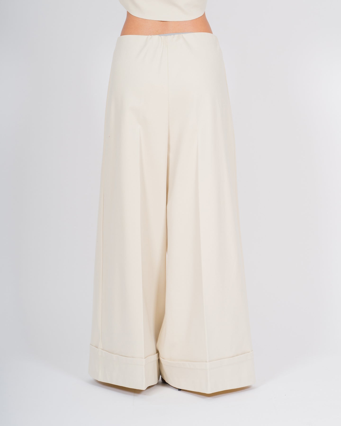 Questi pantaloni incarnano l'eleganza contemporanea di Meimej, unendo comfort e design sofisticato in un capo dal carattere deciso. Realizzati in tessuto jersey morbido colore panna, presentano un bustino elastico in vita che valorizza la silhouette senza costringerla e garantisce una vestibilità confortevole.Il fondo largo con risvolto alto crea volumi fluidi e armoniosi, conferendo al capo movimento e leggerezza, perfetto per look minimal ma ricercati. Ideali da abbinare a top aderenti o blazer strutturati, questi pantaloni esaltano l'eleganza rilassata e il gusto sartoriale tipico della linea Meimej.