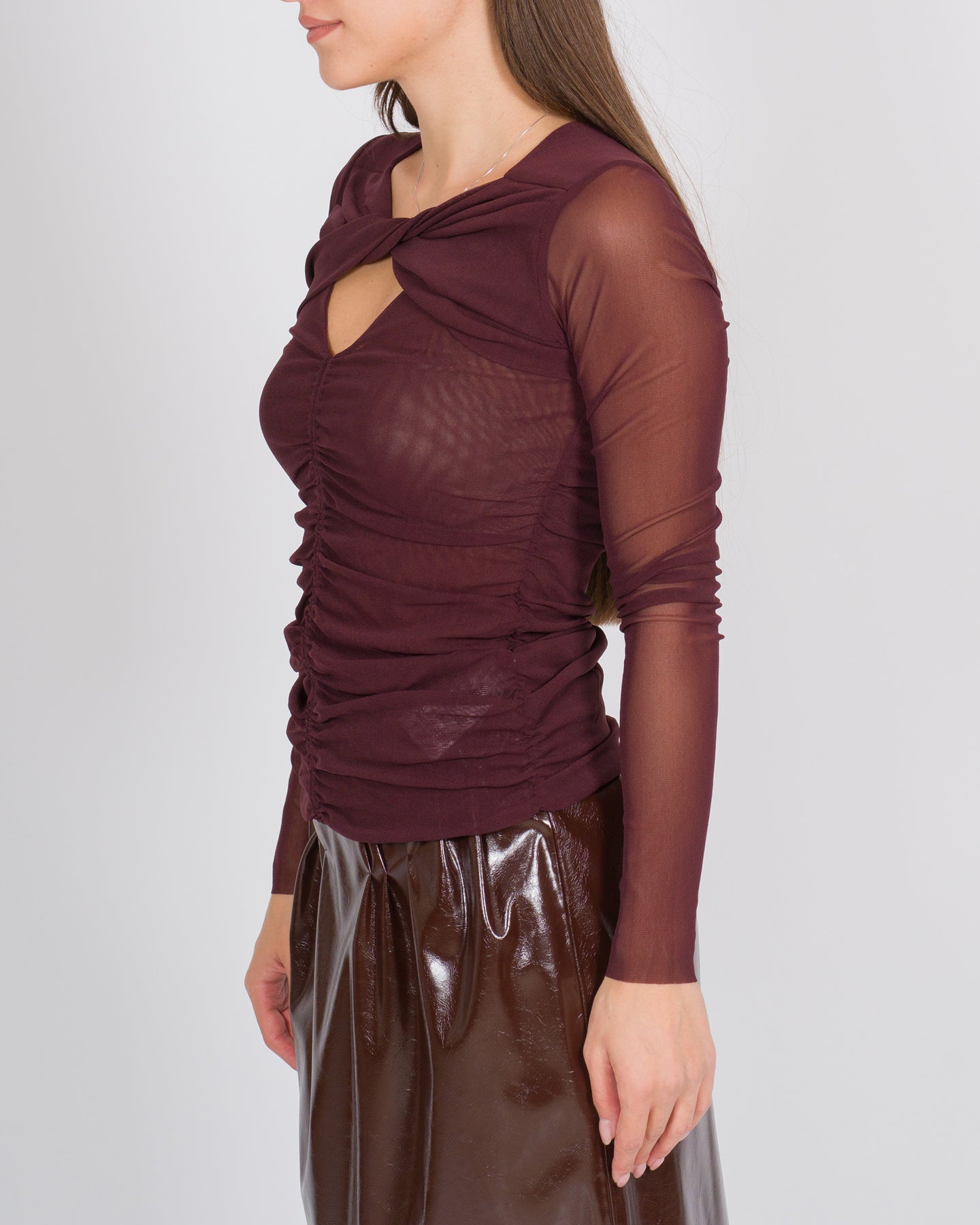T-shirt in chiffon trasparente con scollo arricciato bordeaux