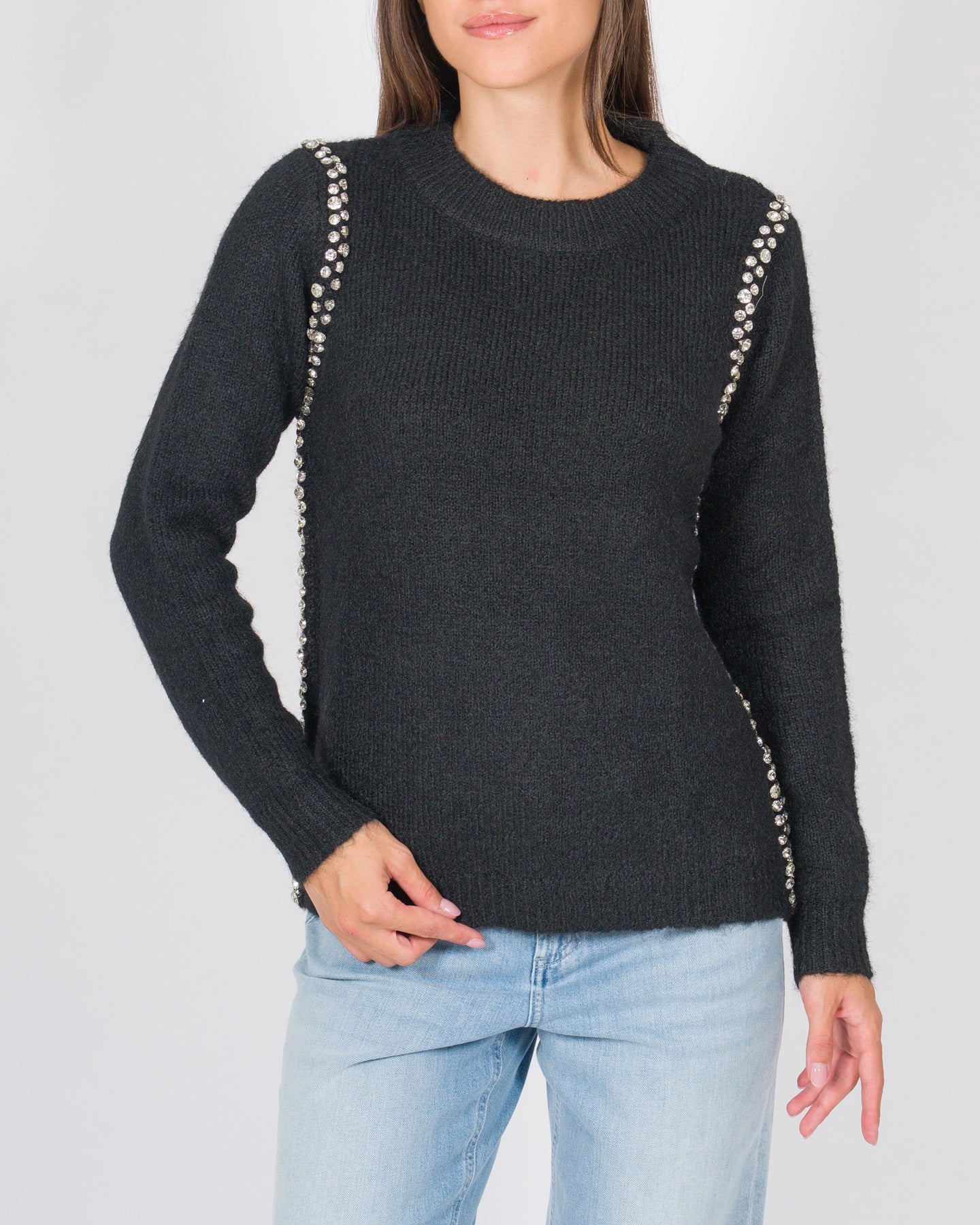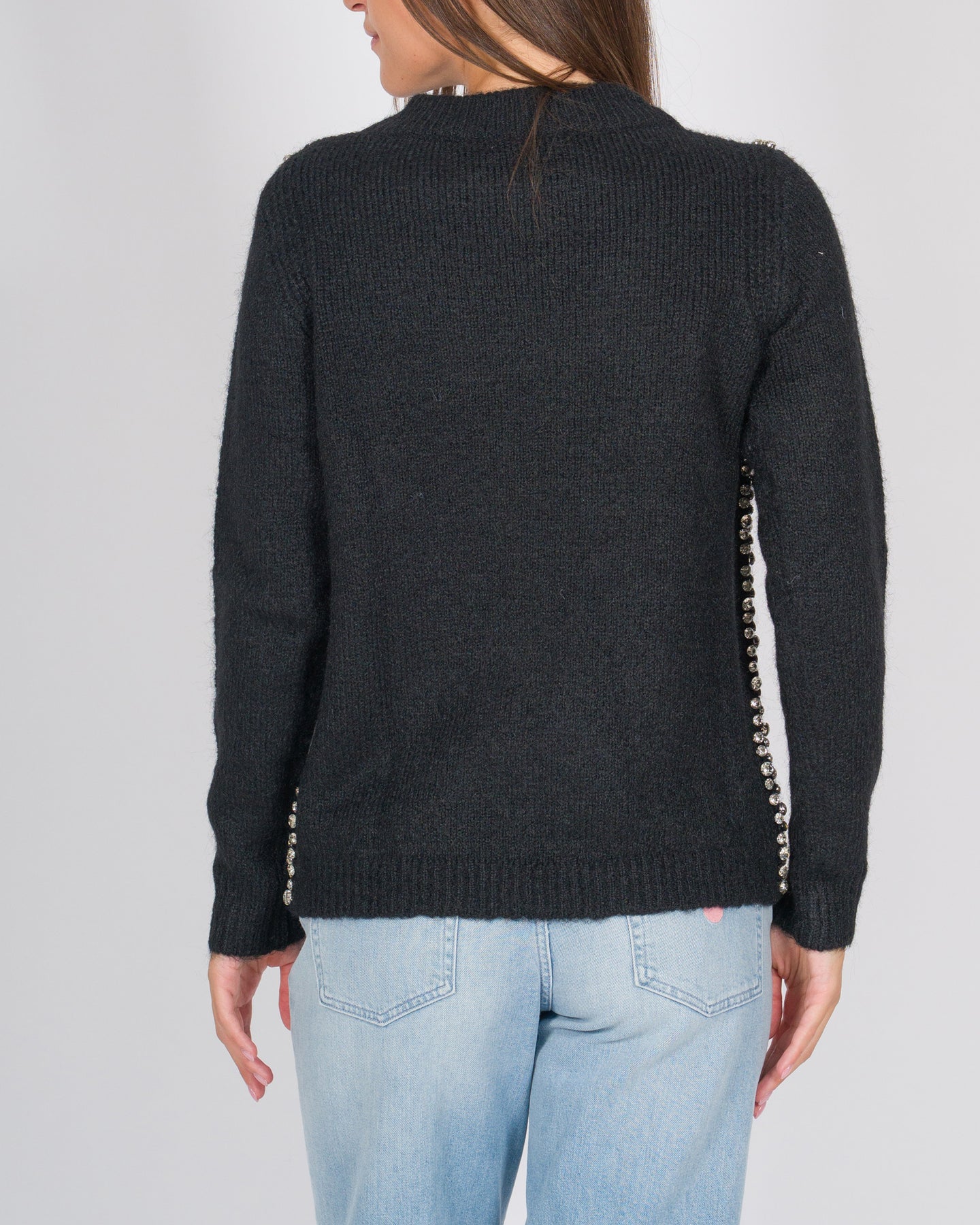 Un capo elegante e sofisticato che arricchisce la maglieria classica con dettagli preziosi. Realizzata in morbida lana, questa maglia a maniche lunghe presenta un girocollo con lavorazione doppia che assicura struttura e comfort. Le applicazioni cabochon sul davanti aggiungono un tocco luminoso e raffinato, trasformando il modello in un pezzo distintivo, perfetto sia per look da giorno chic sia per outfit da sera.Dettagli:Tessuto: lanaColore: biancoGirocollo con collo doppioManiche lungheApplicazioni cabochon sul davantiFondo e polsini rifiniti a costineVestibilità regolare