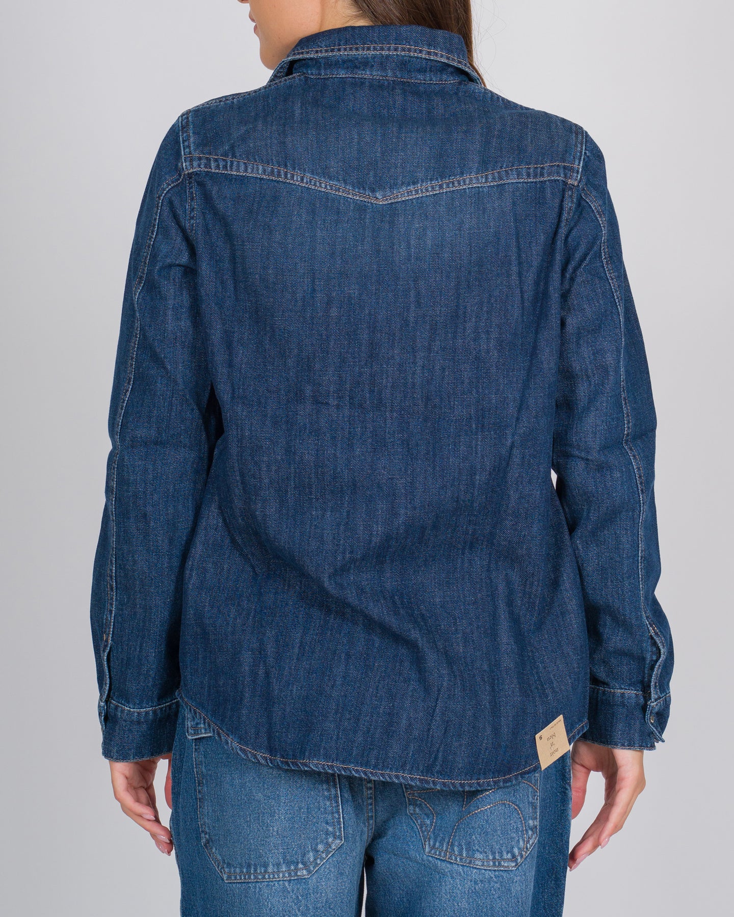 Questa camicia texana in denim intenso combina il fascino del western con linee contemporanee e femminili. Realizzata in cotone di alta qualità o in denim leggero, il tessuto offre morbidezza al tatto e una vestibilità confortevole per l'uso quotidiano.Design & Dettagli:Colletto classico a punta che richiama lo stile western tradizionale.Chiusura frontale con bottoni a pressione in metallo o plastica effetto madreperla, pratici e decorativi.Due tasche applicate sul petto, con pattina e bottone a pressione coordinato, per un look autentico e funzionale.Cuciture tono su tono e finiture precise lungo le maniche e il fondo, che valorizzano la qualità artigianale del capo.