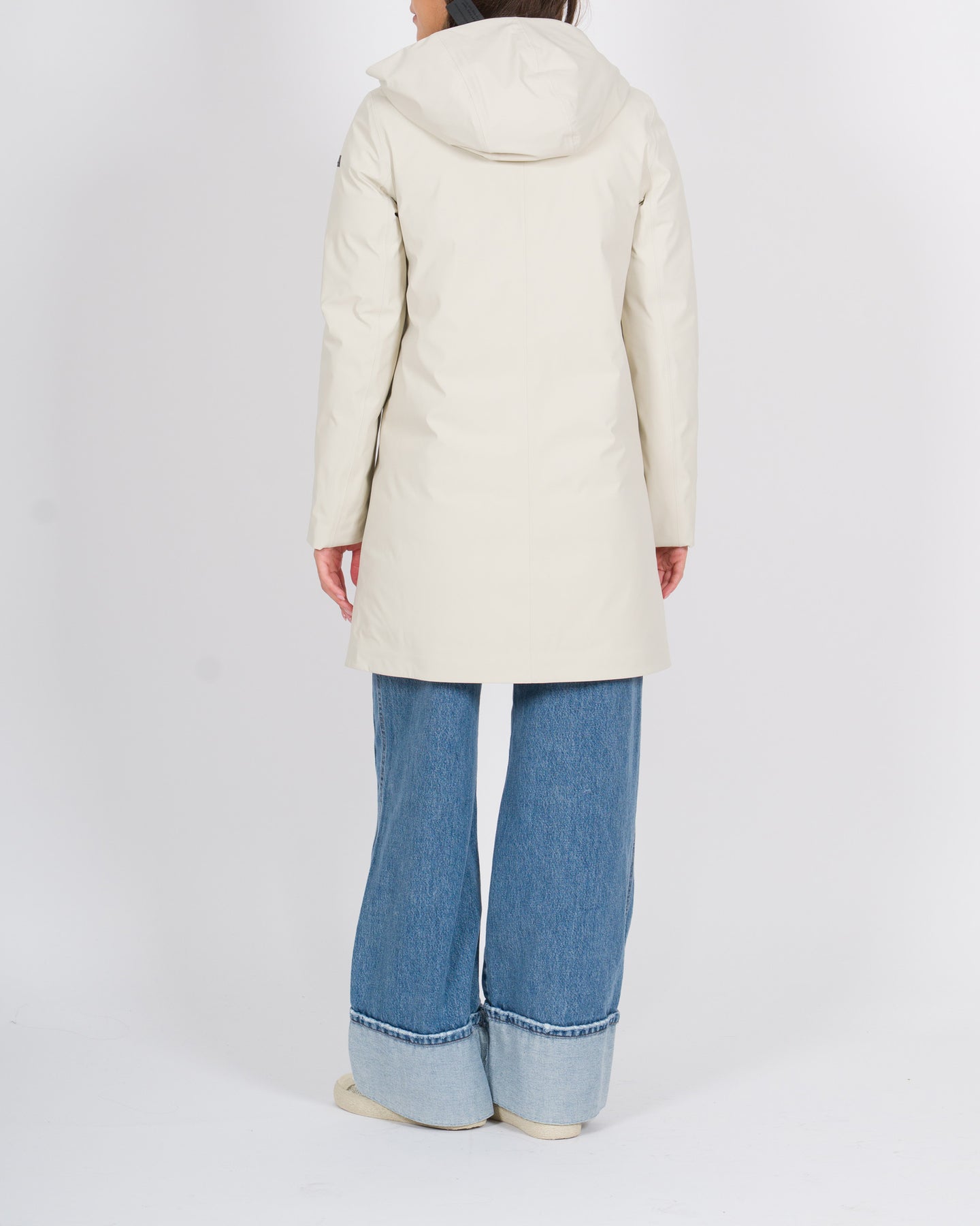 La giacca invernale di lunghezza media si caratterizza per il design funzionale e minimalista, che la rende unica per praticità, isolamento e protezione dal freddo e dalla pioggia. Realizzata in tessuto a membrana impermeabile e traspirante, presenta l'esterno in esclusivo Montecristo dal look opaco e liscio al tatto. L'innovativo sistema floating shield offre un abbraccio di calore dal fit impeccabile, grazie ai canali tubici che contengono l'imbottitura in piuma d'anatra. Il cappuccio, anch'esso imbottito, presenta un design essenziale e raffinato che incornicia delicatamente il viso. Sul davanti, la chiusura a zip è nascosta dalla patta impreziosita dai bottoni a barretta gun metal, che donano un tocco di eleganza contemporanea. Per la sua versatilità, la giacca è ideale nell'aggiungere un twist glam nella creazione di look decisi e distintivi, in abbinamento alla camicia dal taglio maschile e al morbido pantalone palazzo.