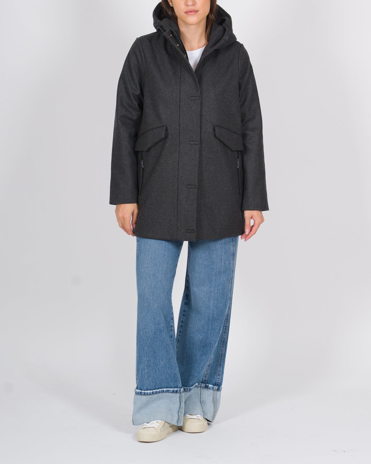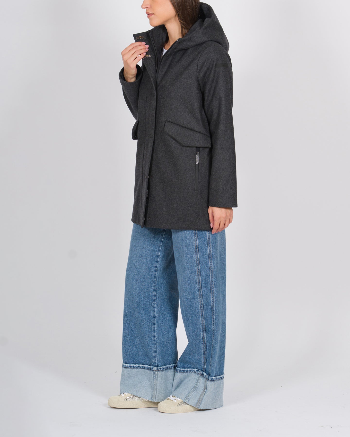 Il capospalla di grande personalità è ideale per la donna che desidera un look raffinato e ricercato sia nella linea, sia nella ricerca dei tessuti. Realizzato in pregiato misto cashmere nella parte frontale, presenta sul retro la texture ininterrotta della morbida imbottitura in piuma d'anatra contenuta nei canali tubici, totalmente privi di impunture. I due diversi tessuti sono accoppiati nel cappuccio ampio e avvolgente, nel creare un gioco di texture di grande effetto visivo. La silhouette del parka è valorizzata dalle tasche verticali con zip termonastrate, sovrastate dalle tasche dal taglio diagonale e chiuse dalla patella. La patta che nasconde la chiusura centrale a zip termonastrata è impreziosita dai bottoni a barretta, che conferiscono un ulteriore tocco di stile al design essenziale. La lunghezza del capo appena sotto i fianchi consente infiniti abbinamenti con i capi della collezione, in particolare con una maglia a collo alto con stampa retrò e un paio di pantaloni a palazzo con texture millerighe dai toni cangianti.