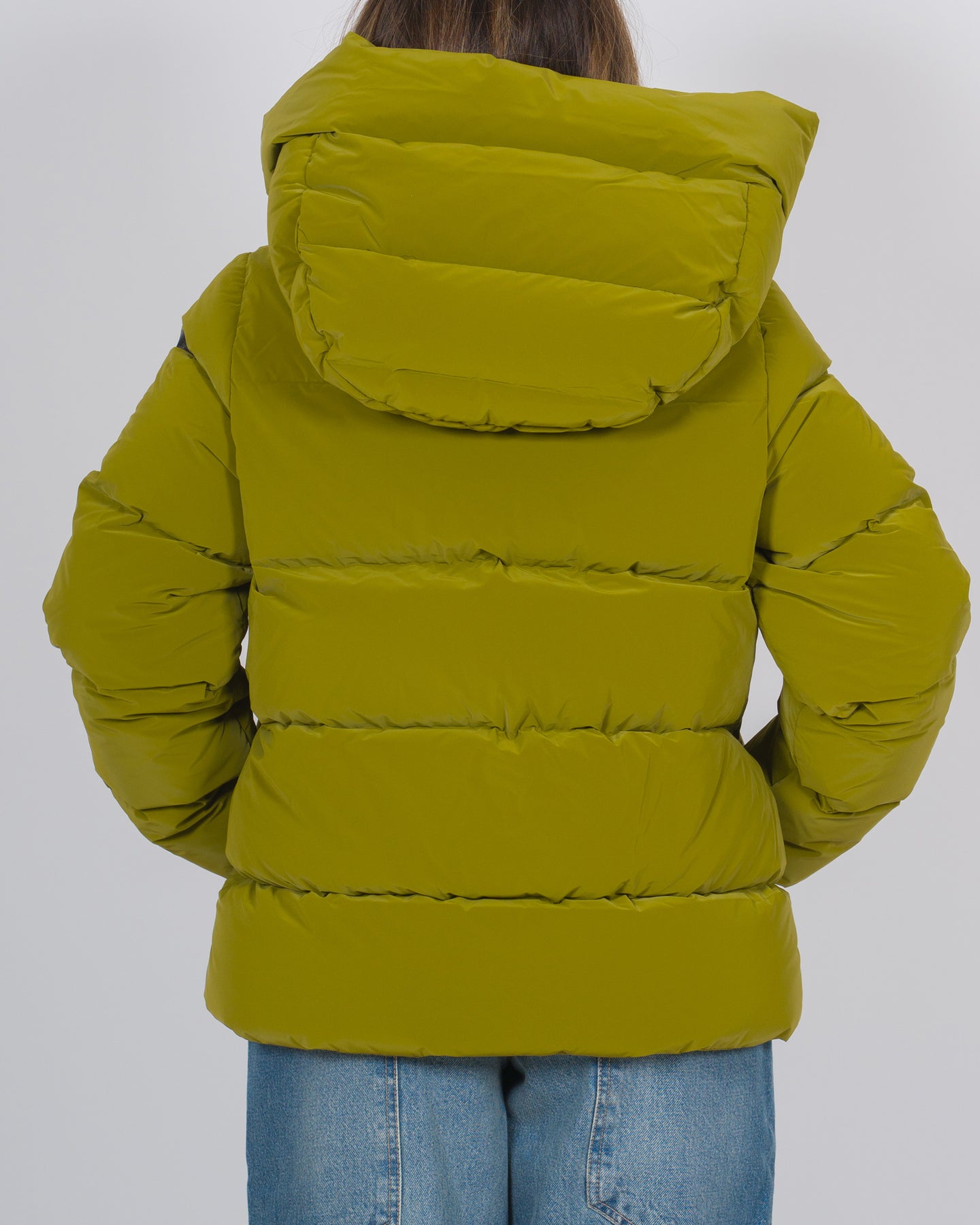 La reinterpretazione moderna e dinamica di un classico del guardaroba invernale si caratterizza per il taglio boxy e l'anima cocoon. Il piumino con lunghezza in vita è impreziosito da un ampio e avvolgente cappuccio. La finitura delicatamente cangiante del tessuto spalmato di silicone e la morbidezza al tatto conferiscono un tocco di comfort e originalità agli ampi canali tubici termosaldati che contengono l'imbottitura in piuma d'anatra 90/10, particolarmente calda e soffice. Il look essenziale del piumino è accentuato dalla patta abbottonata a pressione, che nasconde la zip termonastrata, affiancata dalle spaziose tasche laterali invisibili. Il logo a microiniezione nero sulla manica sinistra firma la creazione che si abbina perfettamente a una camicia dal taglio maschile e al pantalone carrot, nel creare un look frizzante e contemporaneo.