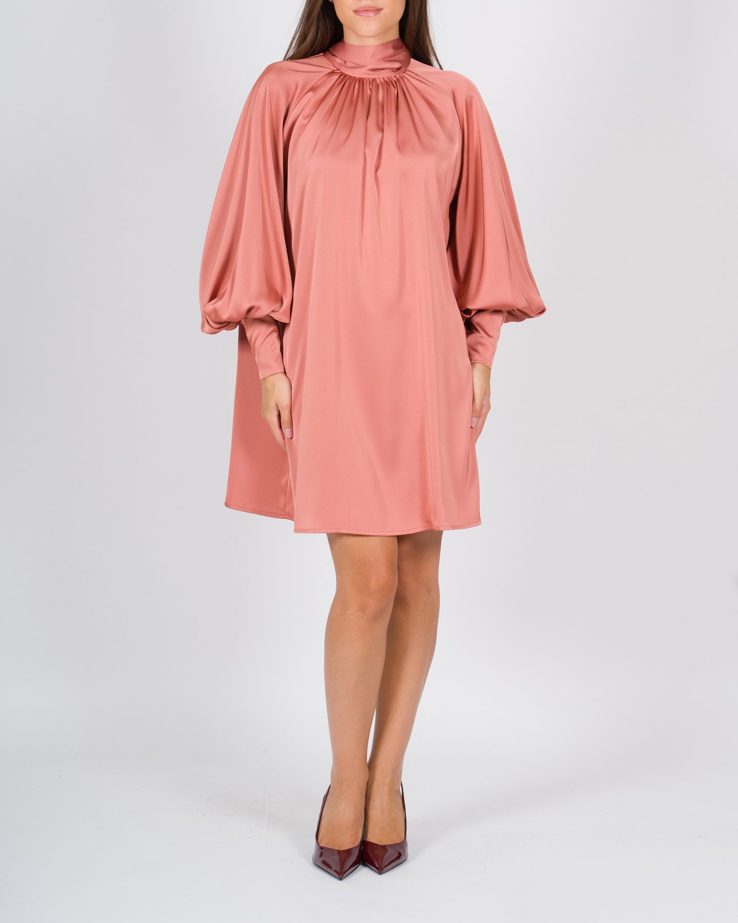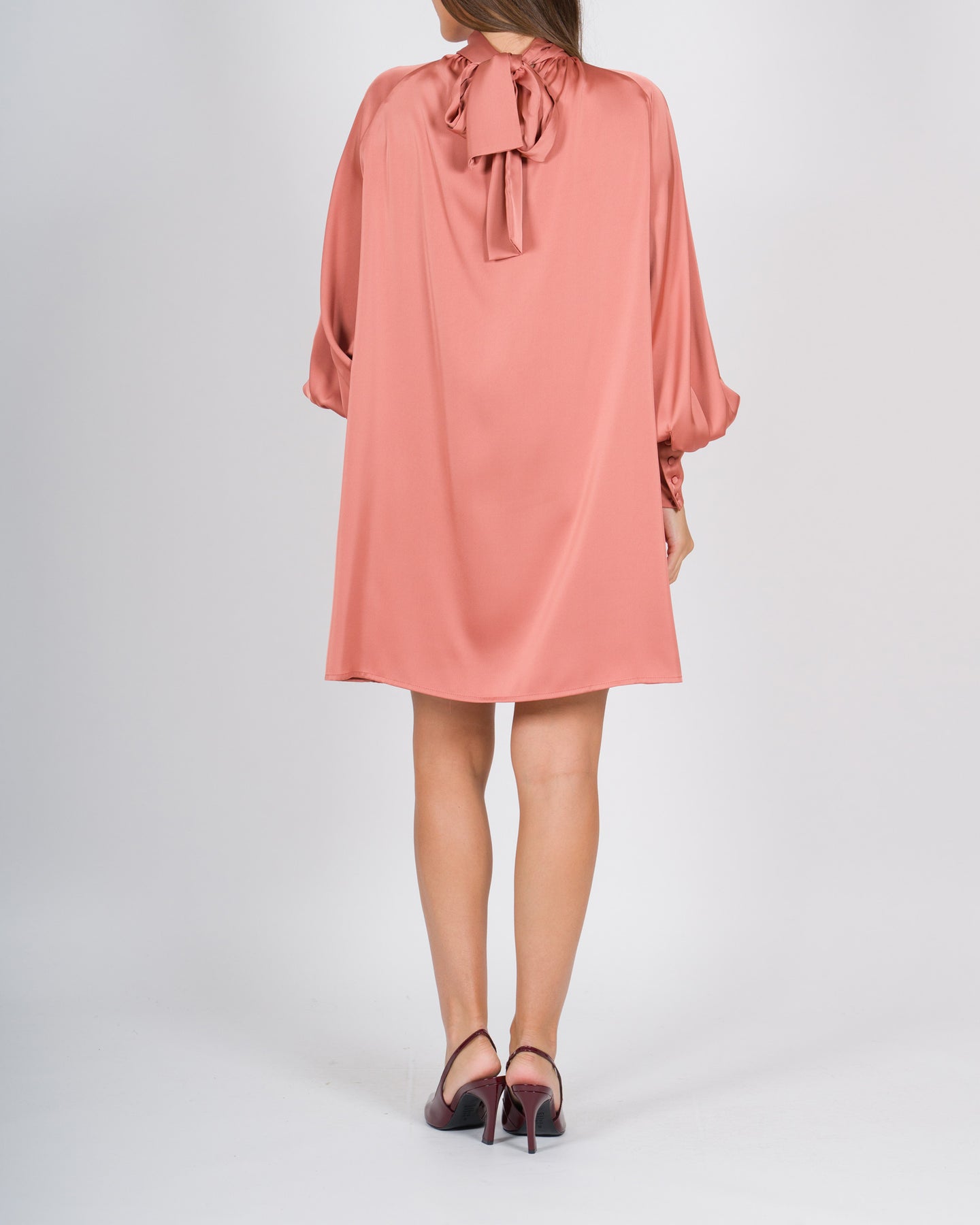 Abito corto in seta lavata colore rosa, elegante e femminile, caratterizzato da maniche a palloncino con polsini rifiniti e da un nodo al collo che dona un dettaglio sofisticato e romantico al capo.Dettagli del capo:Taglio corto, valorizza la silhouette con leggerezzaManiche a palloncino con polsini, per un effetto elegante e morbidoNodo al collo, dettaglio femminile e raffinatoTessuto in seta lavata, morbido, leggero e con un piacevole effetto lucidoColore rosa, delicato e romantico, perfetto per look femminiliPerfetto per occasioni eleganti, cerimonie o eventi speciali, unisce femminilità e stile contemporaneo in un capo di grande impatto.