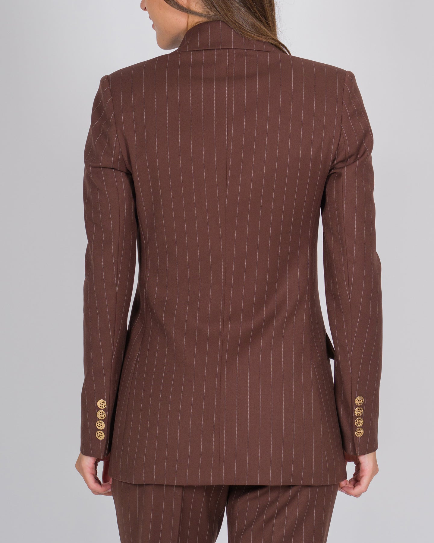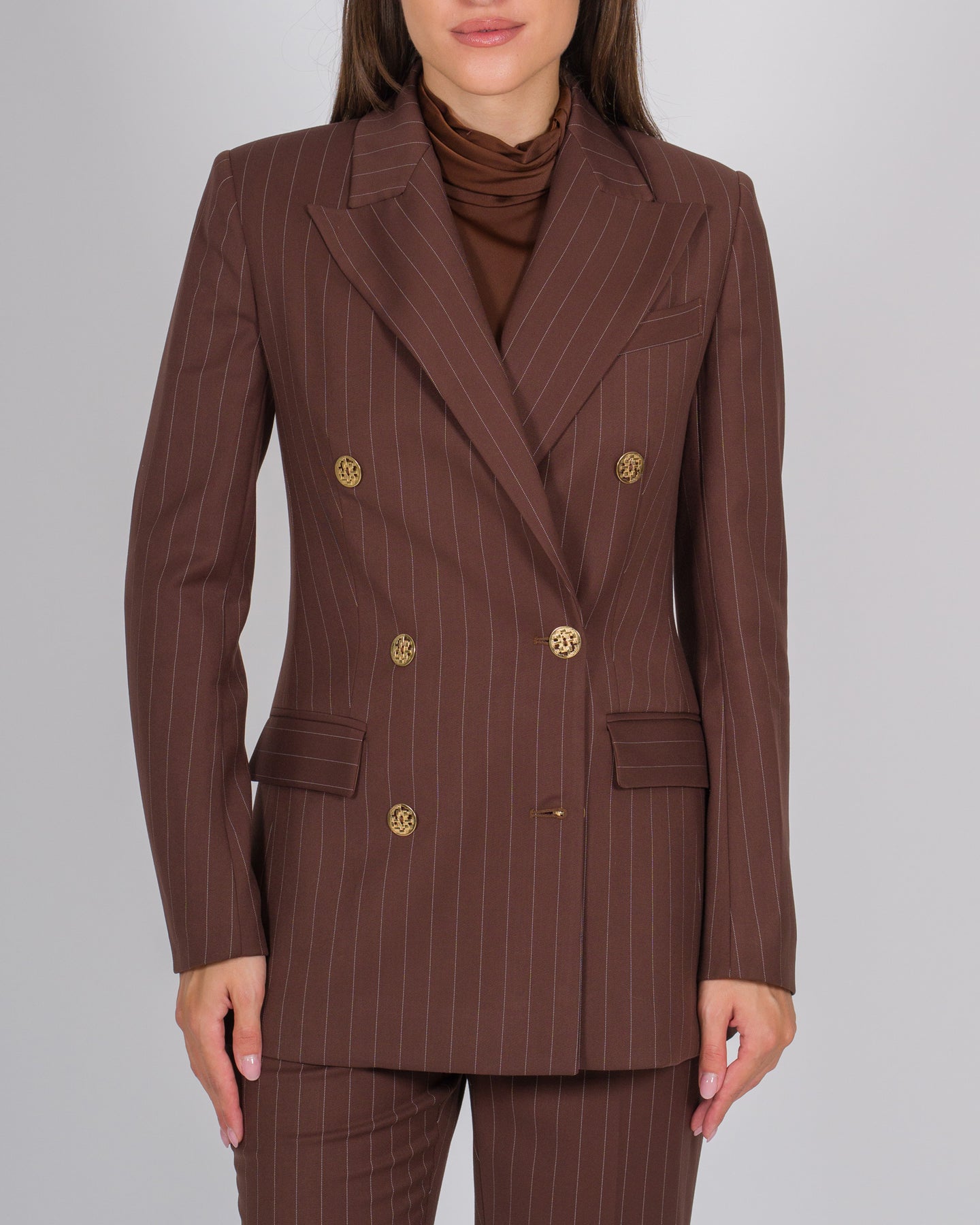 Eleganza sartoriale e contemporaneità si incontrano nel blazer doppio petto di Silence. Realizzato in tessuto gessato marrone, questo capo è caratterizzato da un petto a lancia e da bottoni in oro che aggiungono un dettaglio prezioso e distintivo.La linea strutturata e sofisticata consente di creare un completo coordinato, grazie alla possibilità di abbinare il blazer ai pantaloni dello stesso tessuto, per un look elegante e uniforme, perfetto per occasioni formali o contesti professionali di alto livello.