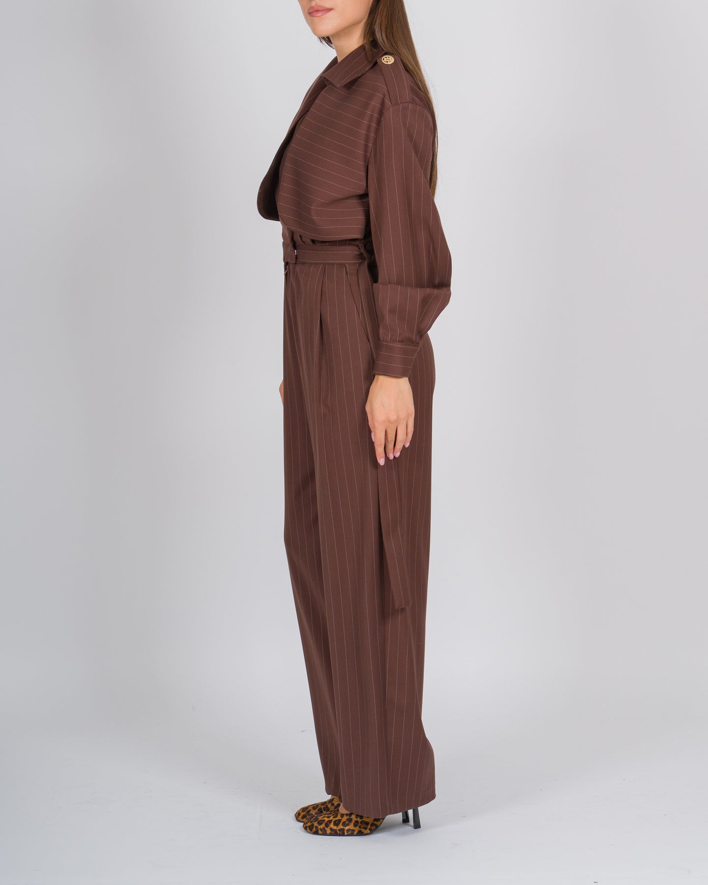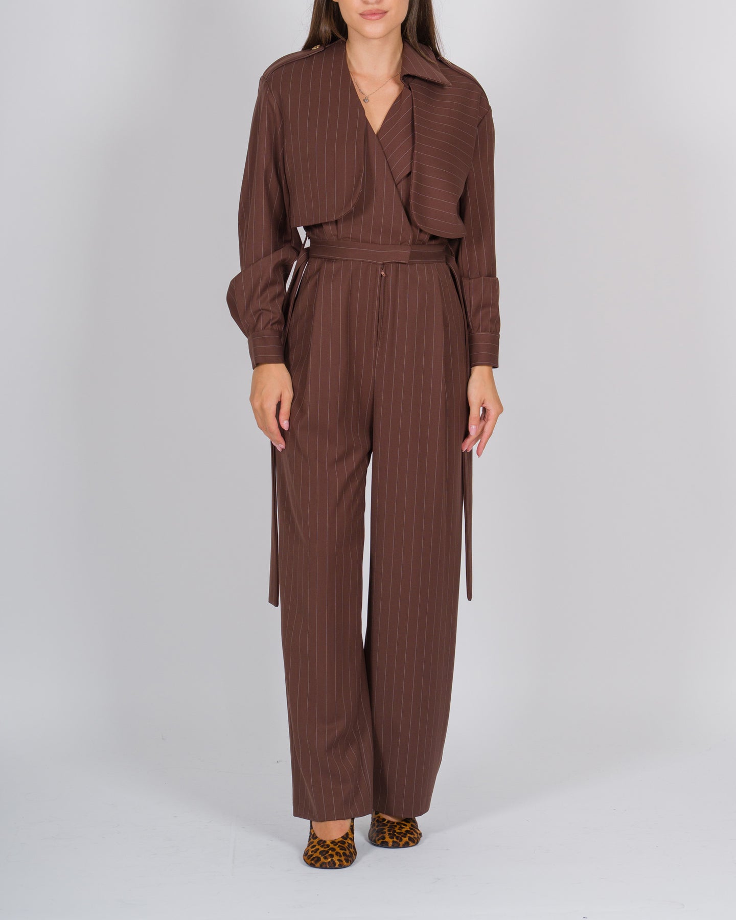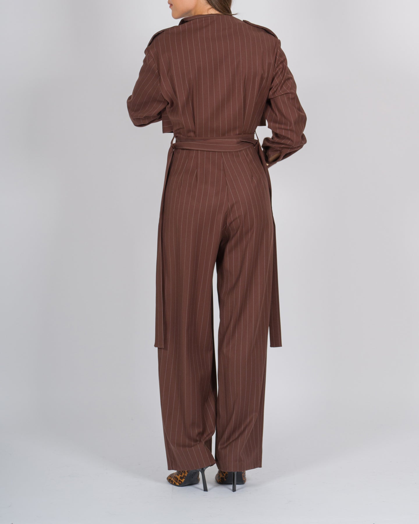 La tuta Silence in tessuto gessato marrone unisce eleganza sartoriale e comfort contemporaneo. La gamba larga e morbida garantisce libertà di movimento, mentre il cinturino in vita valorizza la silhouette con un dettaglio femminile e raffinato.Il design prevede maniche lunghe e un effetto finto giacchino, che dona struttura e raffinatezza al capo, trasformandolo in un completo unico che richiama la precisione sartoriale di un blazer pur mantenendo il comfort di una tuta.Perfetta per outfit da giorno sofisticati o look serali, può essere abbinata a sandali eleganti o sneakers minimaliste, incarnando lo stile contemporaneo e ricercato del marchio Silence.