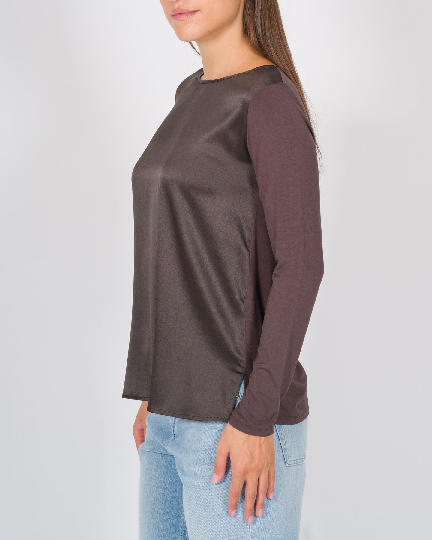 Elegante e raffinata, questa blusa è realizzata con un delicato contrasto di tessuti: seta liscia e luminosa sul davanti per un tocco di classe, mentre viscosa morbida e fluida sul retro e sulle maniche garantisce comfort e vestibilità. Il girocollo pulito e le maniche lunghe la rendono perfetta sia per un look formale che per uno stile casual-chic. Versatile e femminile, è un capo ideale da abbinare a pantaloni sartoriali o jeans.Dettagli tecnici:Tessuto: seta e viscosaColore: moroLa modella indossa la taglia S ed è alta 1.70.