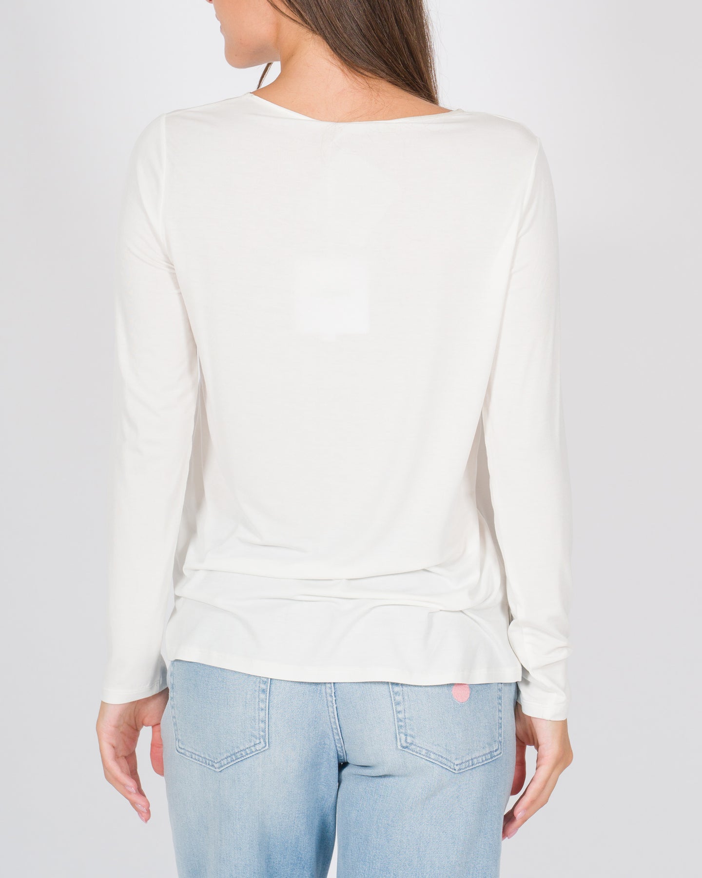 Elegante e raffinata, questa blusa è realizzata con un delicato contrasto di tessuti: seta liscia e luminosa sul davanti per un tocco di classe, mentre viscosa morbida e fluida sul retro e sulle maniche garantisce comfort e vestibilità. Il girocollo pulito e le maniche lunghe la rendono perfetta sia per un look formale che per uno stile casual-chic. Versatile e femminile, è un capo ideale da abbinare a pantaloni sartoriali o jeans.Dettagli tecnici:Tessuto: seta e viscosaColore: pannaLa modella indossa la taglia S ed è alta 1.70.