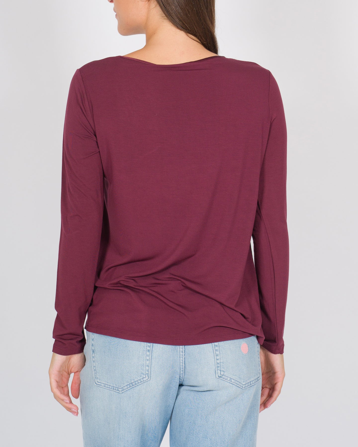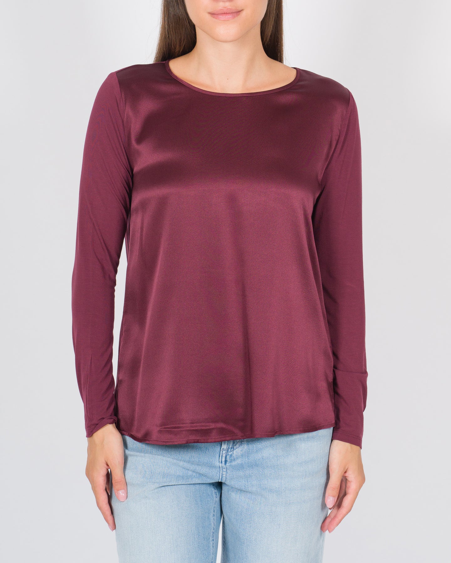 Elegante e raffinata, questa blusa è realizzata con un delicato contrasto di tessuti: seta liscia e luminosa sul davanti per un tocco di classe, mentre viscosa morbida e fluida sul retro e sulle maniche garantisce comfort e vestibilità. Il girocollo pulito e le maniche lunghe la rendono perfetta sia per un look formale che per uno stile casual-chic. Versatile e femminile, è un capo ideale da abbinare a pantaloni sartoriali o jeans.Dettagli tecnici:Tessuto: seta e viscosaColore: vinoLa modella indossa la taglia S ed è alta 1.70.