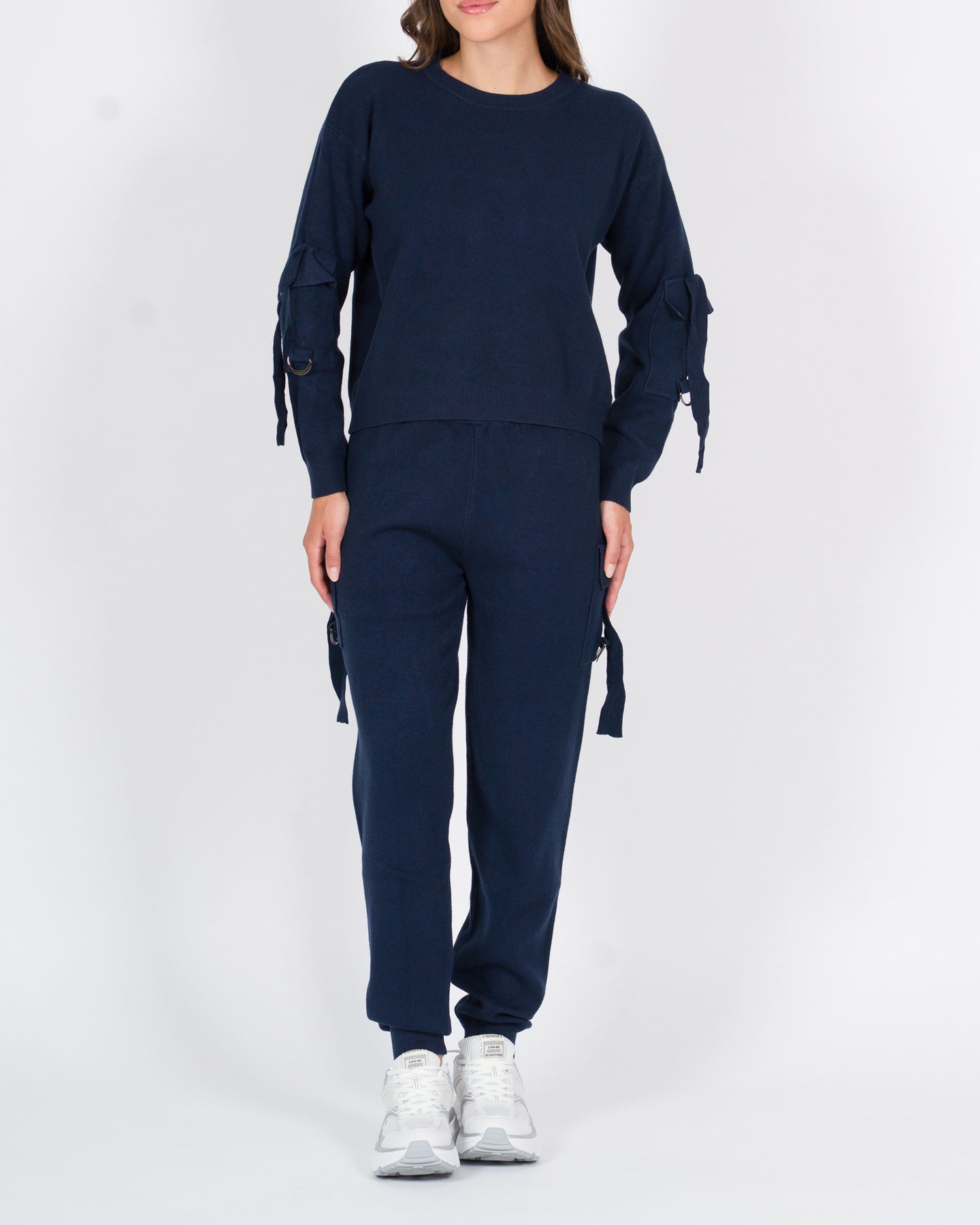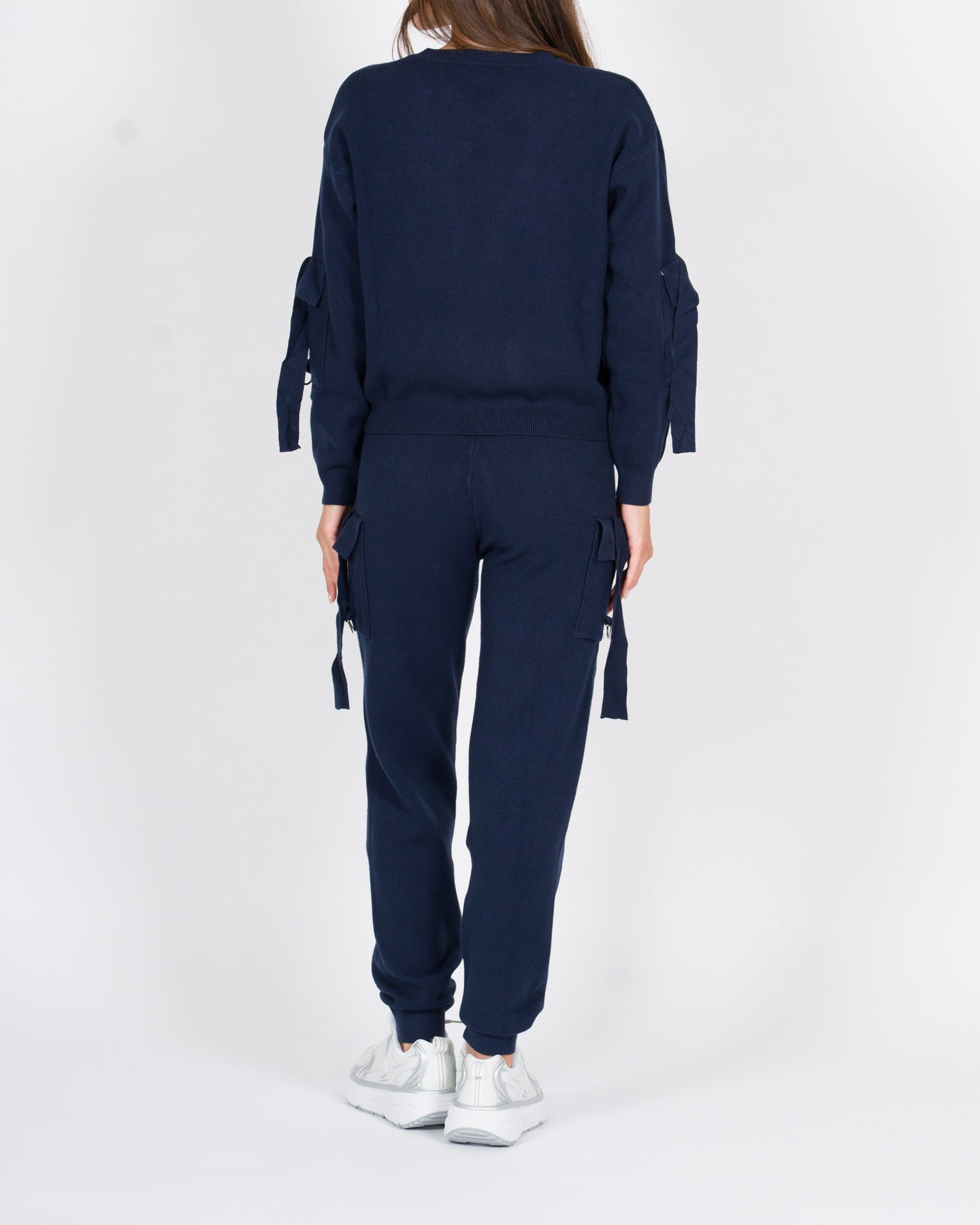 Completo coordinato in morbido tessuto di viscosa, composto da maglia a manica lunga e pantalone dal taglio rilassato, perfetto per un look moderno e ricercato.La maglia presenta un design originale con lacci decorativi lungo le braccia, che aggiungono un tocco grintoso e femminile. Il pantalone è caratterizzato da lacci regolabili sulle gambe e polsini al fondo, che donano struttura e movimento al capo.Un outfit versatile, comodo ma d'impatto, ideale sia per il tempo libero che per occasioni più urban-chic.Dettagli tecnici:Tessuto: viscosaLacci su maglia e pantaloniColore: bluLa modella indossa la taglia S/M ed è alta 1.70